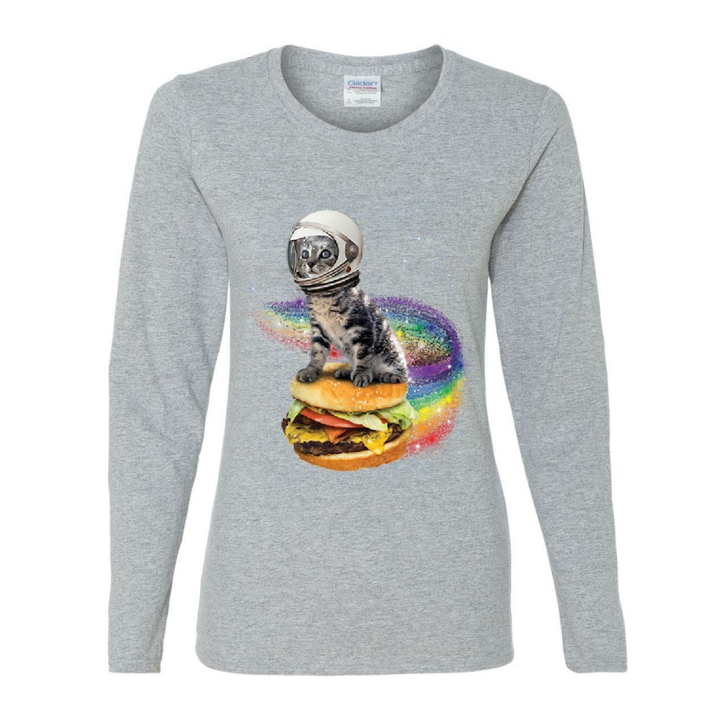 CAT FLYING A RAINBOW BURGER women's long sleeve tee funny astronaut kitten space gray