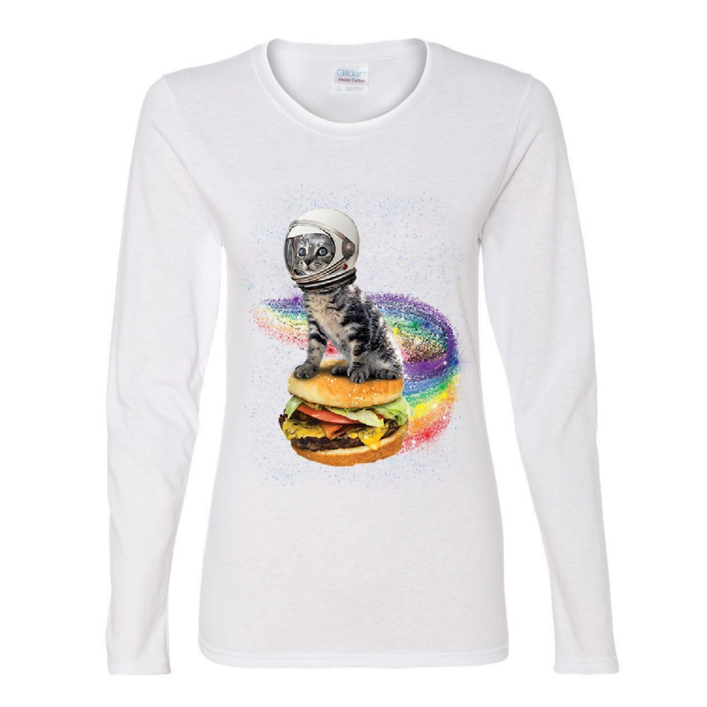 CAT FLYING A RAINBOW BURGER women's long sleeve tee funny astronaut kitten space white