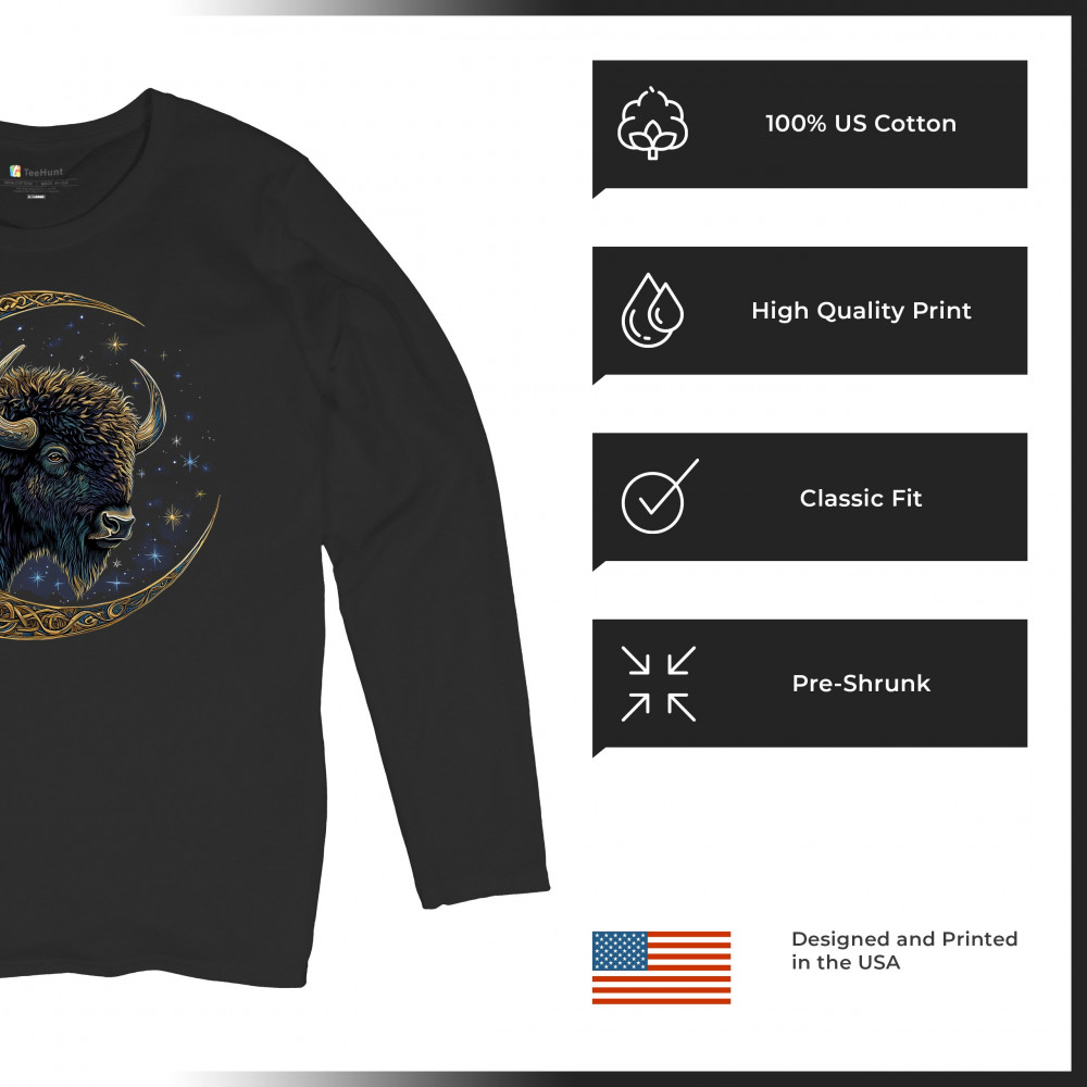 Celebrate strength, balance, and cosmic beauty with this powerful bison design. Framed by a Celtic crescent moon and surrounded by stars, the artwork merges tribal symbolism, animal energy, and nature’s majesty. A perfect choice for spiritual seekers, art lovers, stargazers, and fans of ancient folklore and cosmic connection.