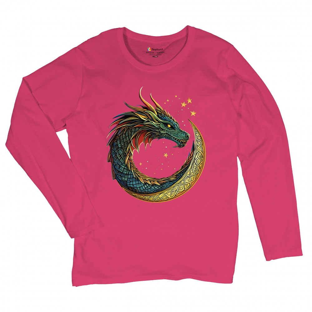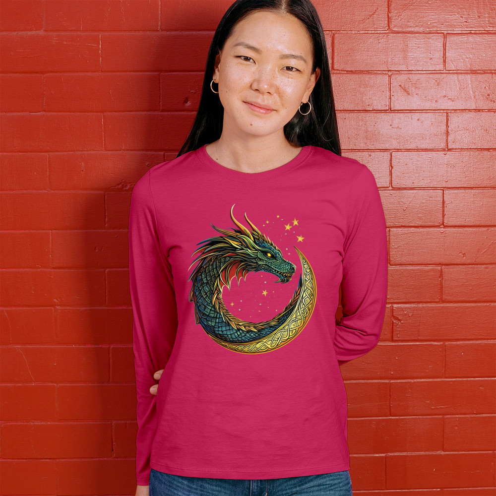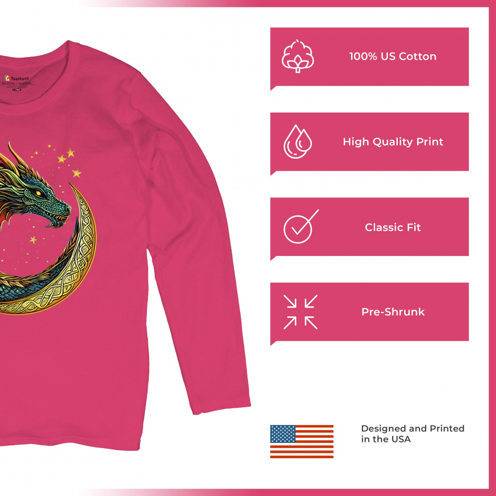 Fierce dragon in Celtic crescent moon with glowing eyes and starry sky. Perfect for fantasy fans, gamers, and spiritual warriors seeking mythic art.