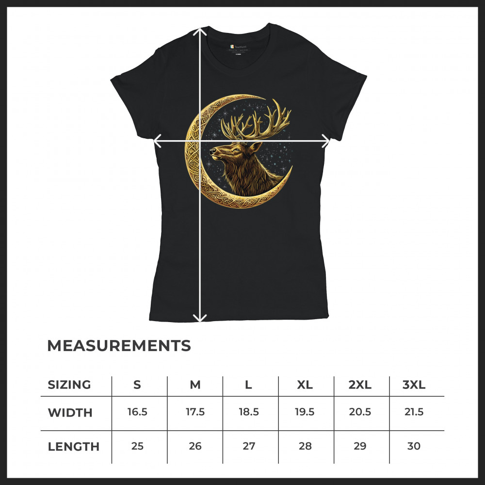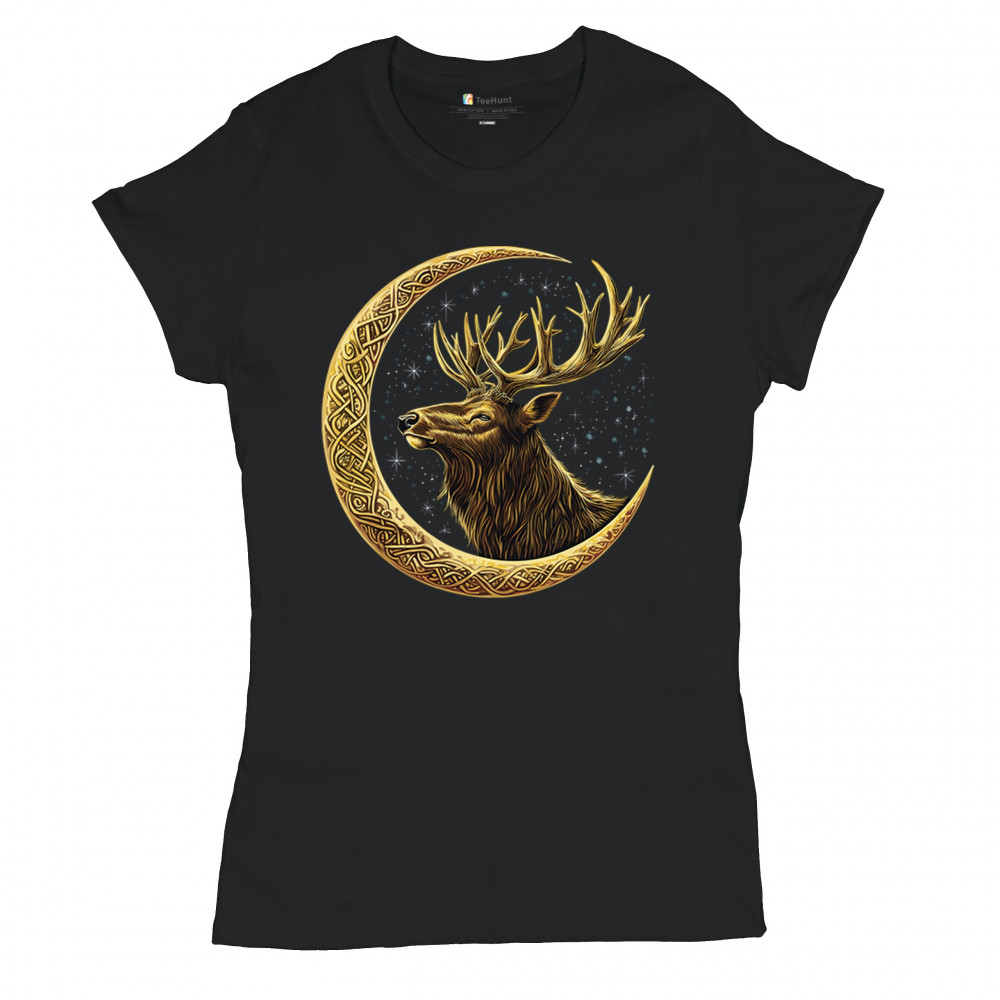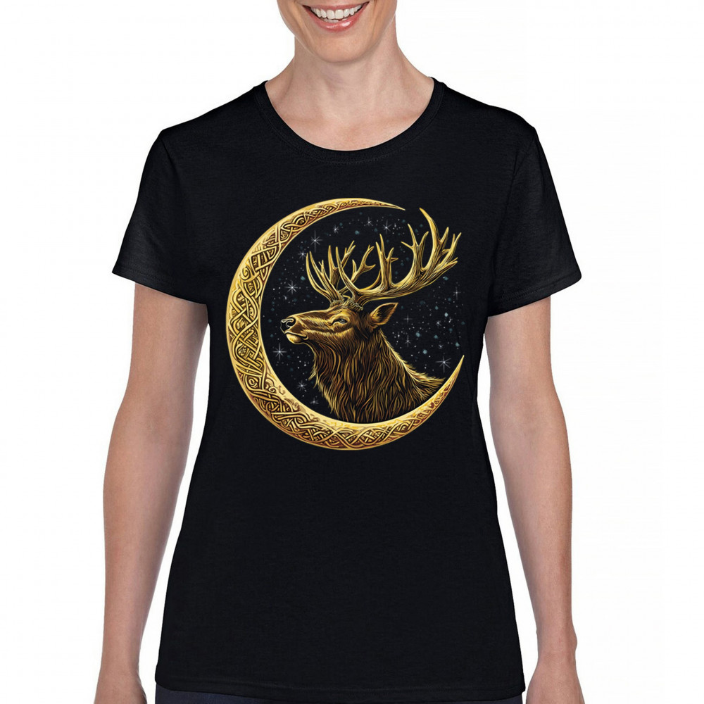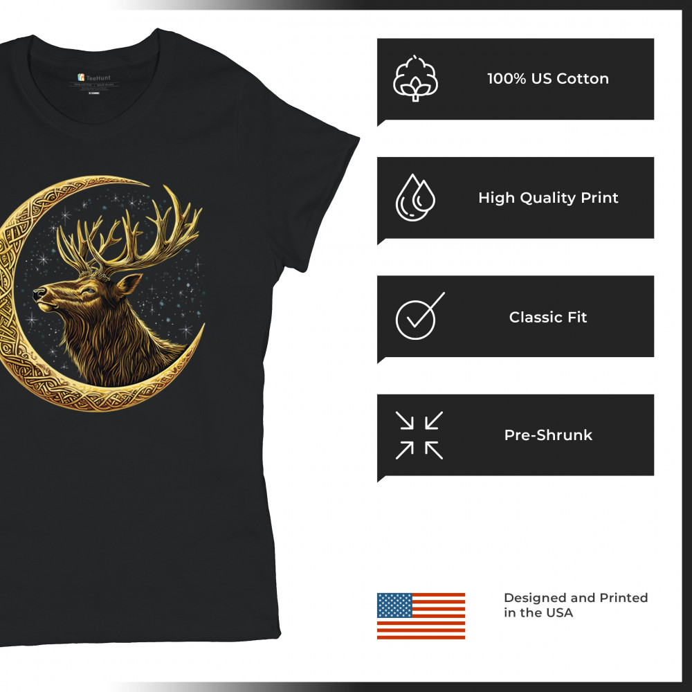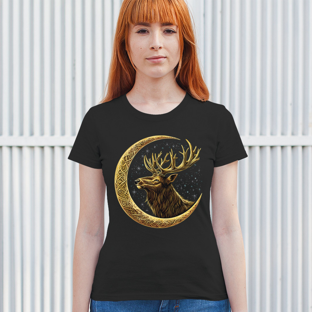 Celtic stag design with golden moon and cosmic stars. Symbolizes forest strength, leadership, and spiritual energy. Perfect for nature lovers.