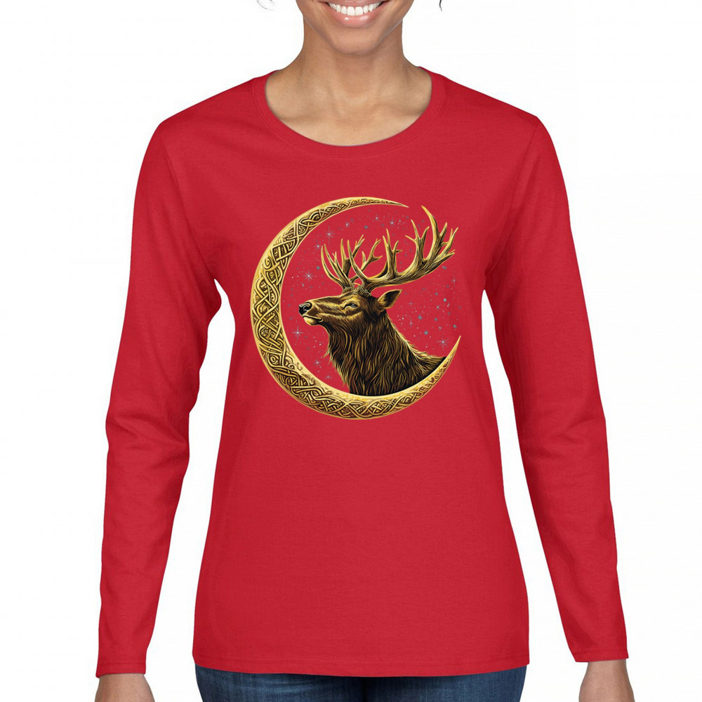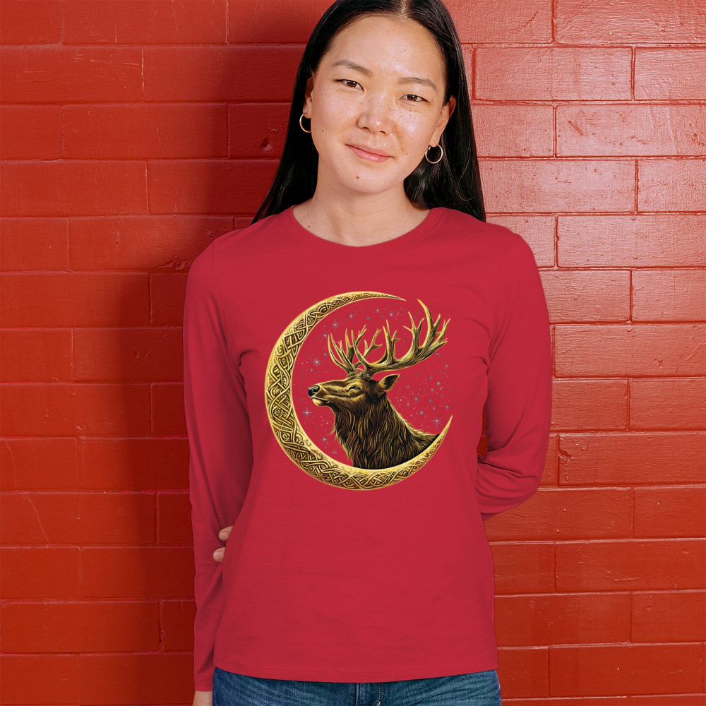Celtic stag design with golden moon and cosmic stars. Symbolizes forest strength, leadership, and spiritual energy. Perfect for nature lovers.