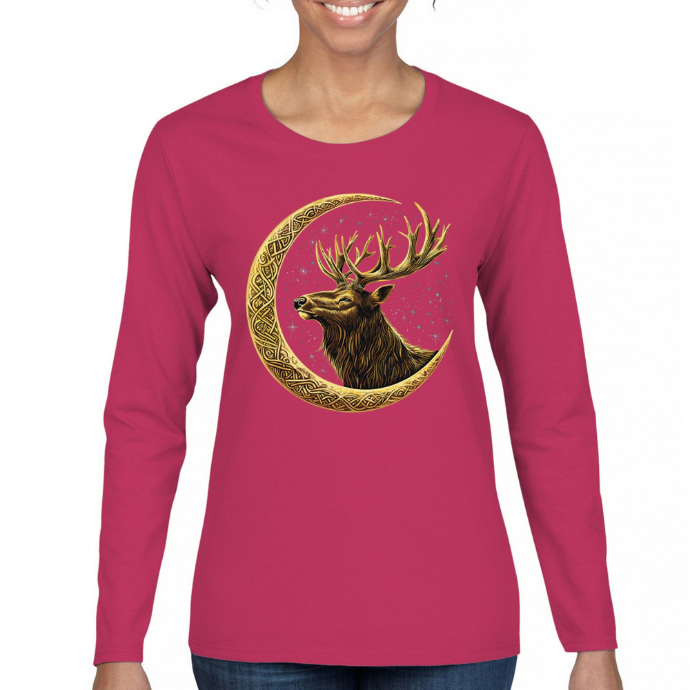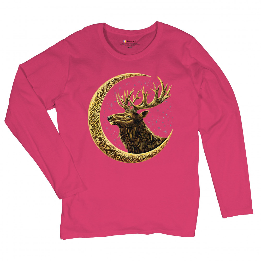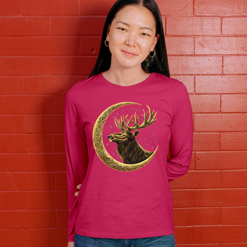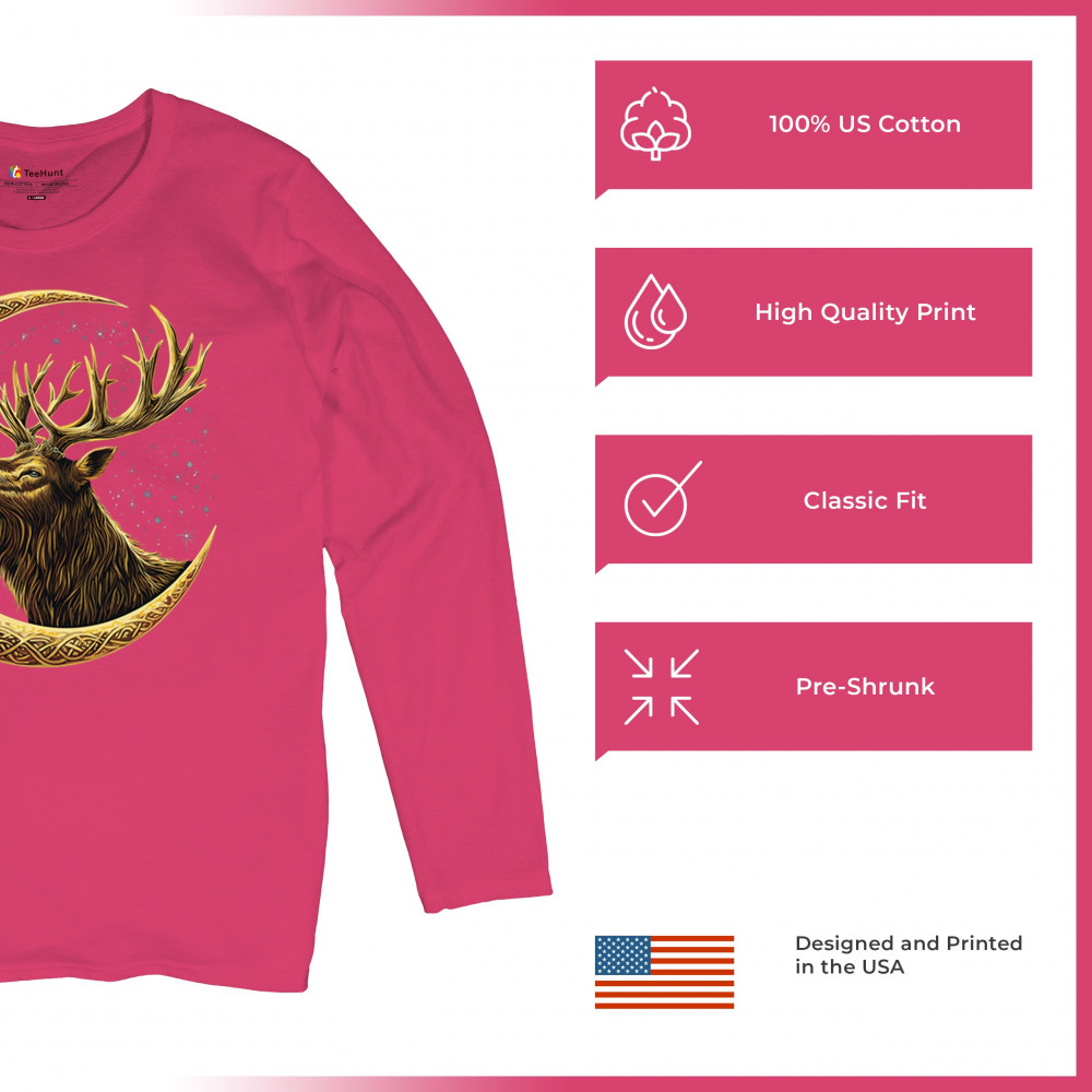 Celtic stag design with golden moon and cosmic stars. Symbolizes forest strength, leadership, and spiritual energy. Perfect for nature lovers.