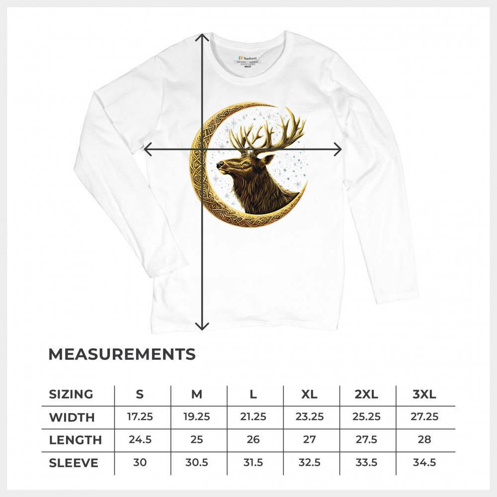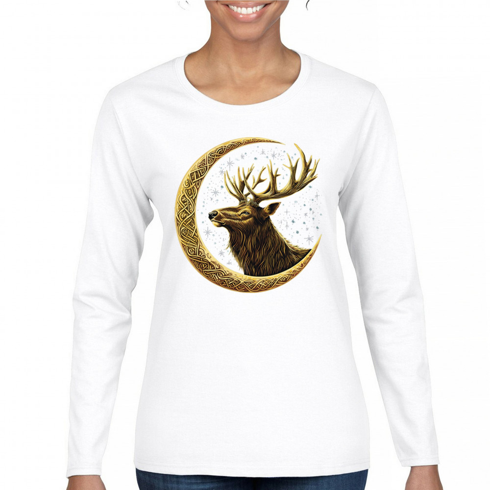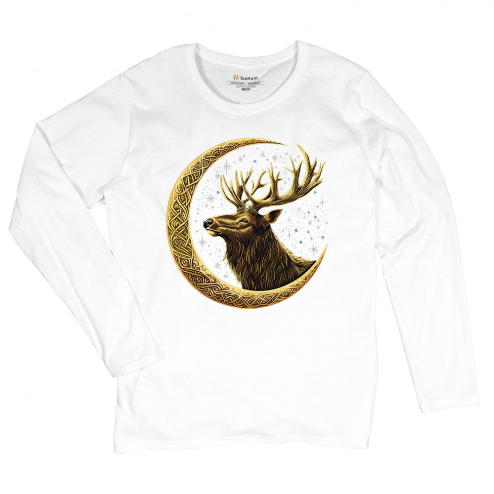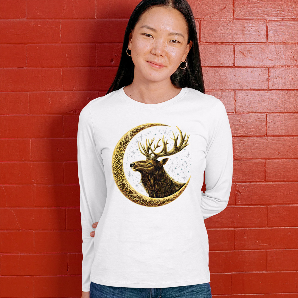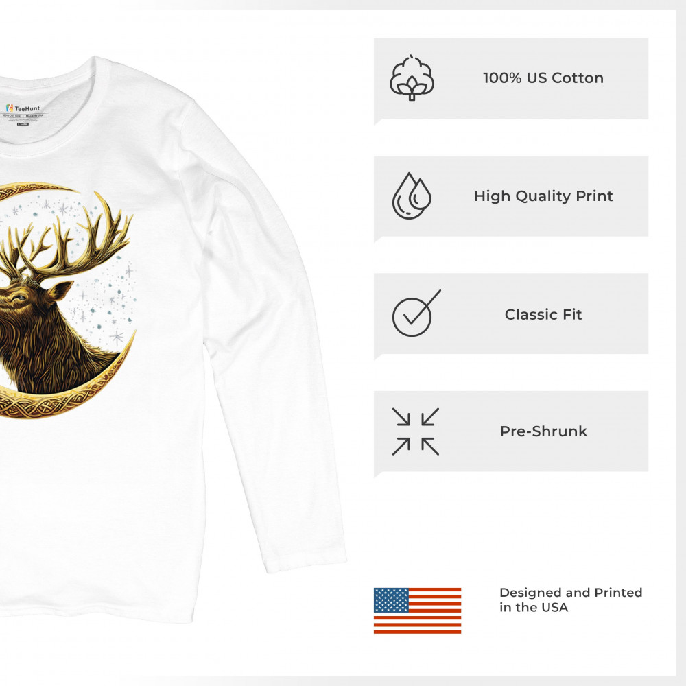 Celtic stag design with golden moon and cosmic stars. Symbolizes forest strength, leadership, and spiritual energy. Perfect for nature lovers.