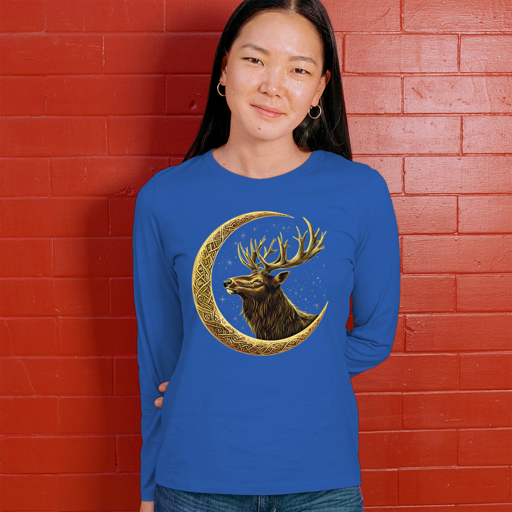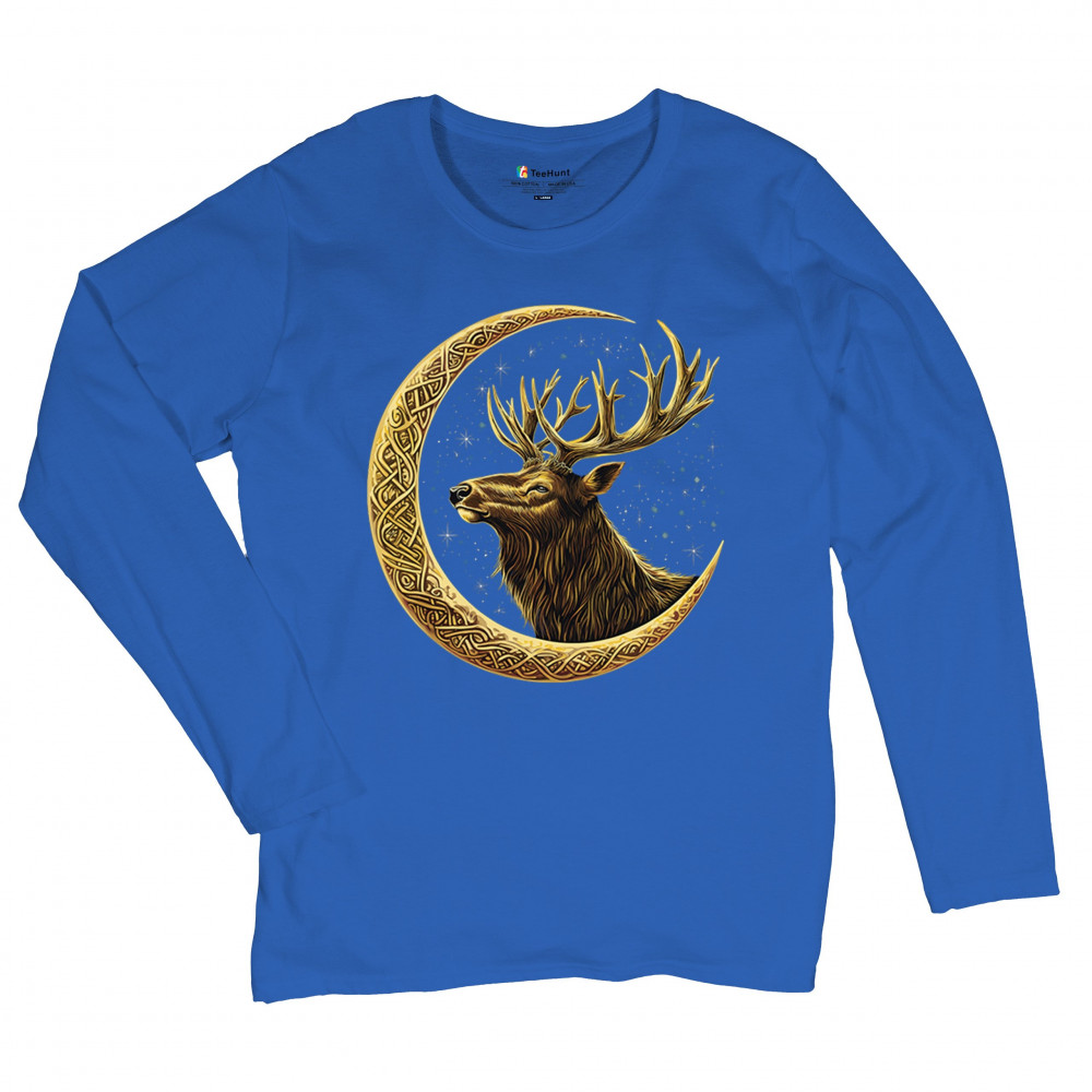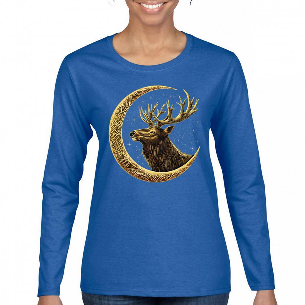Celtic stag design with golden moon and cosmic stars. Symbolizes forest strength, leadership, and spiritual energy. Perfect for nature lovers.
