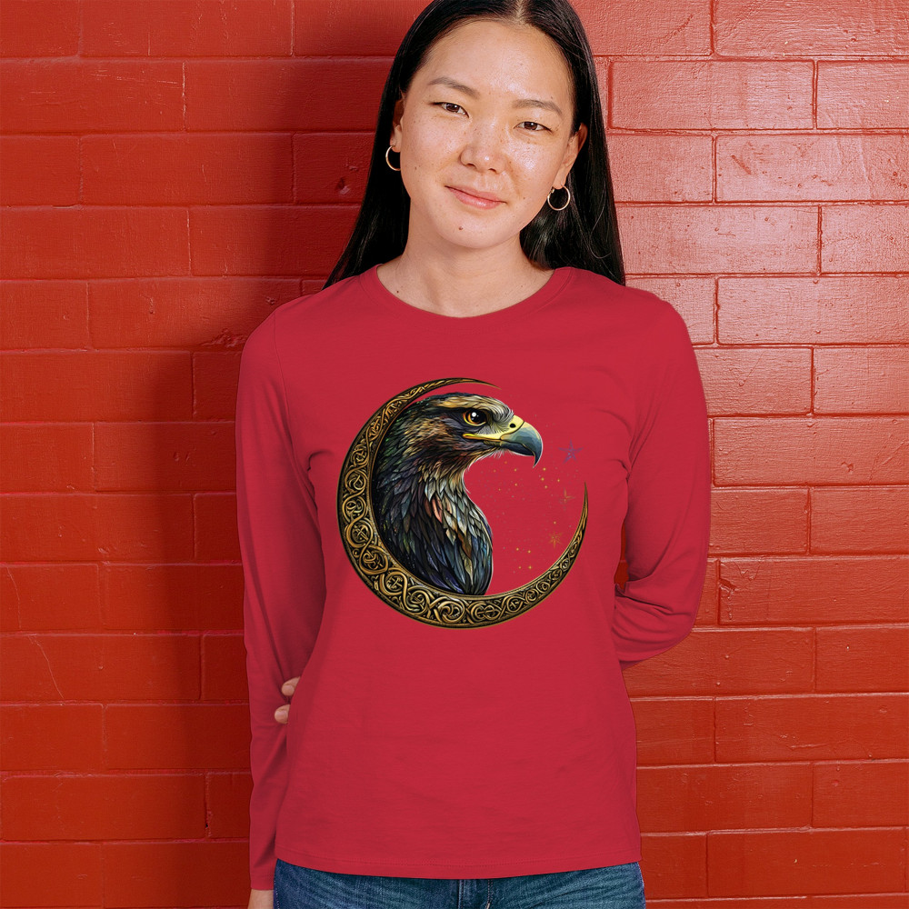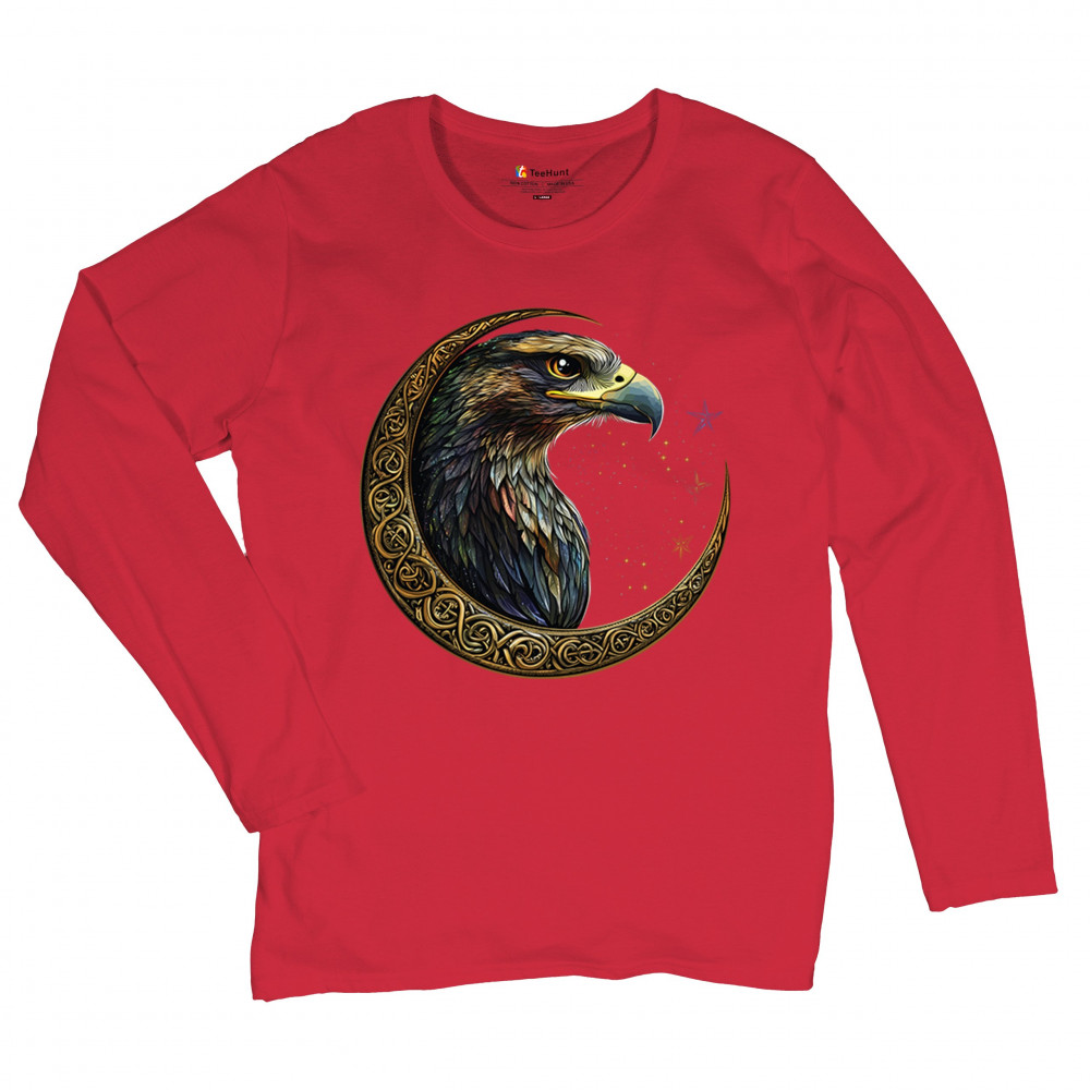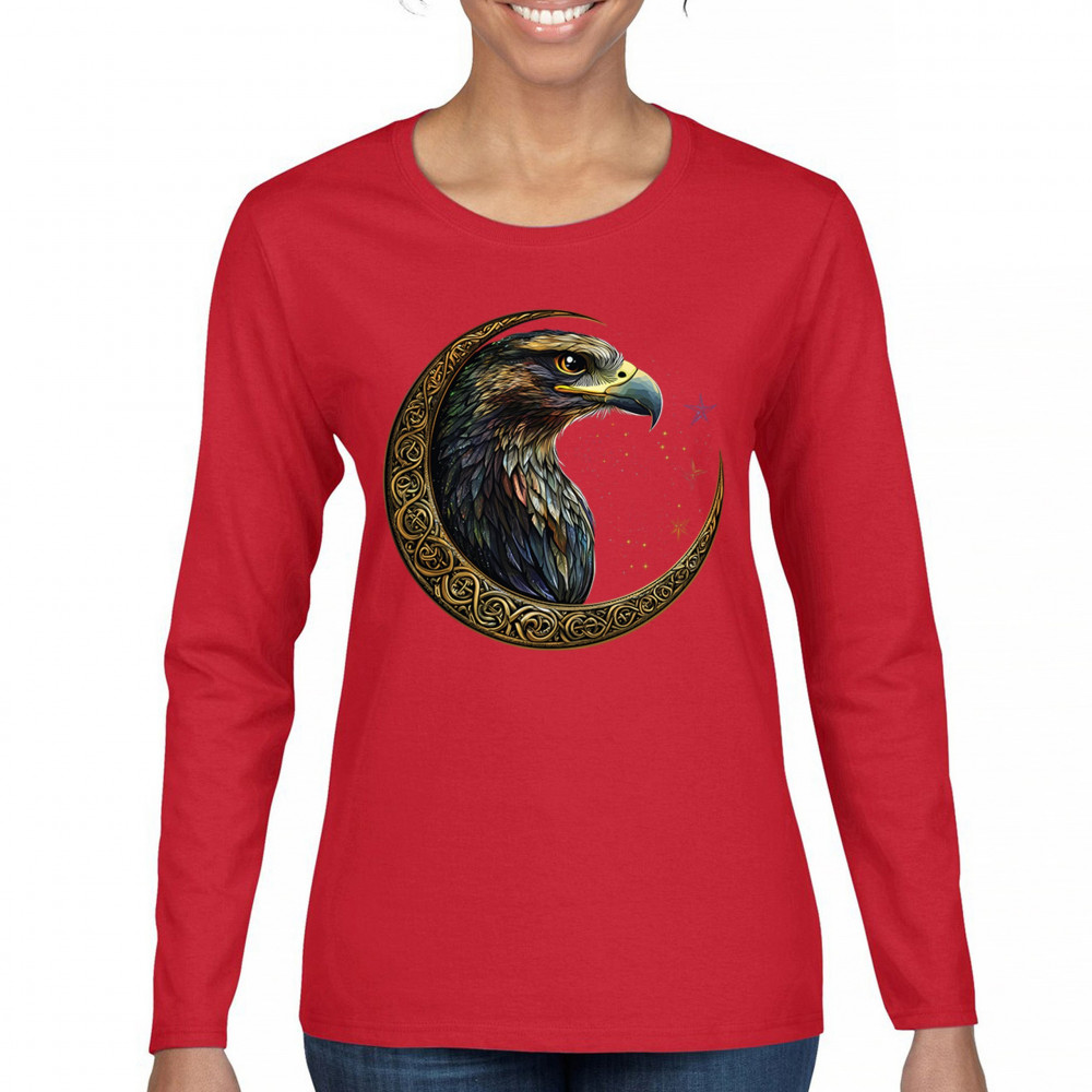 A beautifully detailed eagle with vibrant feathers is framed by a golden Celtic crescent moon and surrounded by a starry cosmic sky. This striking design represents freedom, spiritual power, and the mystery of the skies. Perfect for patriots, bird lovers, and those who connect with nature, tribal symbolism, and celestial art.