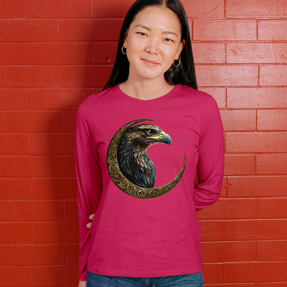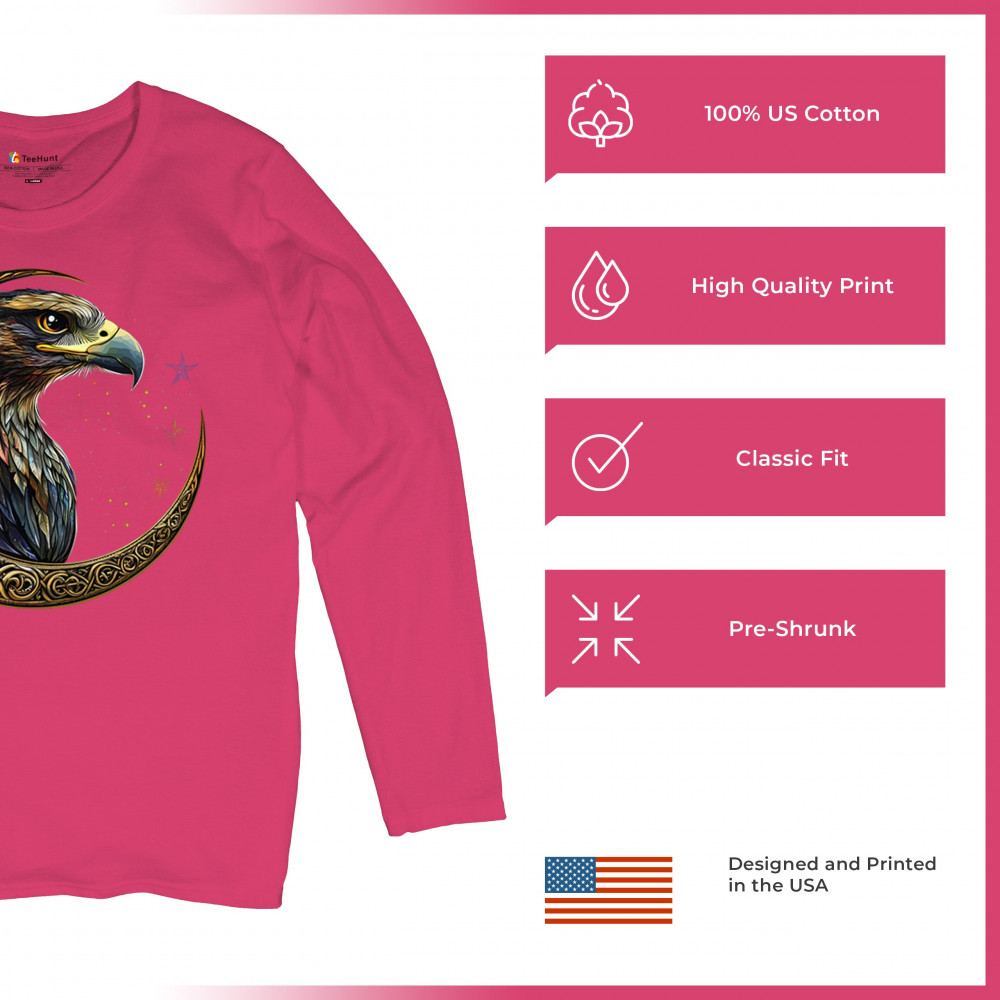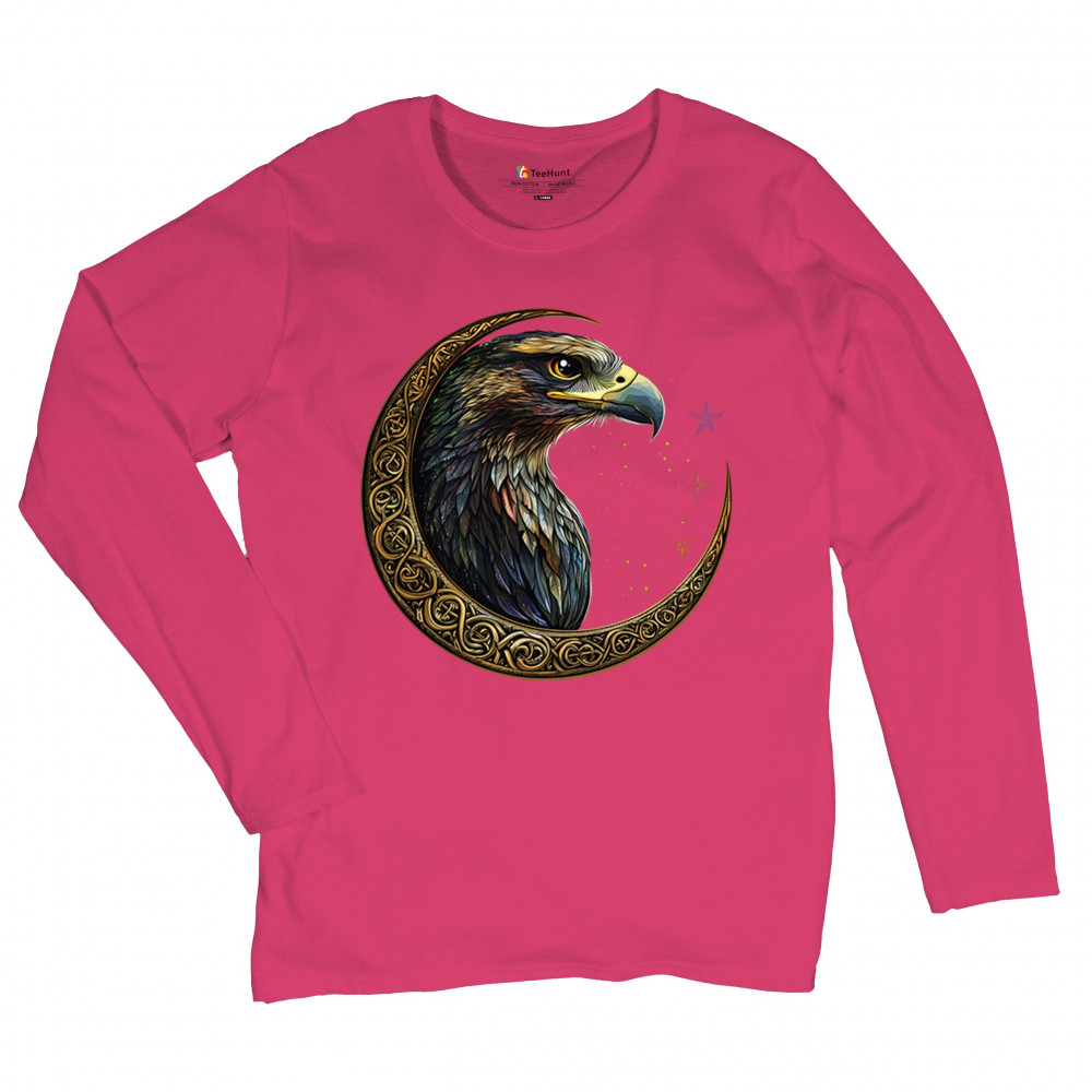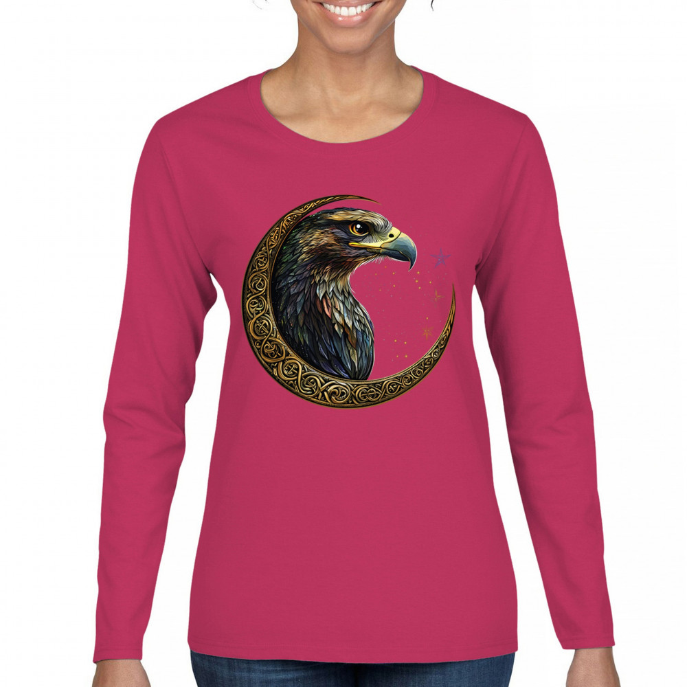 A beautifully detailed eagle with vibrant feathers is framed by a golden Celtic crescent moon and surrounded by a starry cosmic sky. This striking design represents freedom, spiritual power, and the mystery of the skies. Perfect for patriots, bird lovers, and those who connect with nature, tribal symbolism, and celestial art.