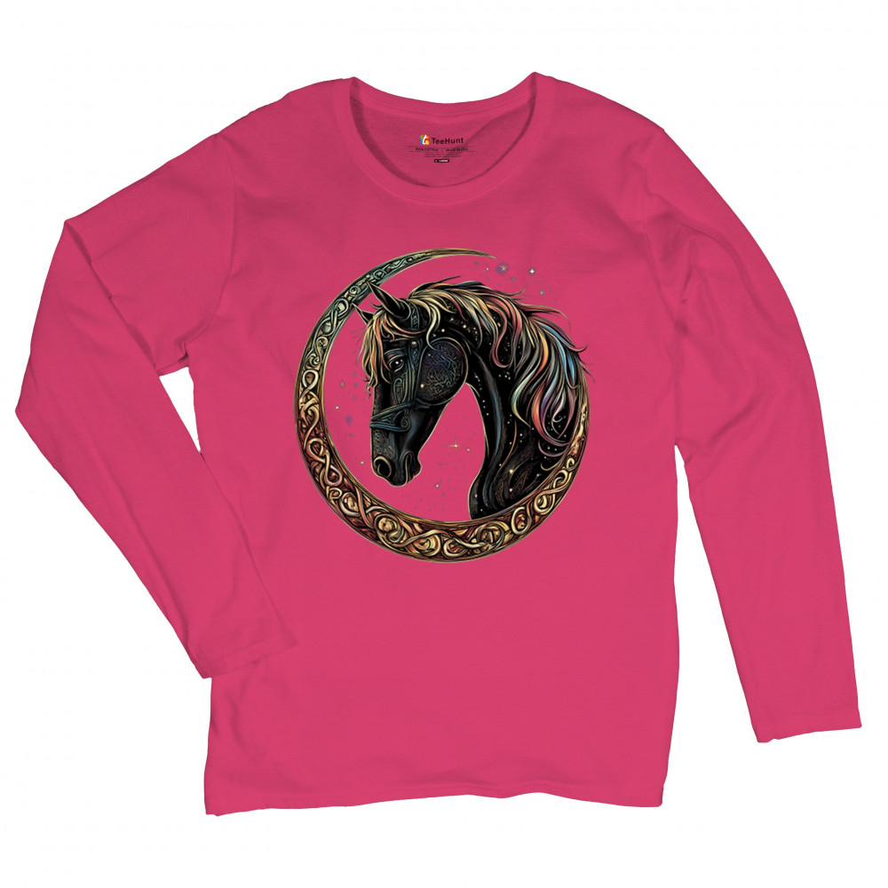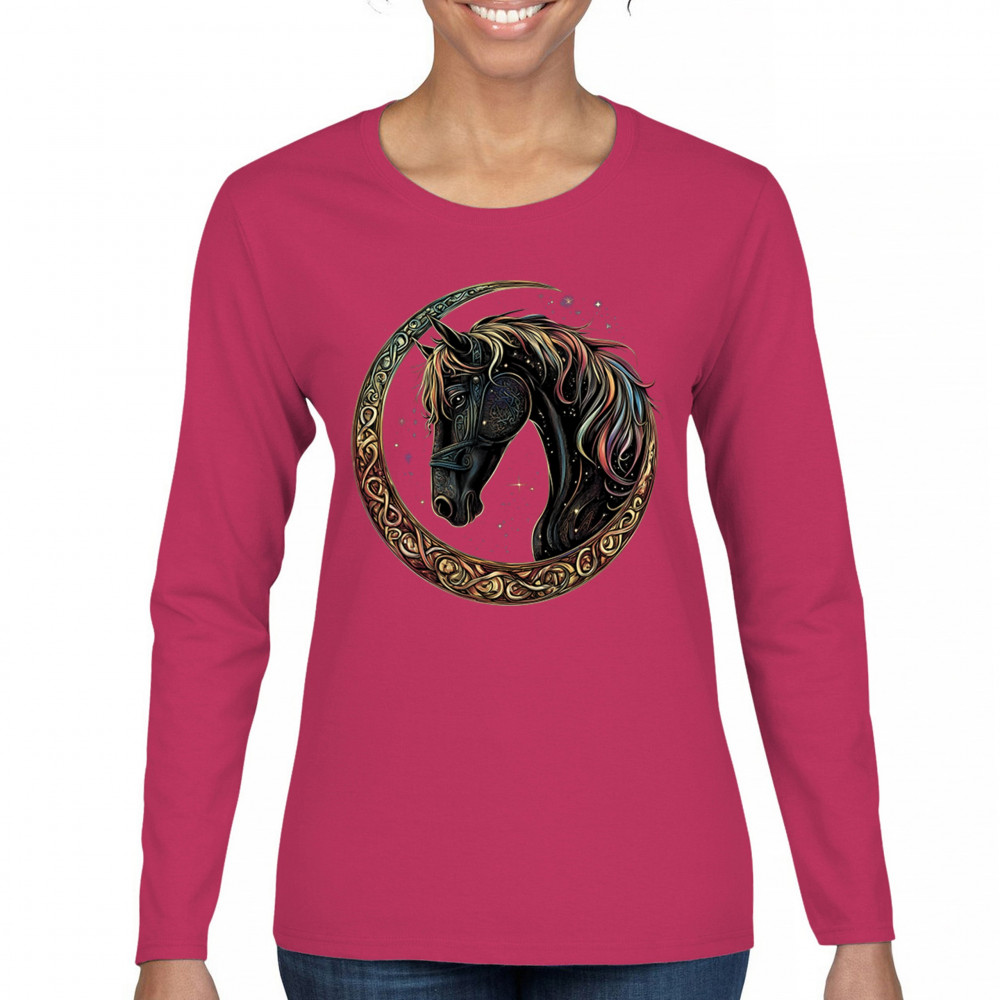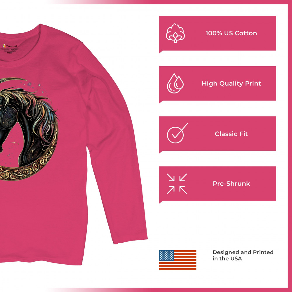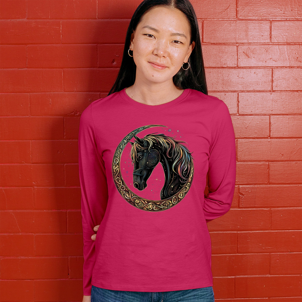 Celebrate the power and grace of the cosmos with this majestic black horse framed by a golden Celtic crescent moon. Its rainbow mane and celestial body symbolize strength, movement, mystery, and spiritual magic. A stunning piece for fantasy fans, equestrians, and dreamers who love horses and stars.