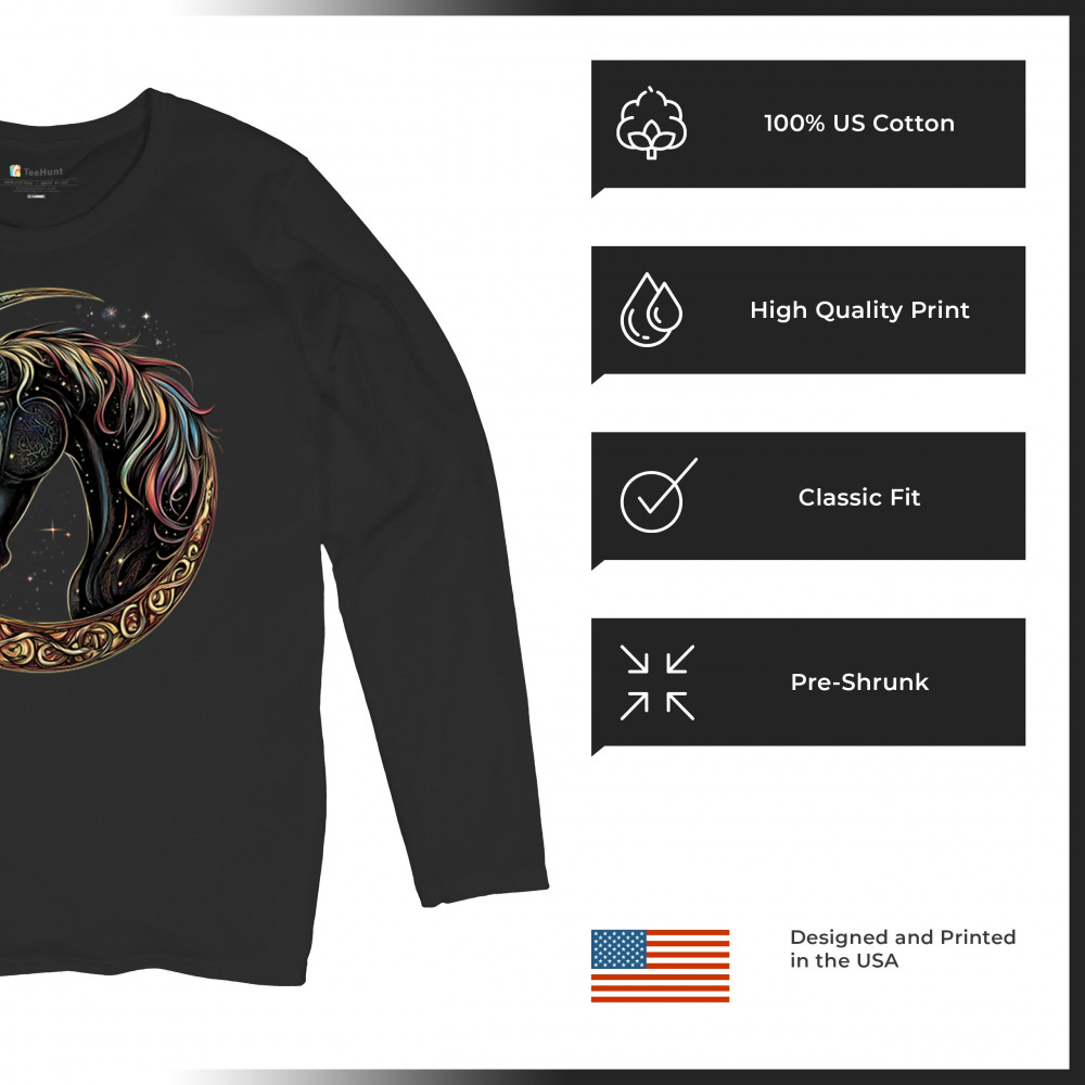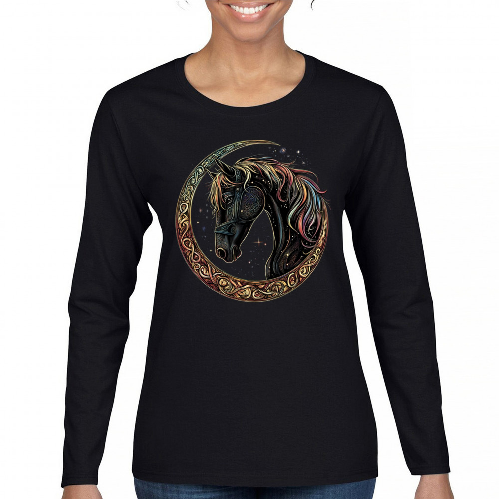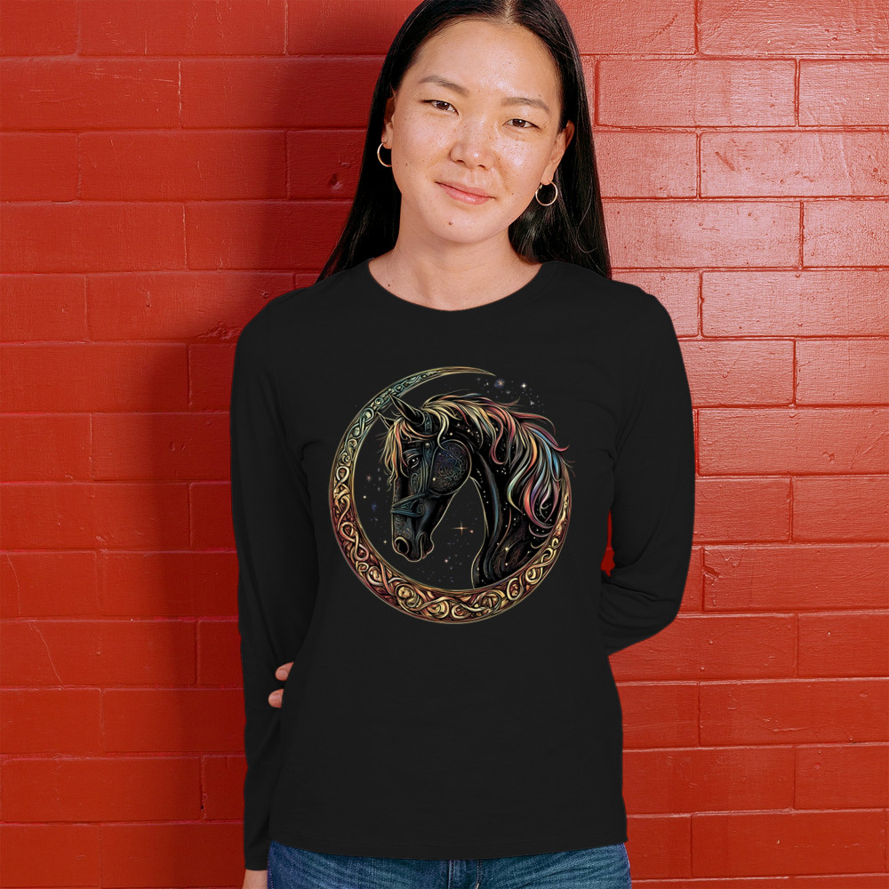 Celebrate the power and grace of the cosmos with this majestic black horse framed by a golden Celtic crescent moon. Its rainbow mane and celestial body symbolize strength, movement, mystery, and spiritual magic. A stunning piece for fantasy fans, equestrians, and dreamers who love horses and stars.