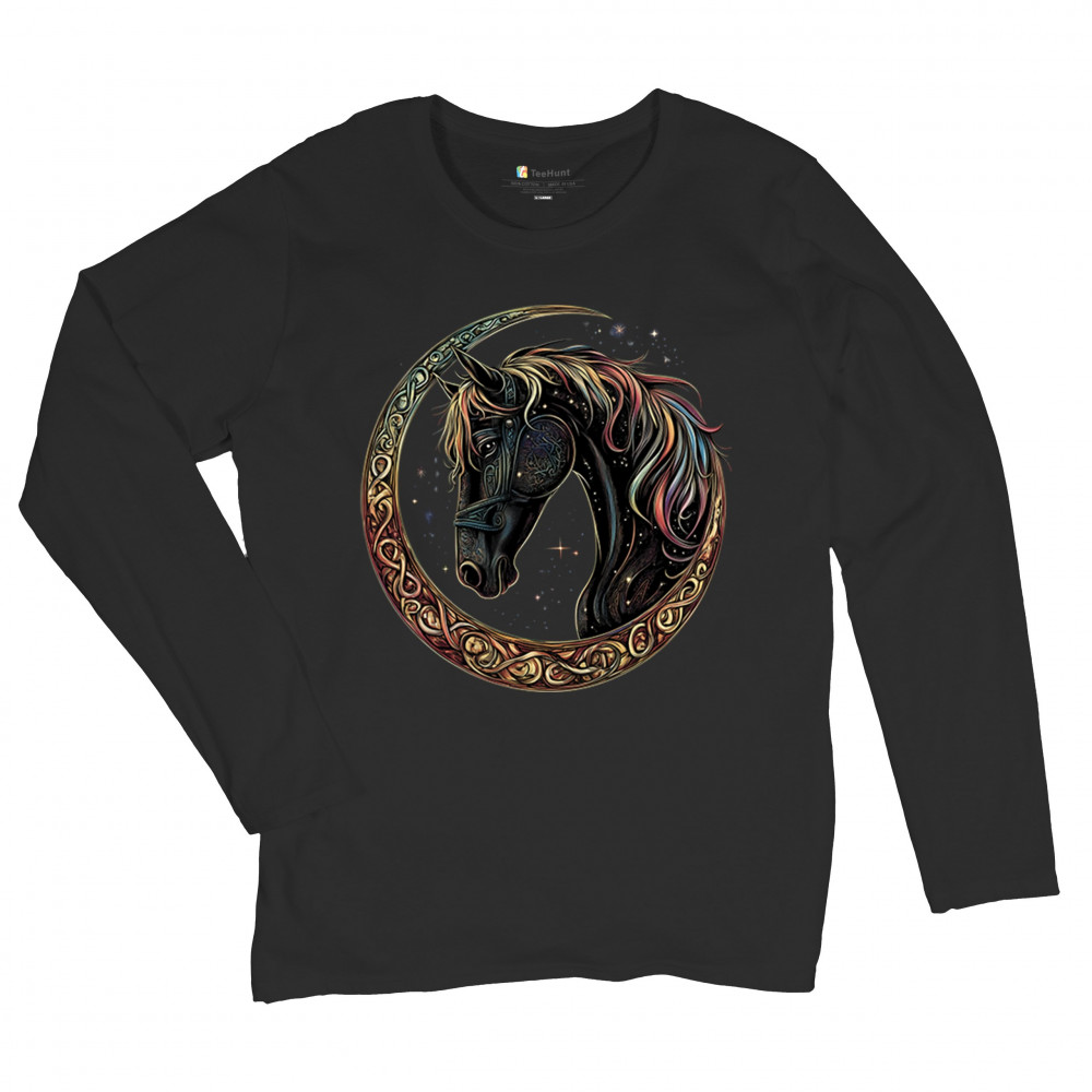 Celestial black horse with rainbow mane in Celtic moon. A mystical tribute to strength, movement, and spiritual beauty for horse and fantasy lovers.