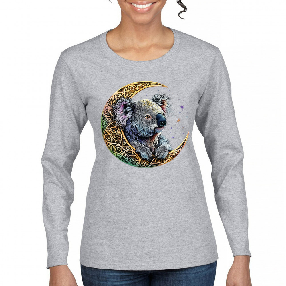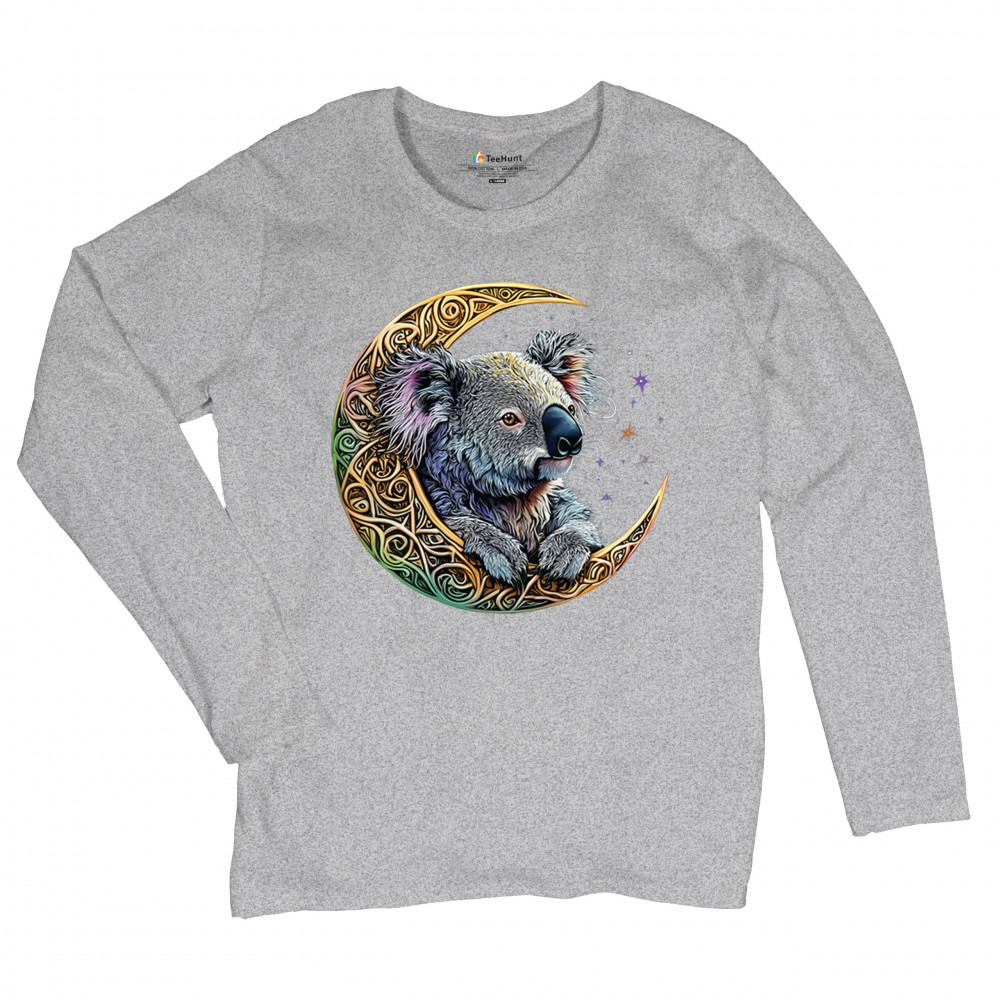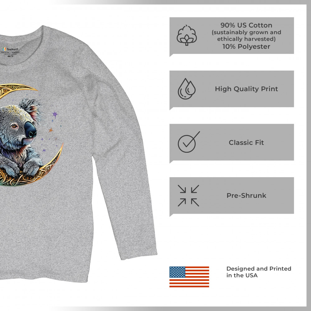 Koala resting in Celtic crescent moon with cosmic sky. A peaceful design for nature lovers, spiritual thinkers, and fantasy art fans.