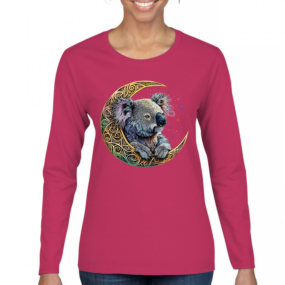 Koala resting in Celtic crescent moon with cosmic sky. A peaceful design for nature lovers, spiritual thinkers, and fantasy art fans.