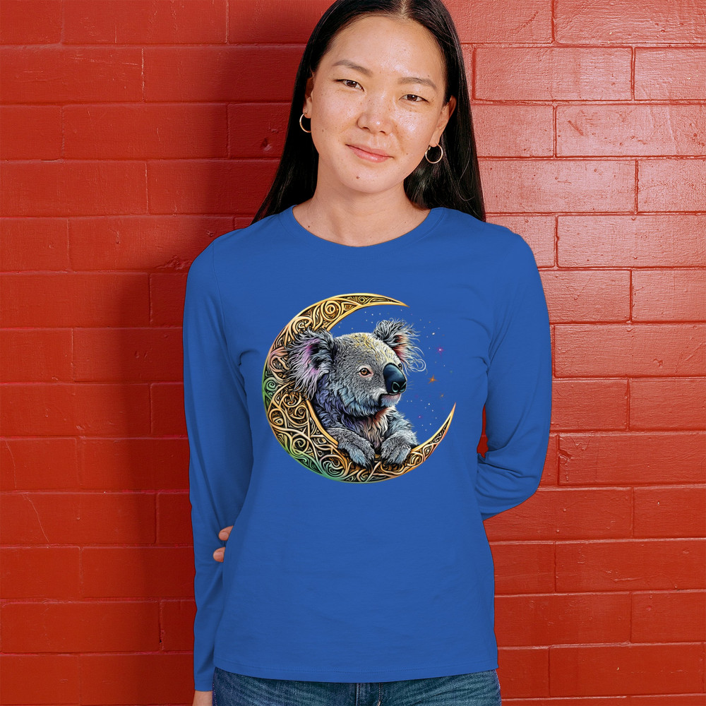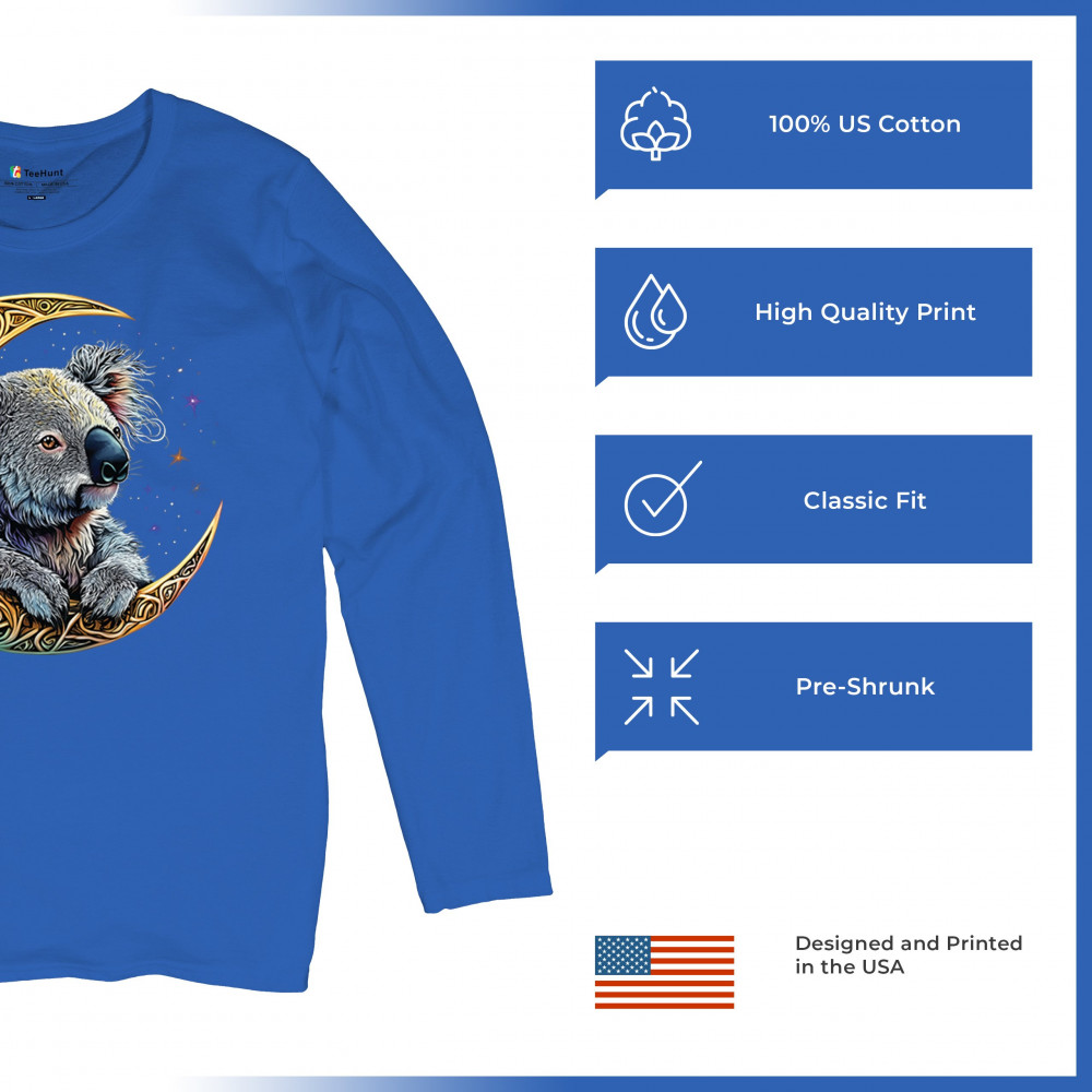 Koala resting in Celtic crescent moon with cosmic sky. A peaceful design for nature lovers, spiritual thinkers, and fantasy art fans.