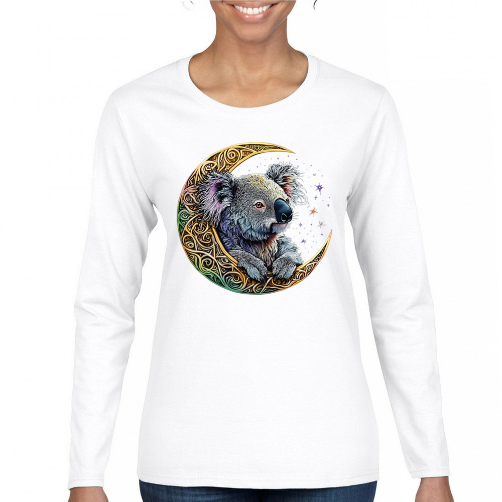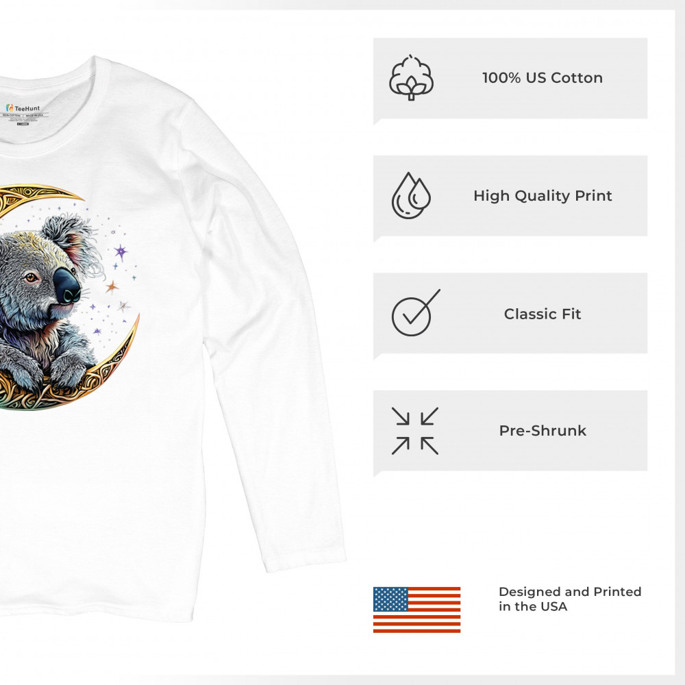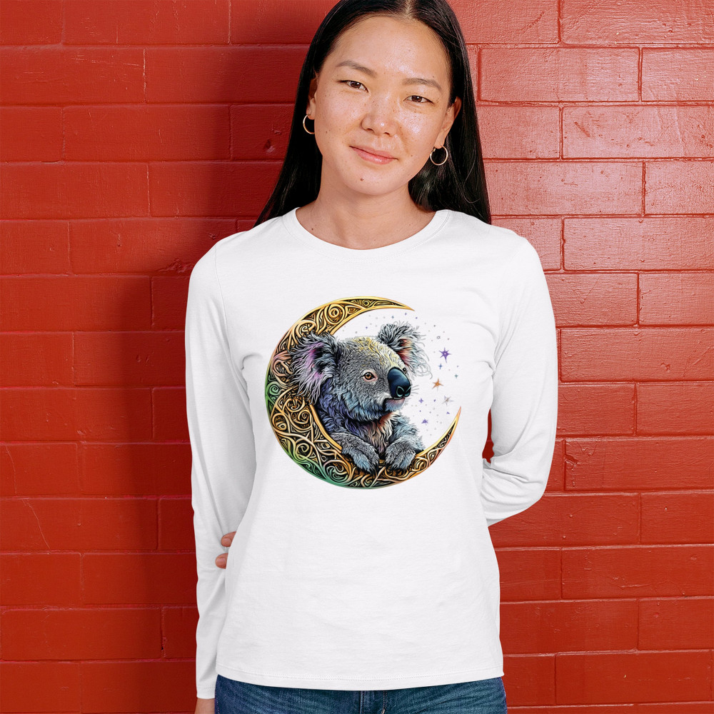 Koala resting in Celtic crescent moon with cosmic sky. A peaceful design for nature lovers, spiritual thinkers, and fantasy art fans.