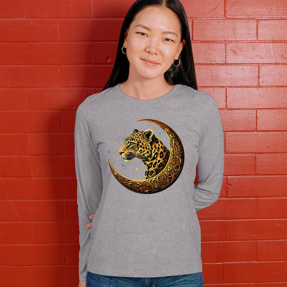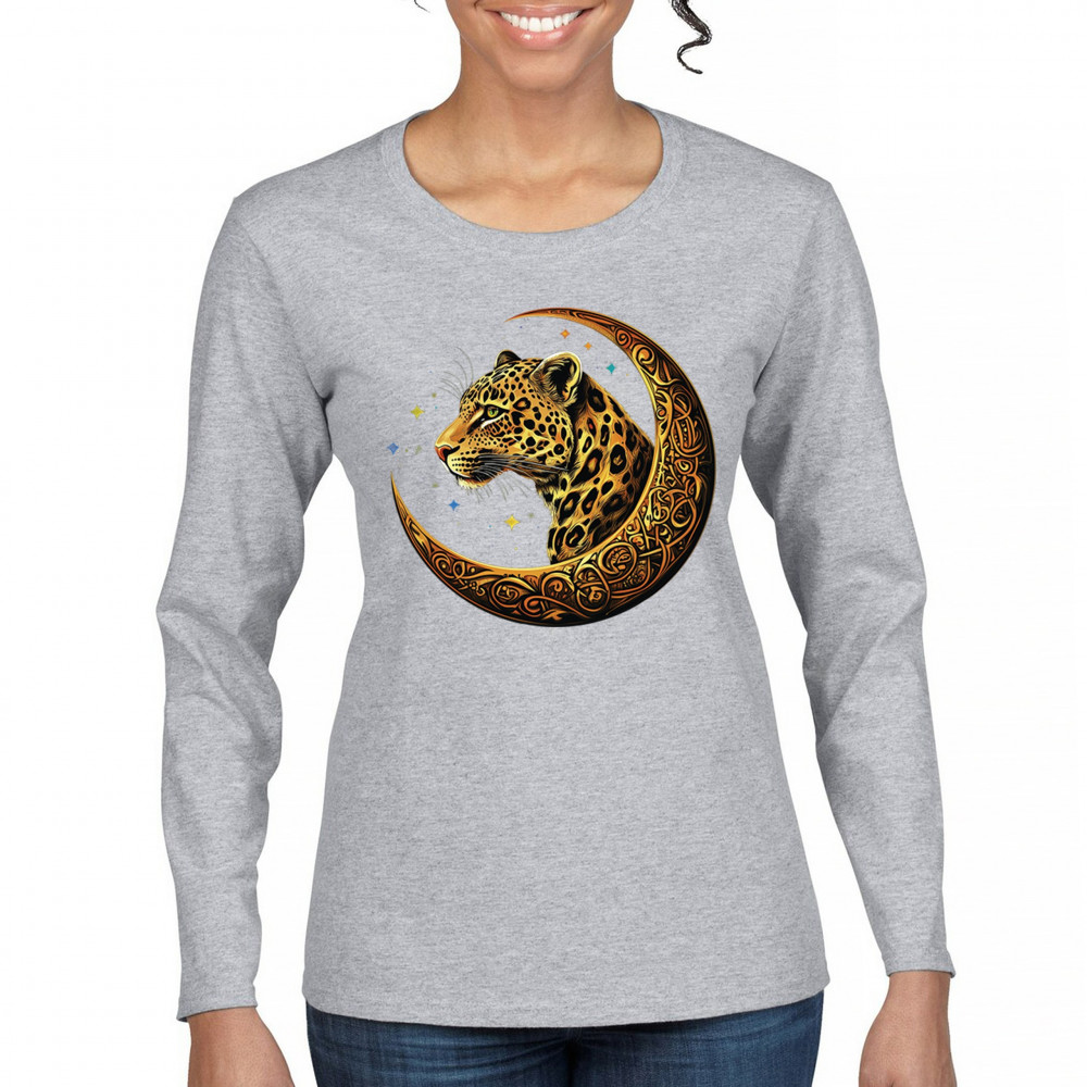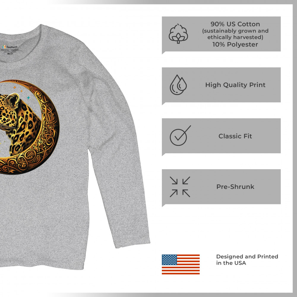 Unleash wild energy and spiritual symbolism with this bold leopard design set inside a golden Celtic crescent moon. A cosmic starry background amplifies its mystical vibe, symbolizing agility, independence, and awareness. Perfect for big cat lovers, jungle animal fans, and seekers of fantasy or tribal-inspired art.