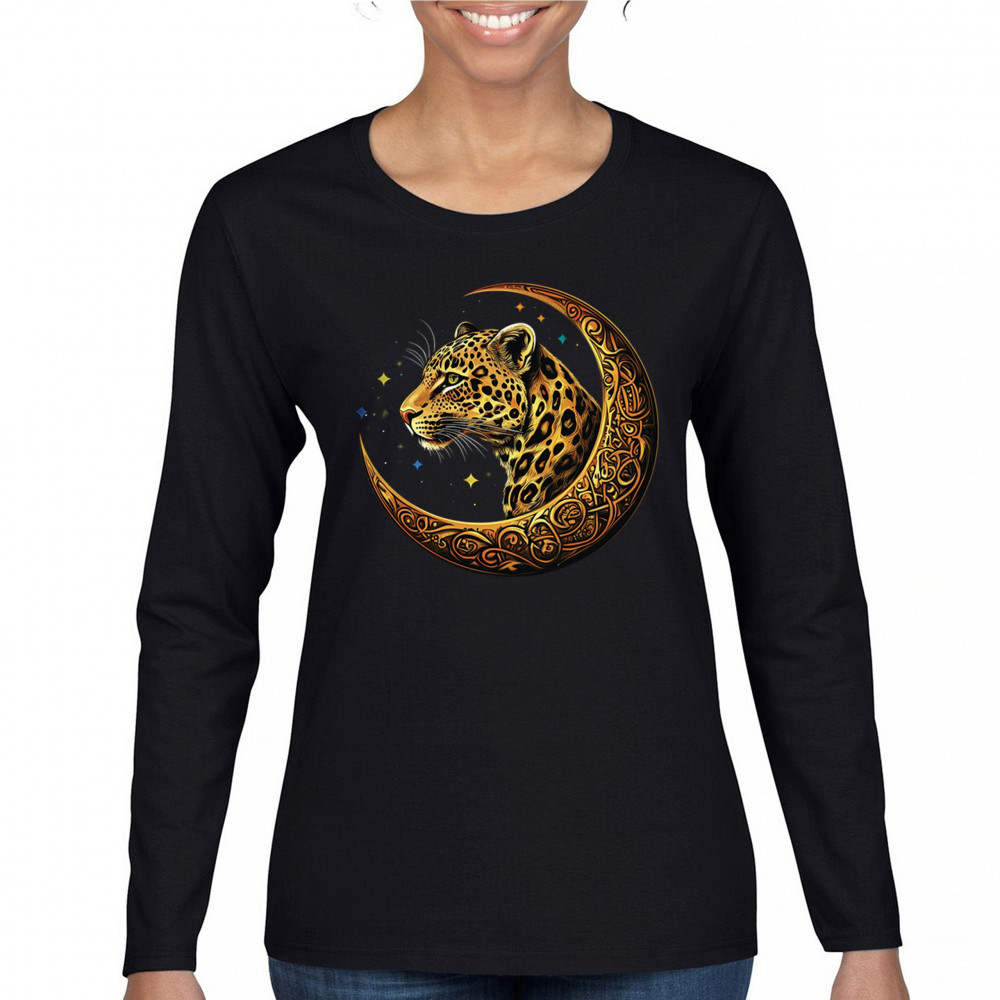Leopard in Celtic moon with cosmic background. A fierce and spiritual design for big cat lovers, jungle fans, mystics, and fantasy art seekers.