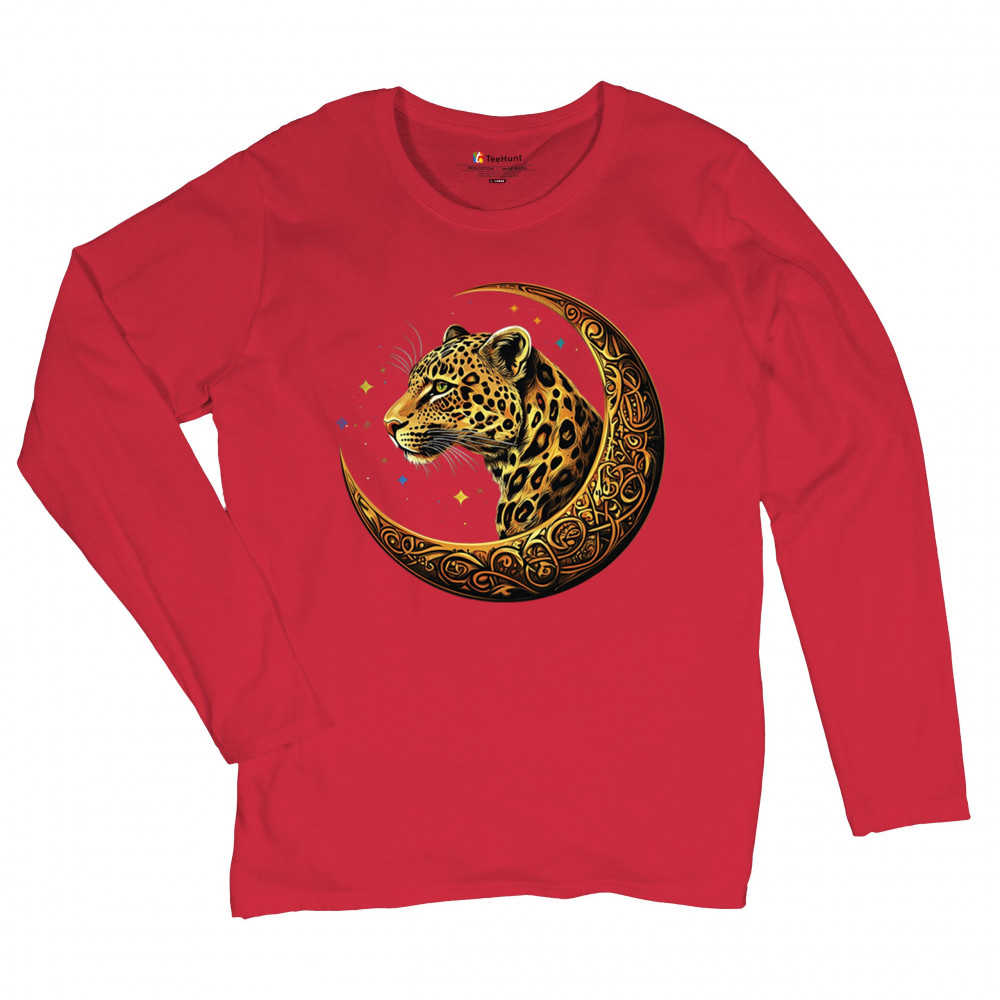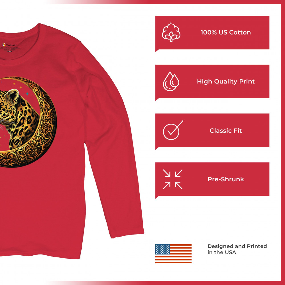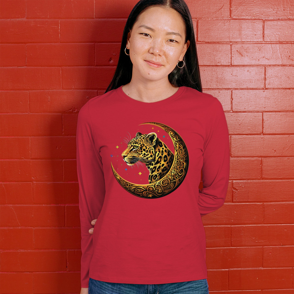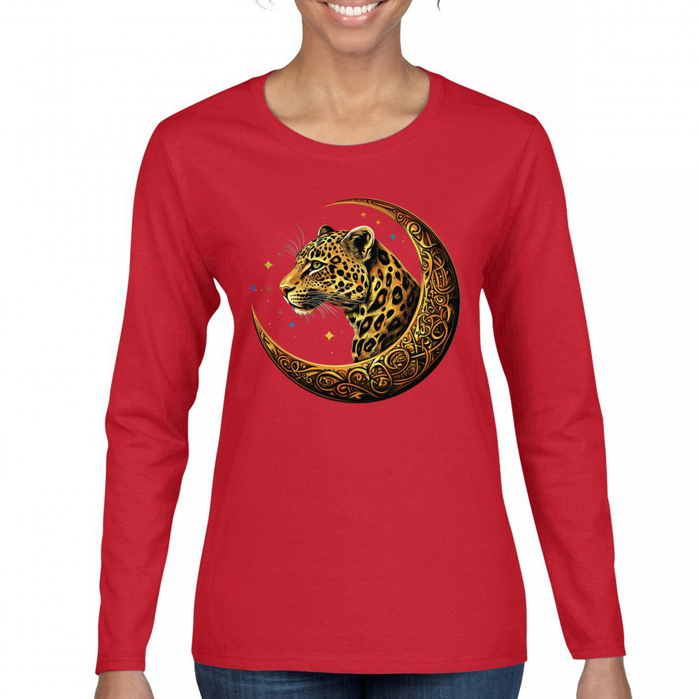 Unleash wild energy and spiritual symbolism with this bold leopard design set inside a golden Celtic crescent moon. A cosmic starry background amplifies its mystical vibe, symbolizing agility, independence, and awareness. Perfect for big cat lovers, jungle animal fans, and seekers of fantasy or tribal-inspired art.
