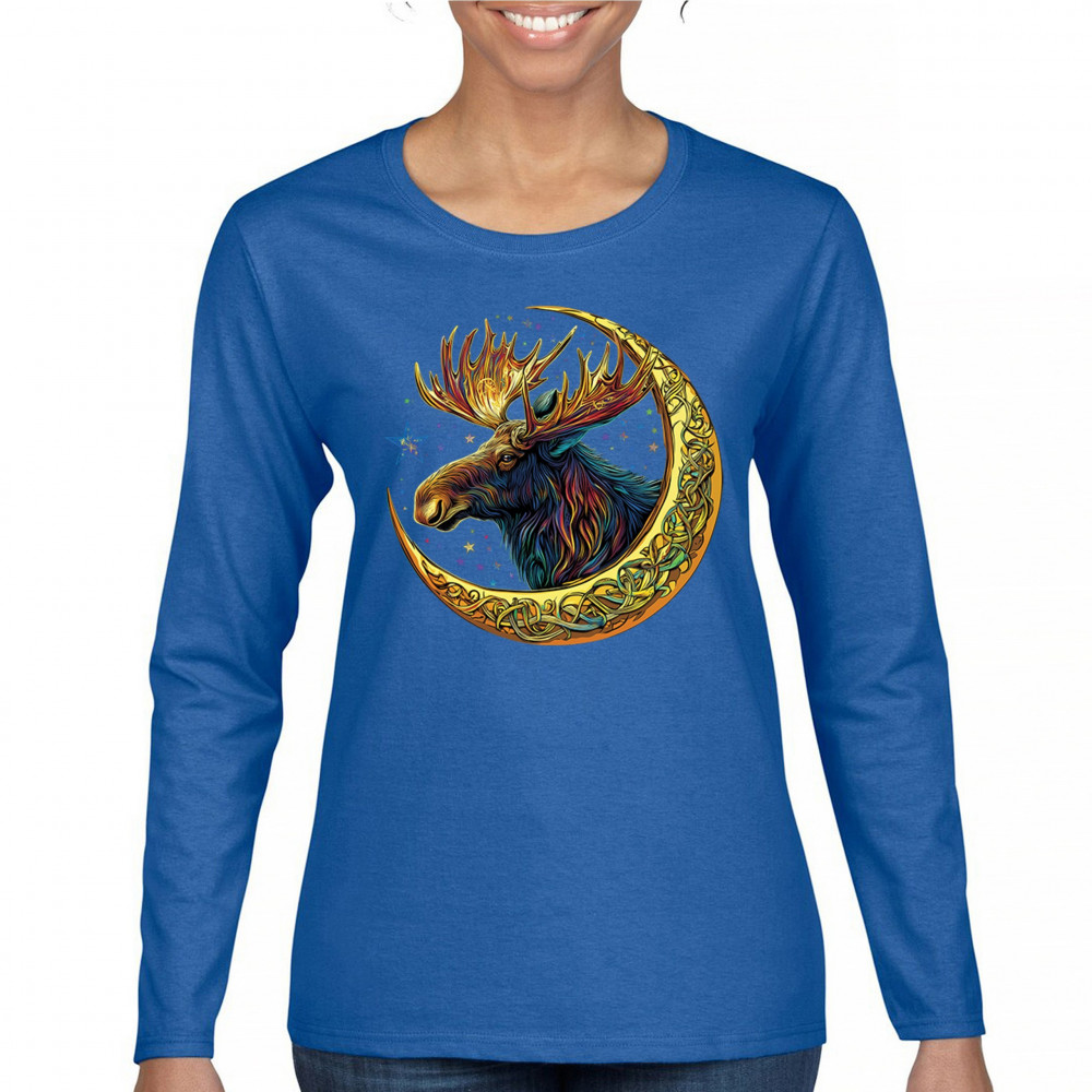 Mystical moose in gold Celtic crescent moon design—symbolizes strength, nature wisdom, and cosmic spirit for fantasy lovers and woodland fans.
