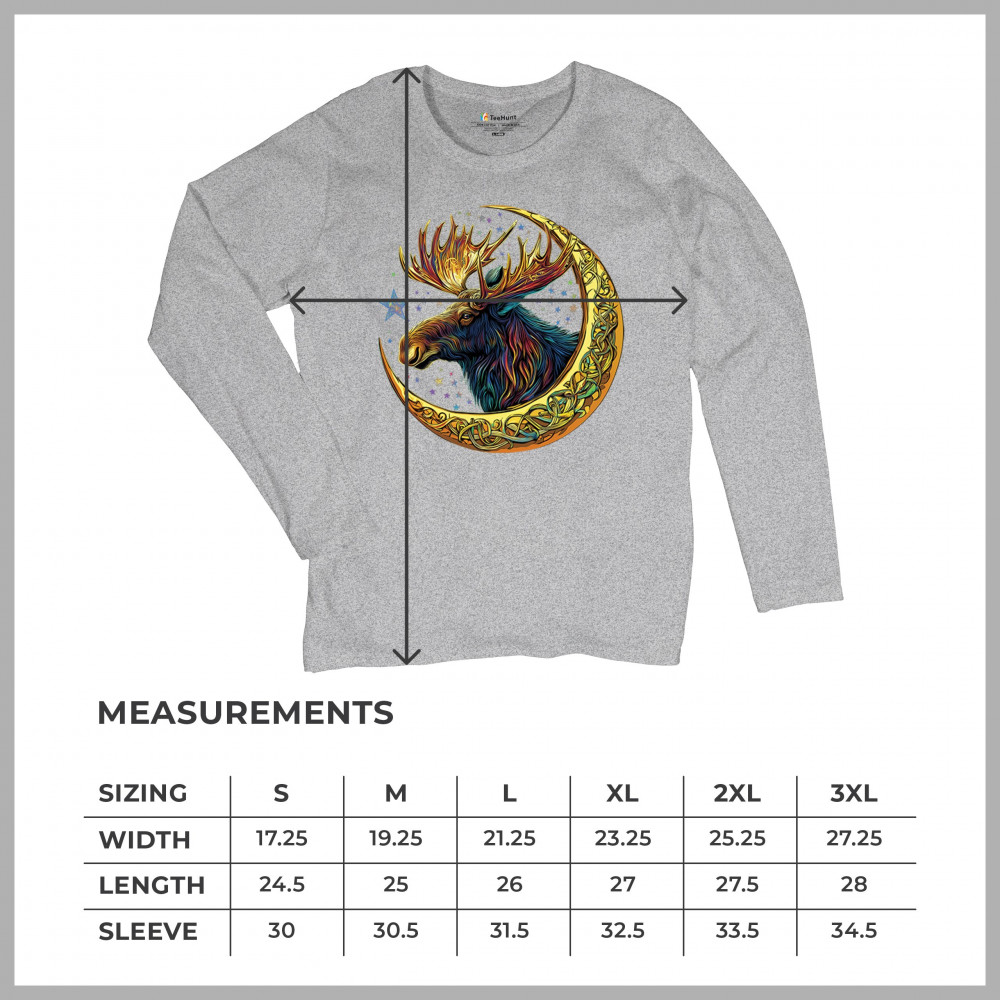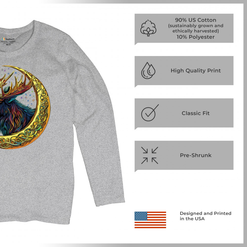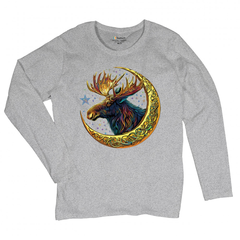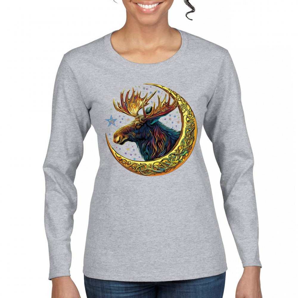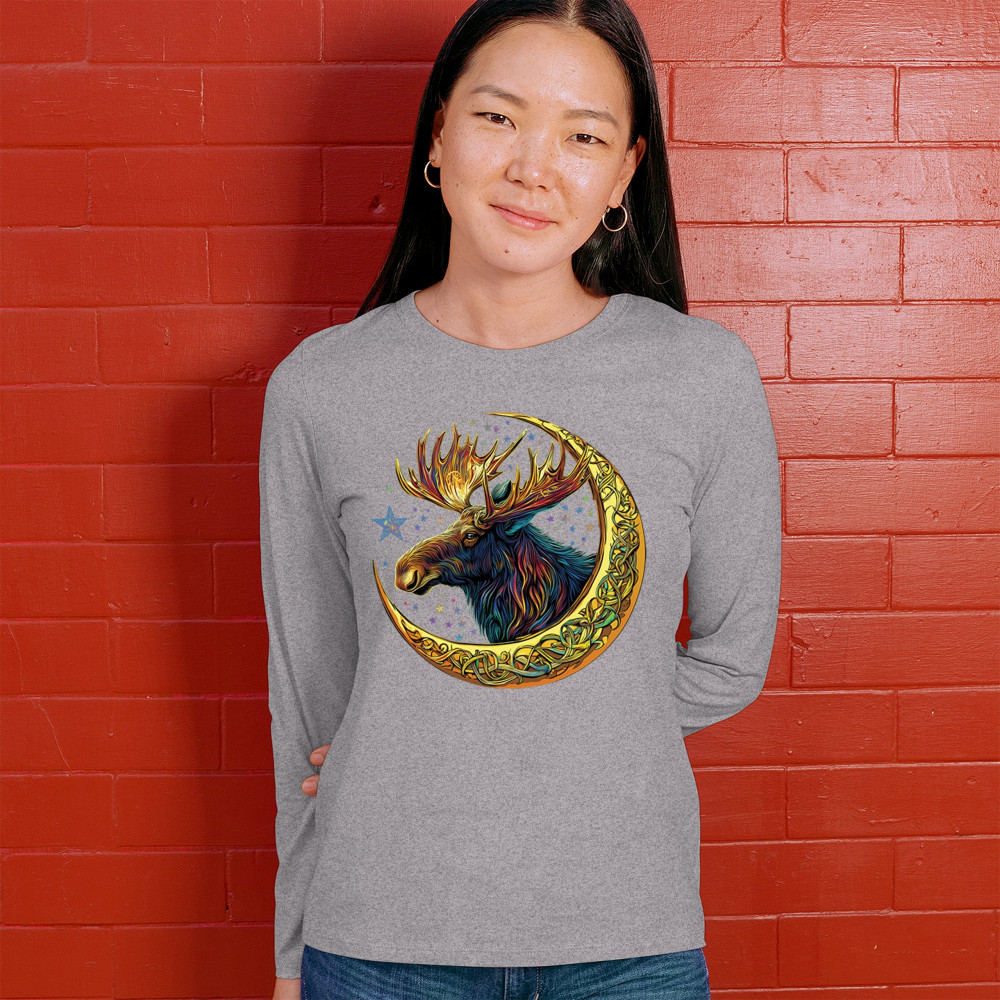 Mystical moose in gold Celtic crescent moon design—symbolizes strength, nature wisdom, and cosmic spirit for fantasy lovers and woodland fans.