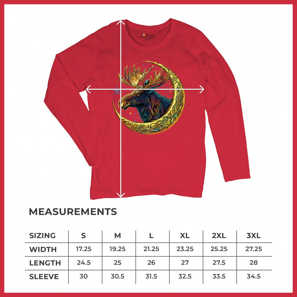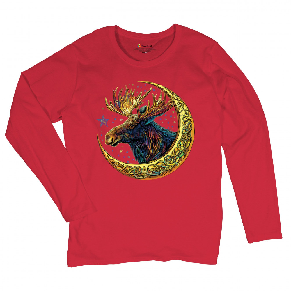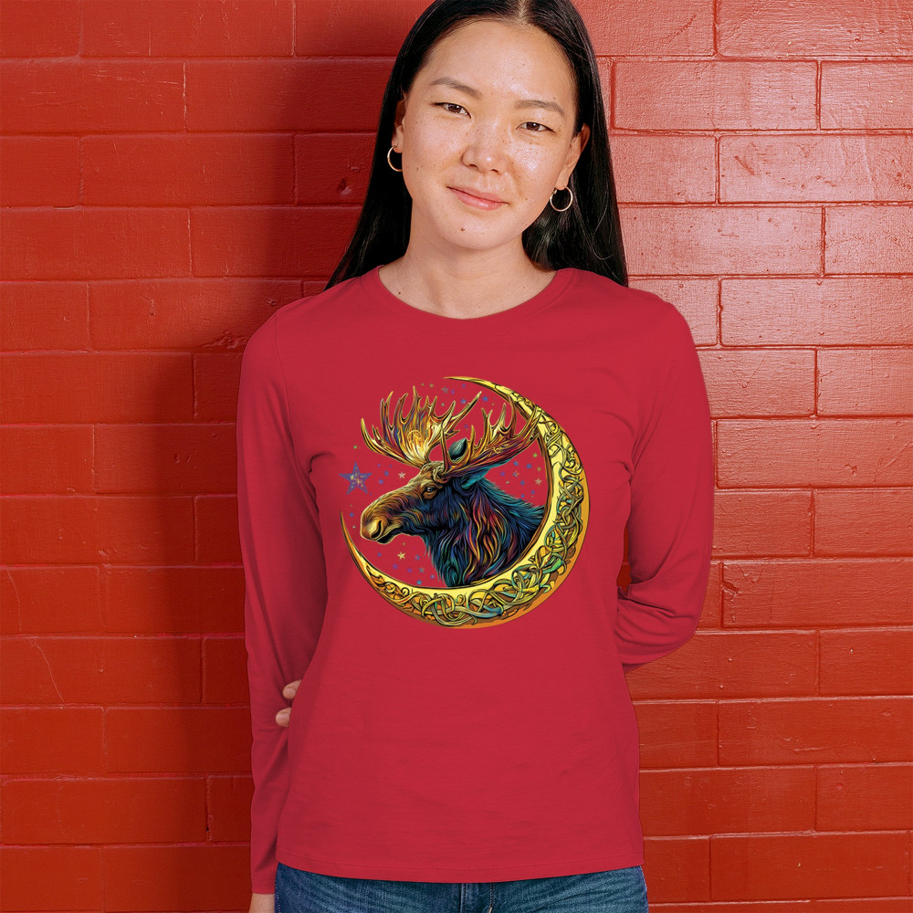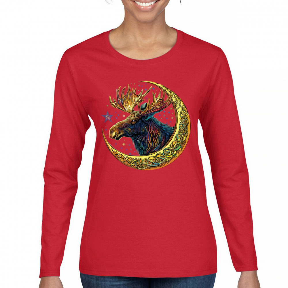 Mystical moose in gold Celtic crescent moon design—symbolizes strength, nature wisdom, and cosmic spirit for fantasy lovers and woodland fans.