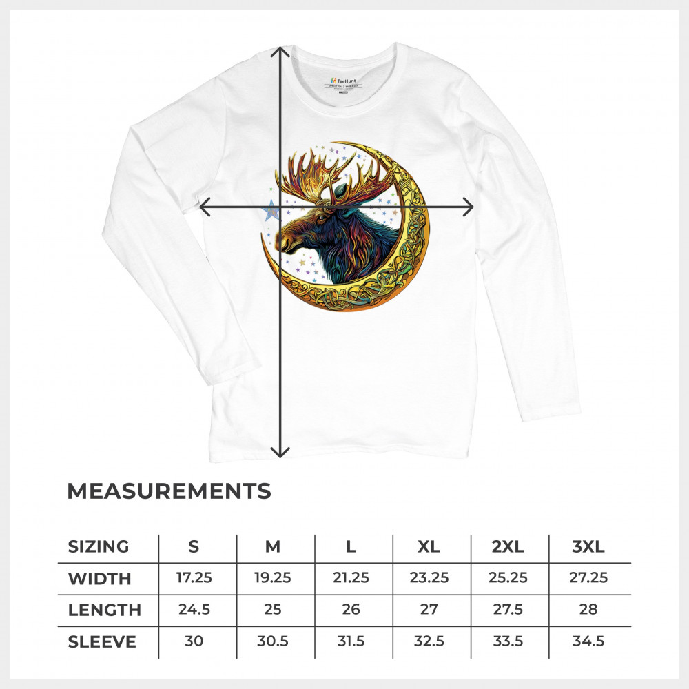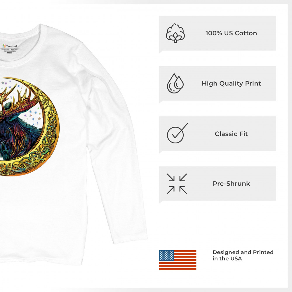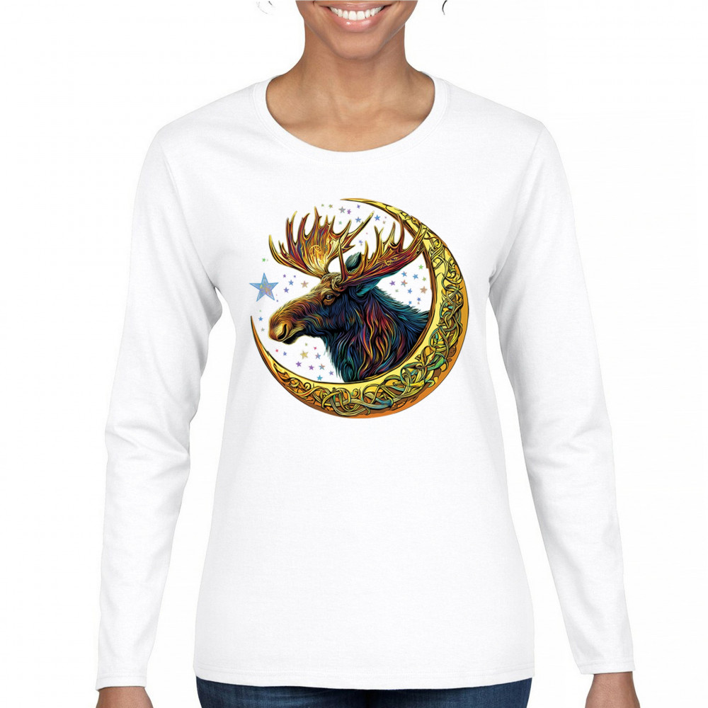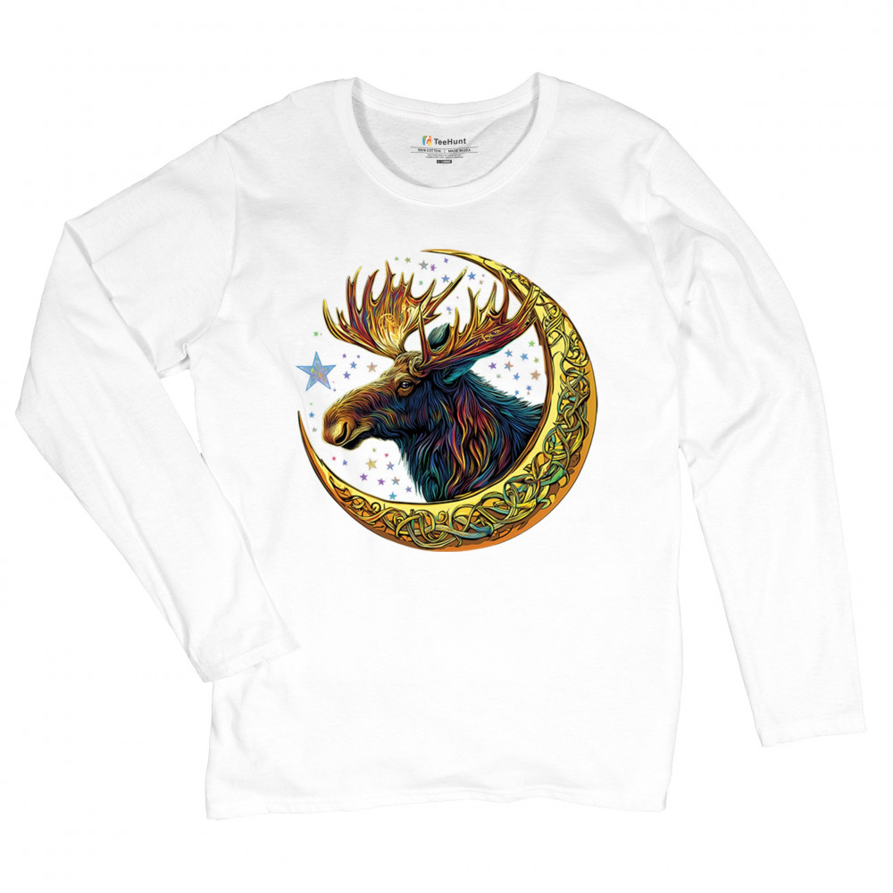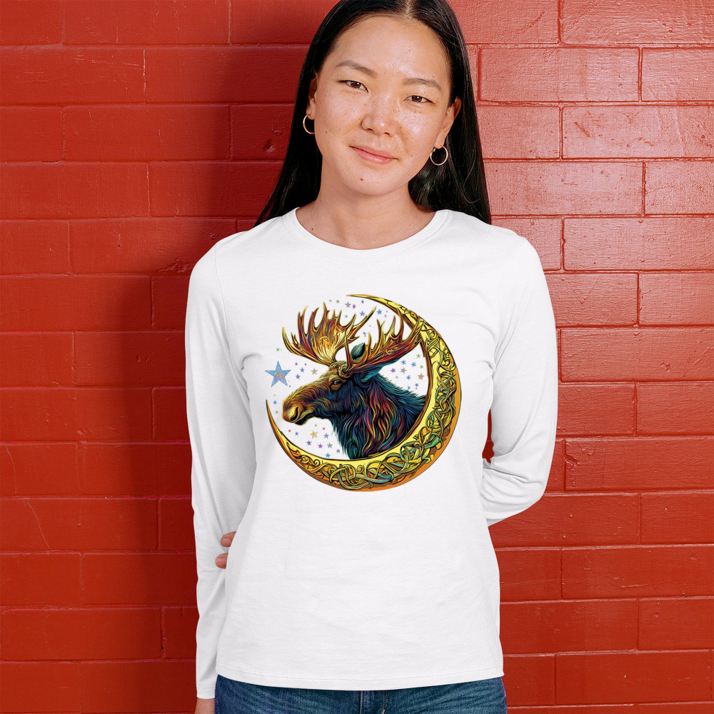Mystical moose in gold Celtic crescent moon design—symbolizes strength, nature wisdom, and cosmic spirit for fantasy lovers and woodland fans.