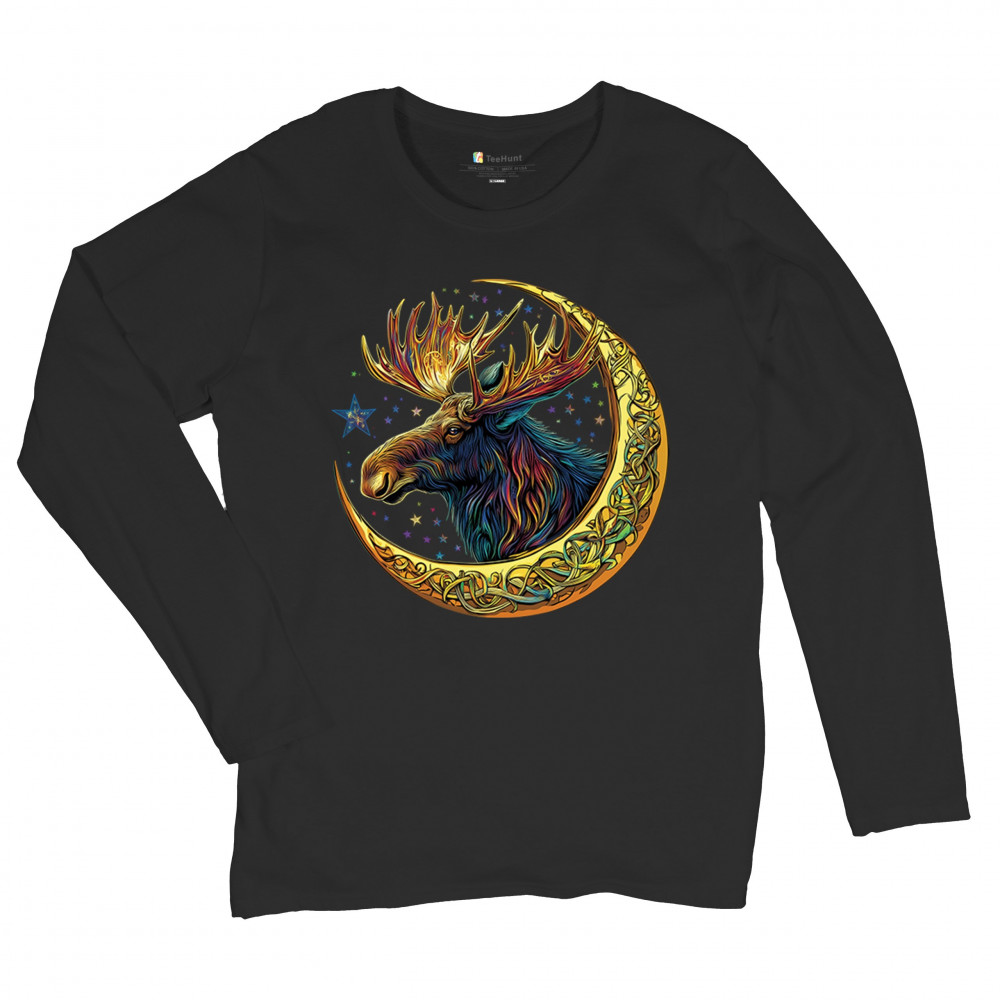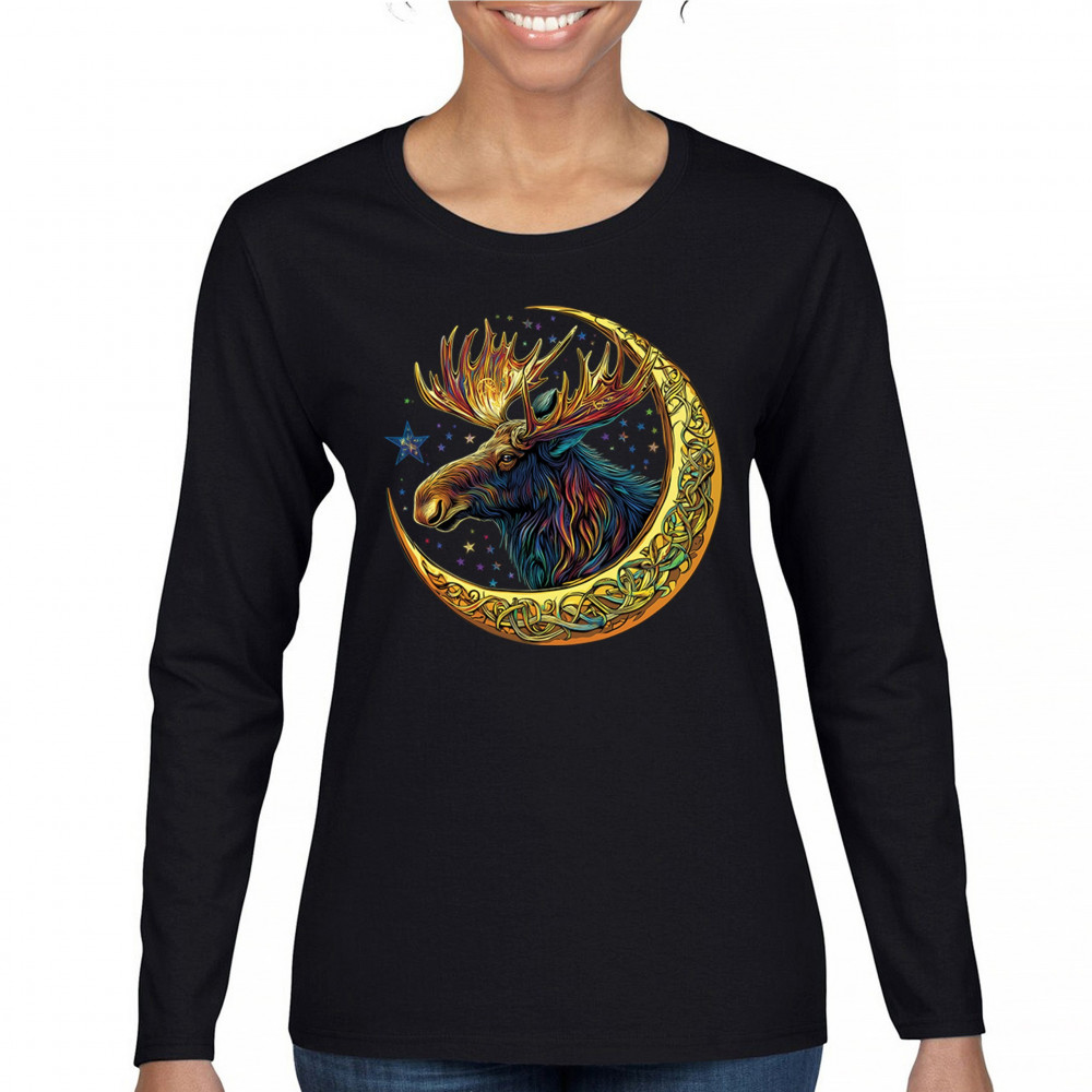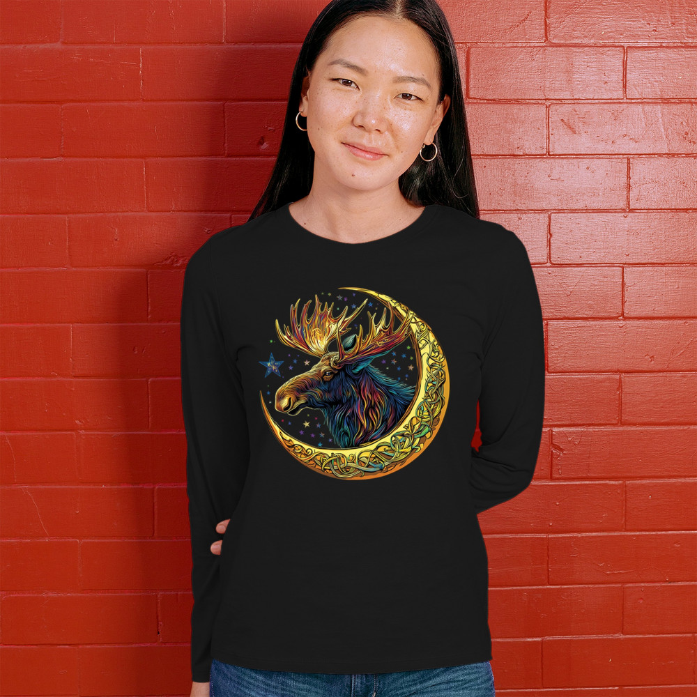 Mystical moose in gold Celtic crescent moon design—symbolizes strength, nature wisdom, and cosmic spirit for fantasy lovers and woodland fans.