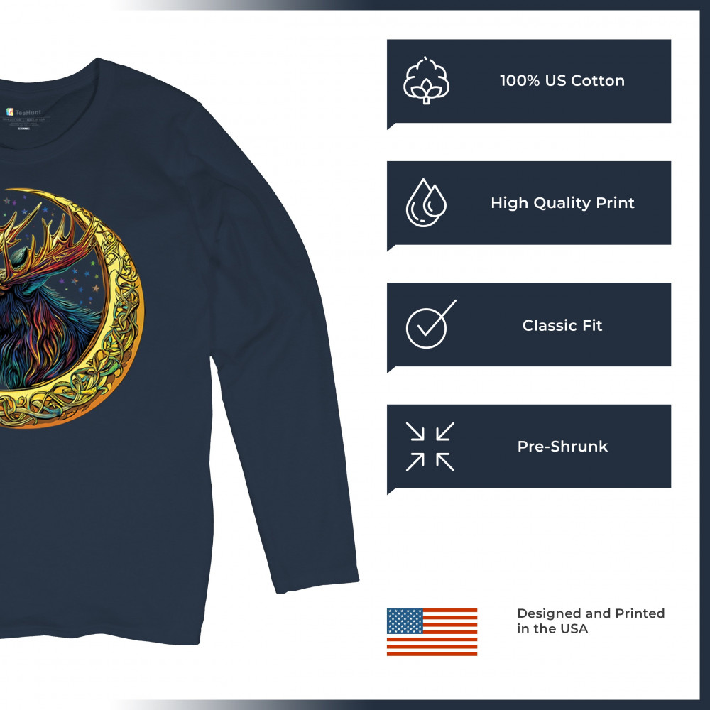This vibrant moose design blends tribal art and fantasy energy with a golden Celtic crescent moon. Cosmic fur, radiant antlers, and a star-speckled sky make this image a symbol of strength, natural wisdom, and mysticism. Ideal for druids, hunters, fantasy fans, or spirit animal seekers connected to the forest and celestial realm.