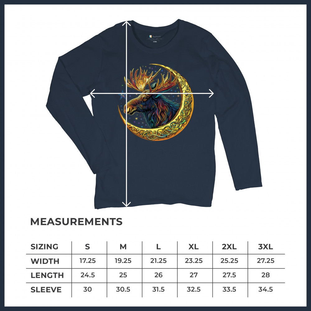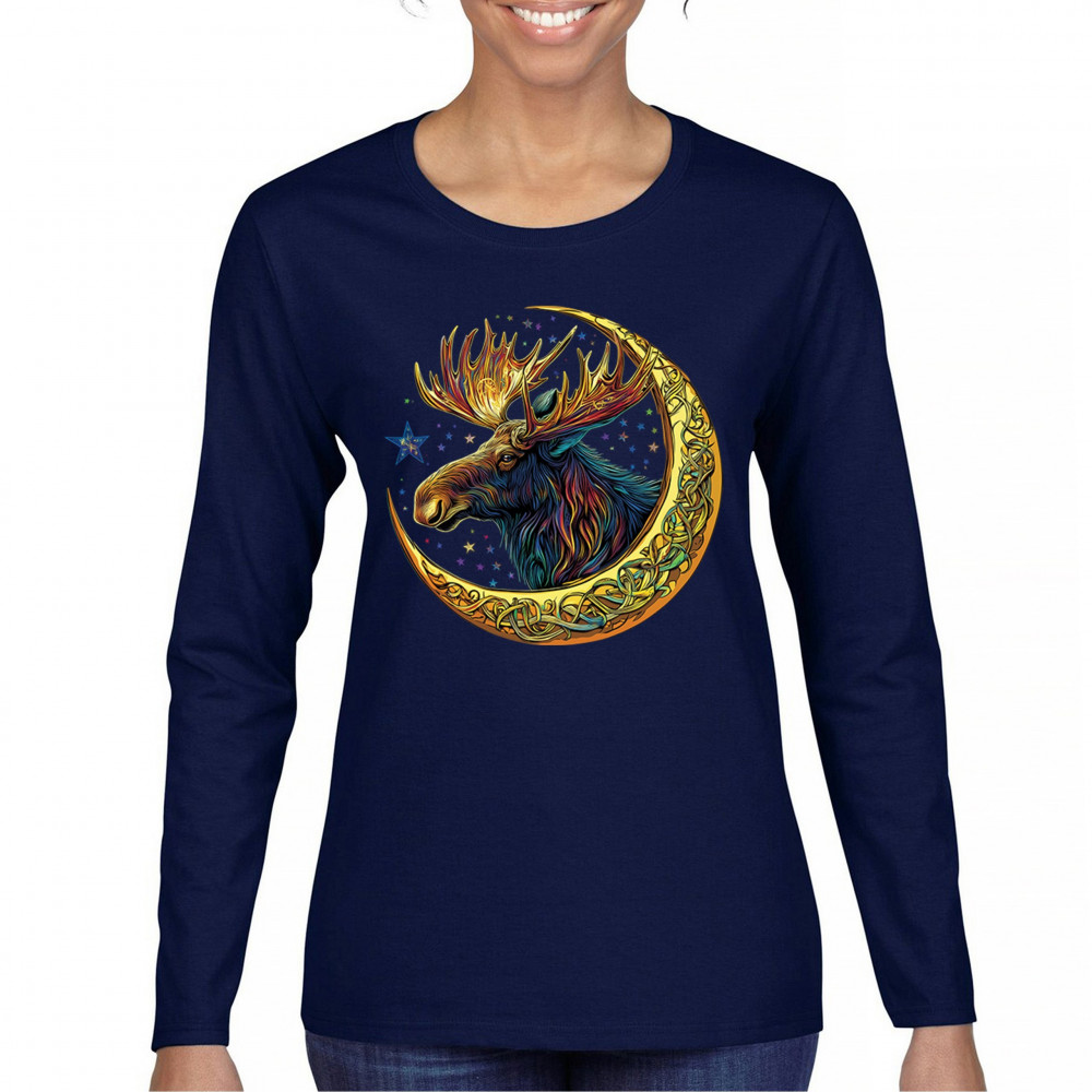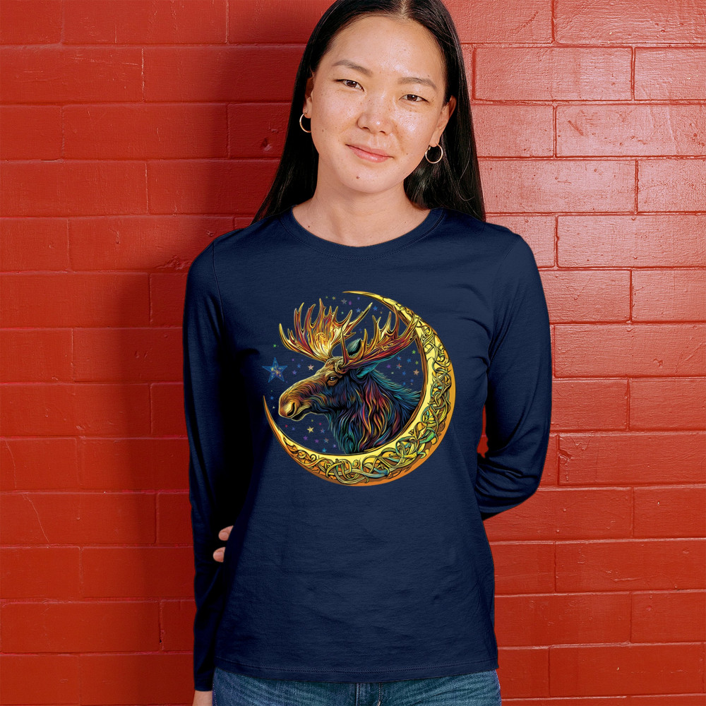 Mystical moose in gold Celtic crescent moon design—symbolizes strength, nature wisdom, and cosmic spirit for fantasy lovers and woodland fans.