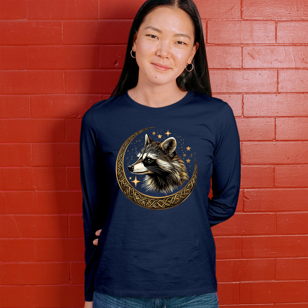 Cosmic raccoon design in Celtic moon. Symbol of adaptability, mystery, and spiritual intelligence. A perfect gift for wild and curious souls.
