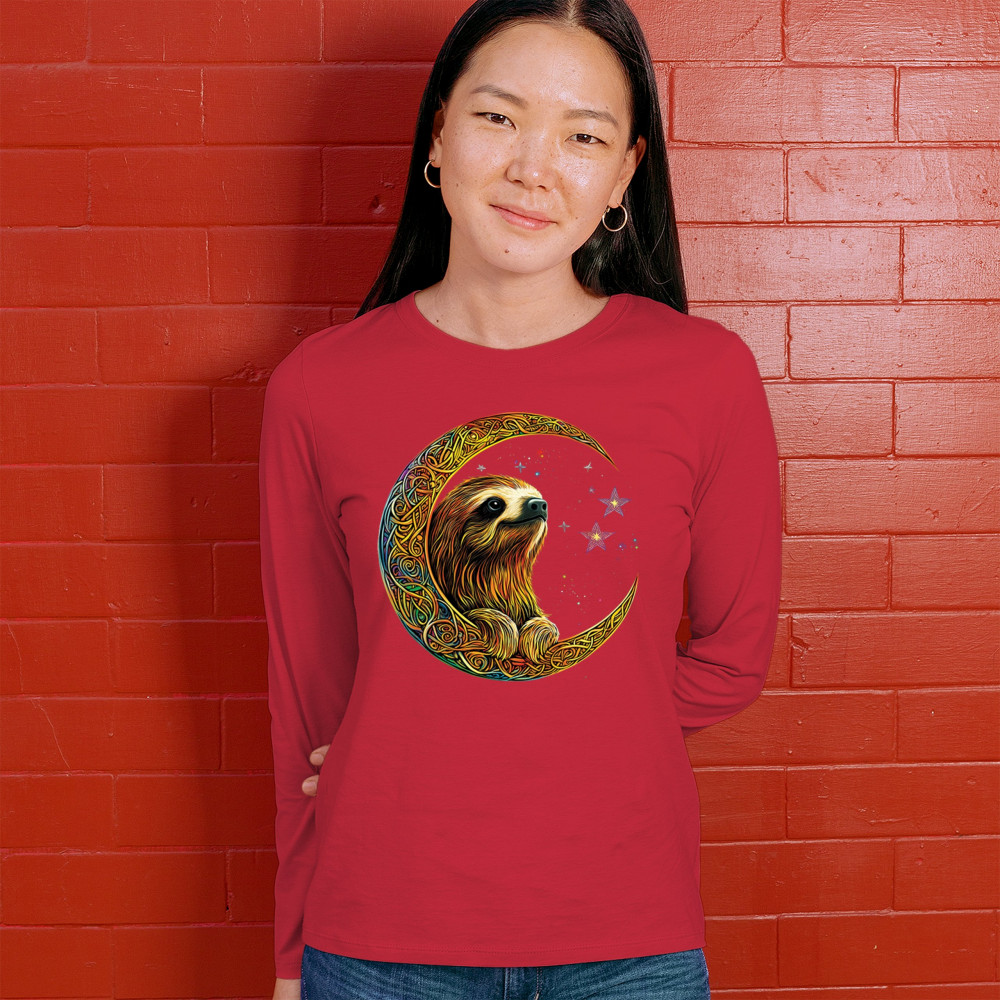 Peaceful sloth in Celtic crescent moon with cosmic sky. Symbol of mindfulness, rest, and intentional living. A calm, magical fantasy design.