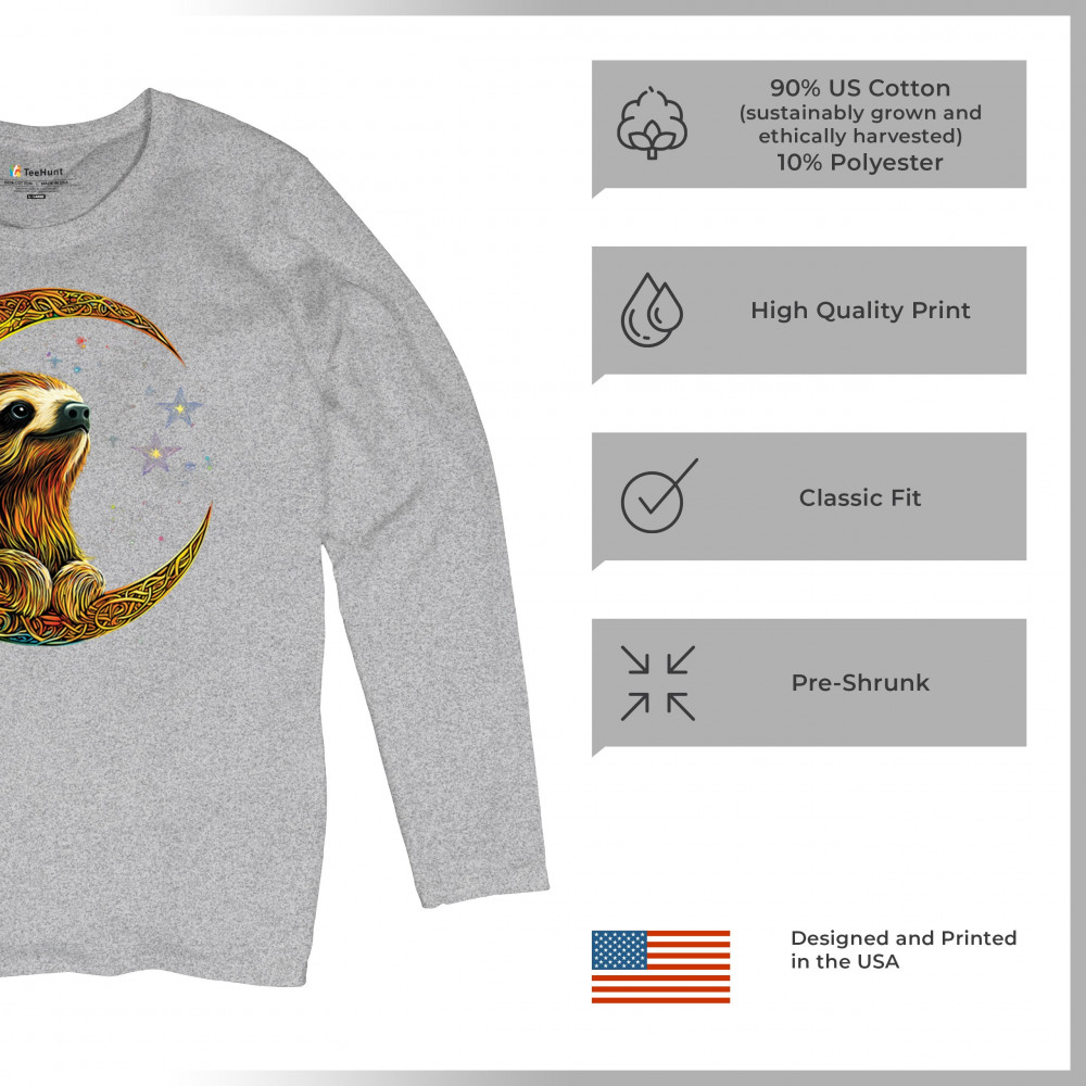 Celebrate peace and presence with this stunning sloth design cradled in a gold Celtic crescent moon. Surrounded by a vibrant starry sky, the image blends jungle whimsy with tribal patterns and mystical vibes. A perfect design for lovers of fantasy animals, mindfulness, and slow living. A beautiful tribute to spiritual stillness and cosmic calm.