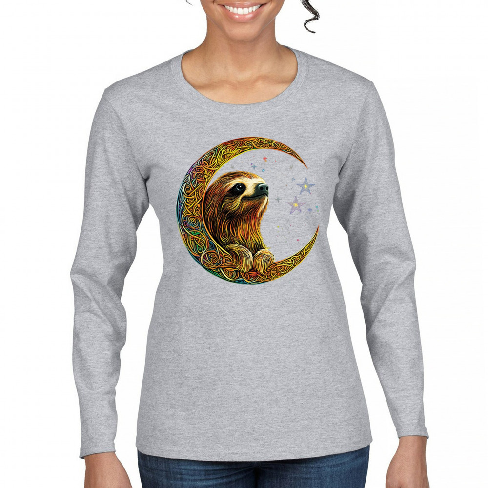 Peaceful sloth in Celtic crescent moon with cosmic sky. Symbol of mindfulness, rest, and intentional living. A calm, magical fantasy design.