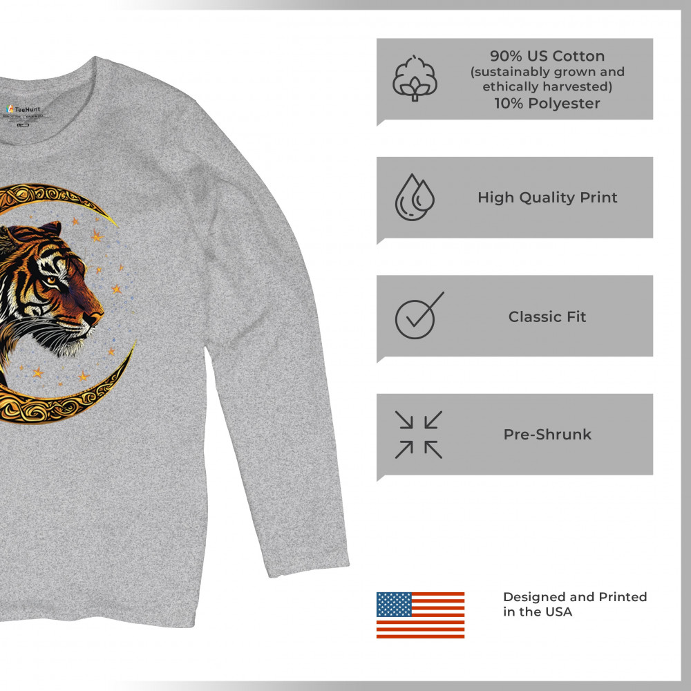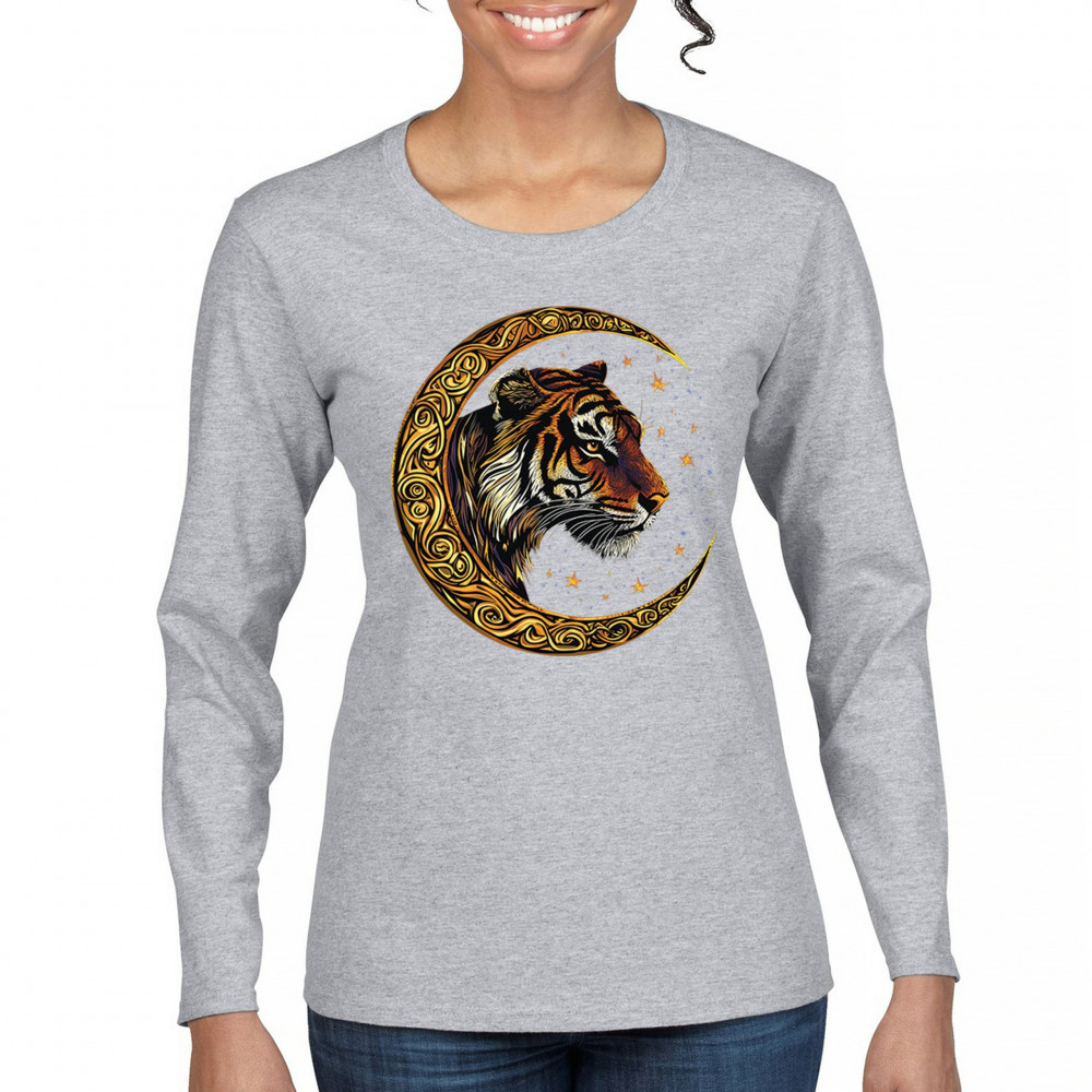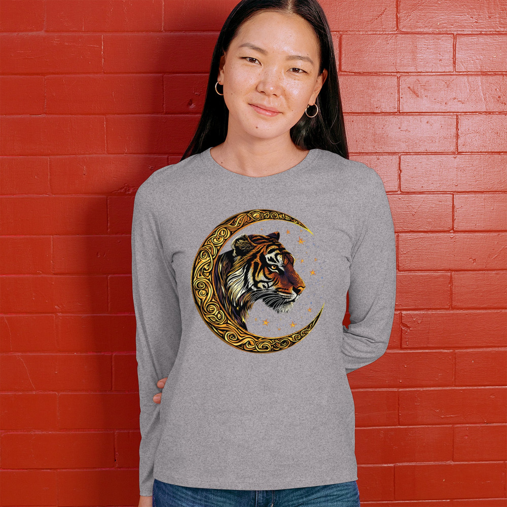 Bold tiger design in Celtic moon with cosmic sky. Symbol of strength, instinct, and jungle mysticism. Great for animal lovers and fantasy fans.