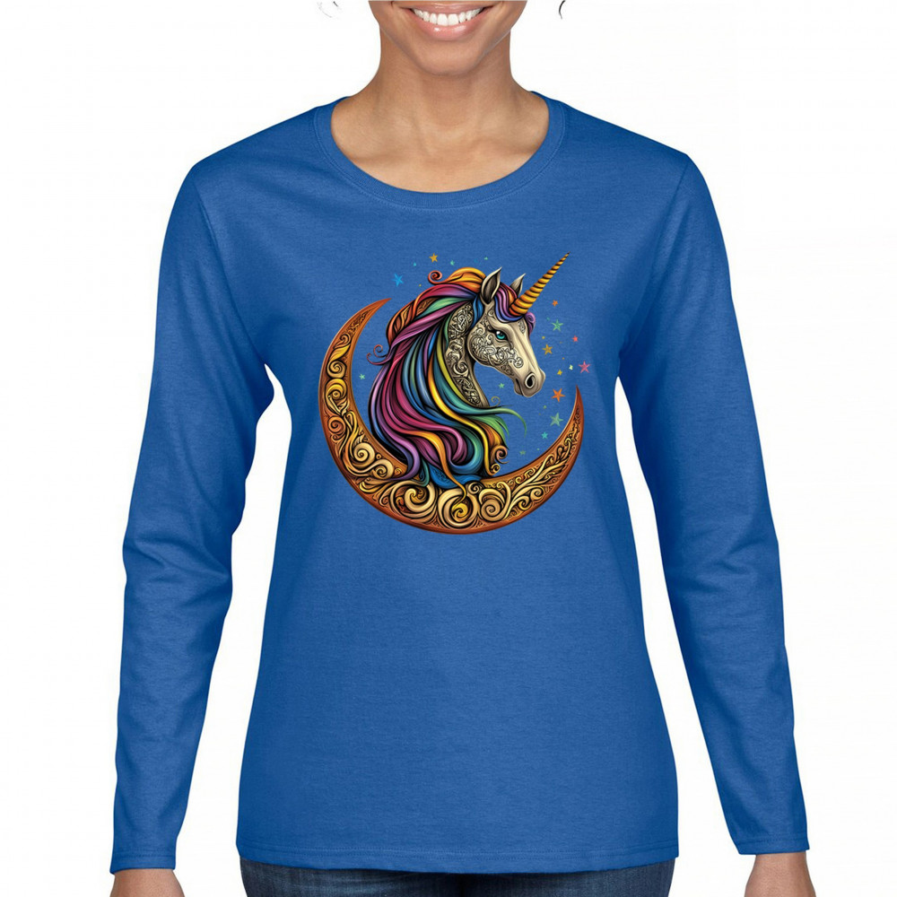 Rainbow-maned unicorn in golden Celtic moon design—perfect for fantasy lovers, dreamers, and unicorn fans who believe in magic and spirit.