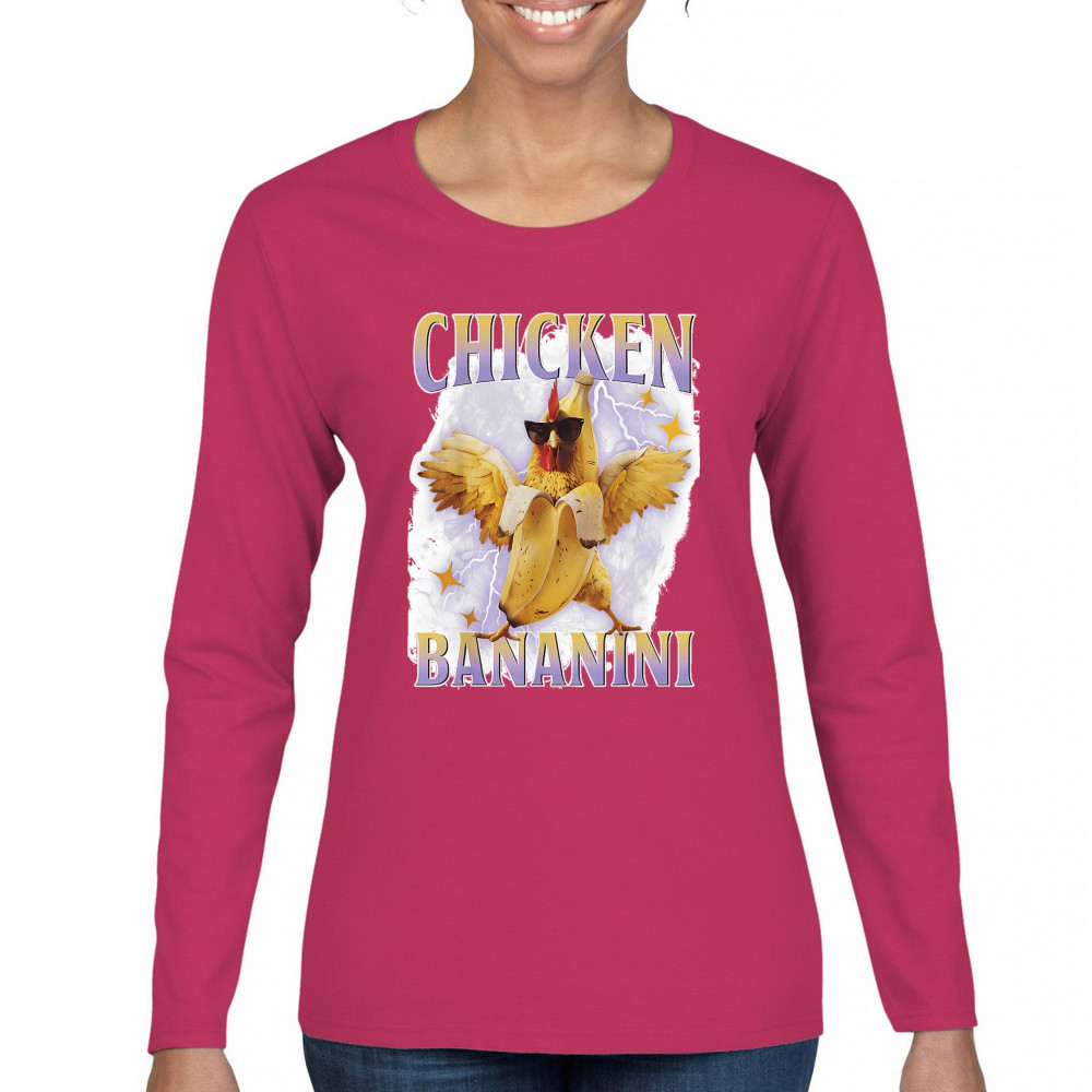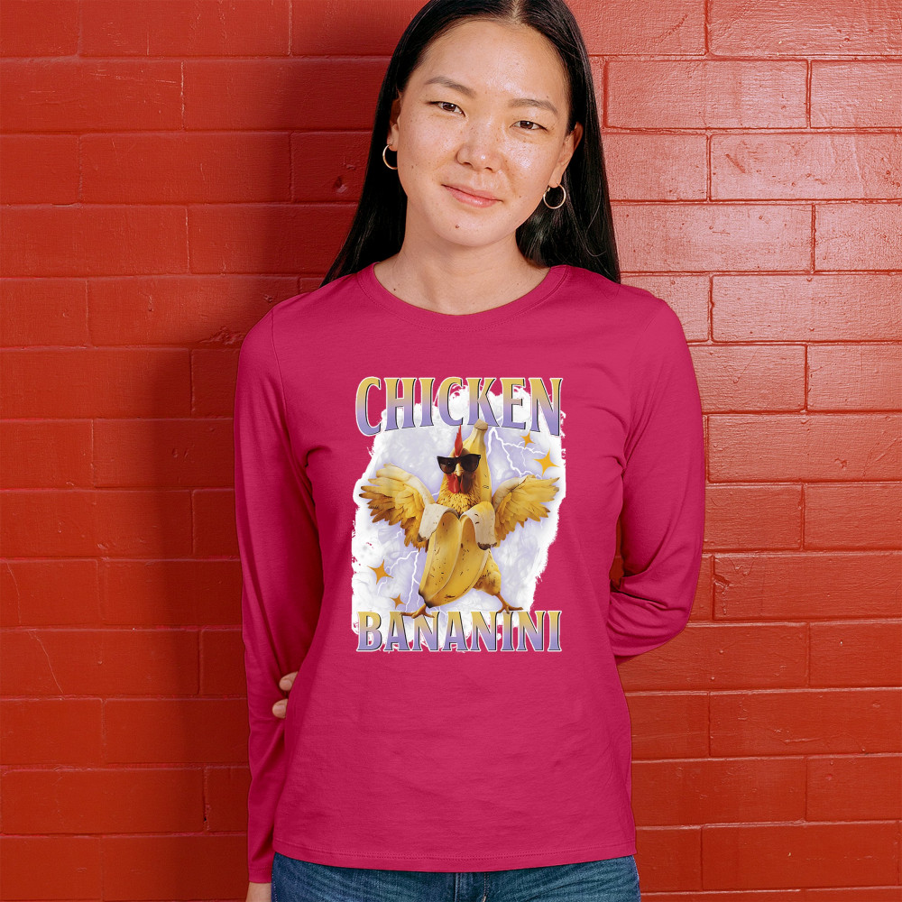 Chicken Bananini is meme absurdity with extra peel. Featuring a chicken emerging from a banana and rocking shades, this design blends cursed-core fashion, viral animal humor, Gen Z brainrot, and TikTok-style chaos. A must-have for fans of ironic mashups, surreal creatures, and internet-fueled nonsense.
