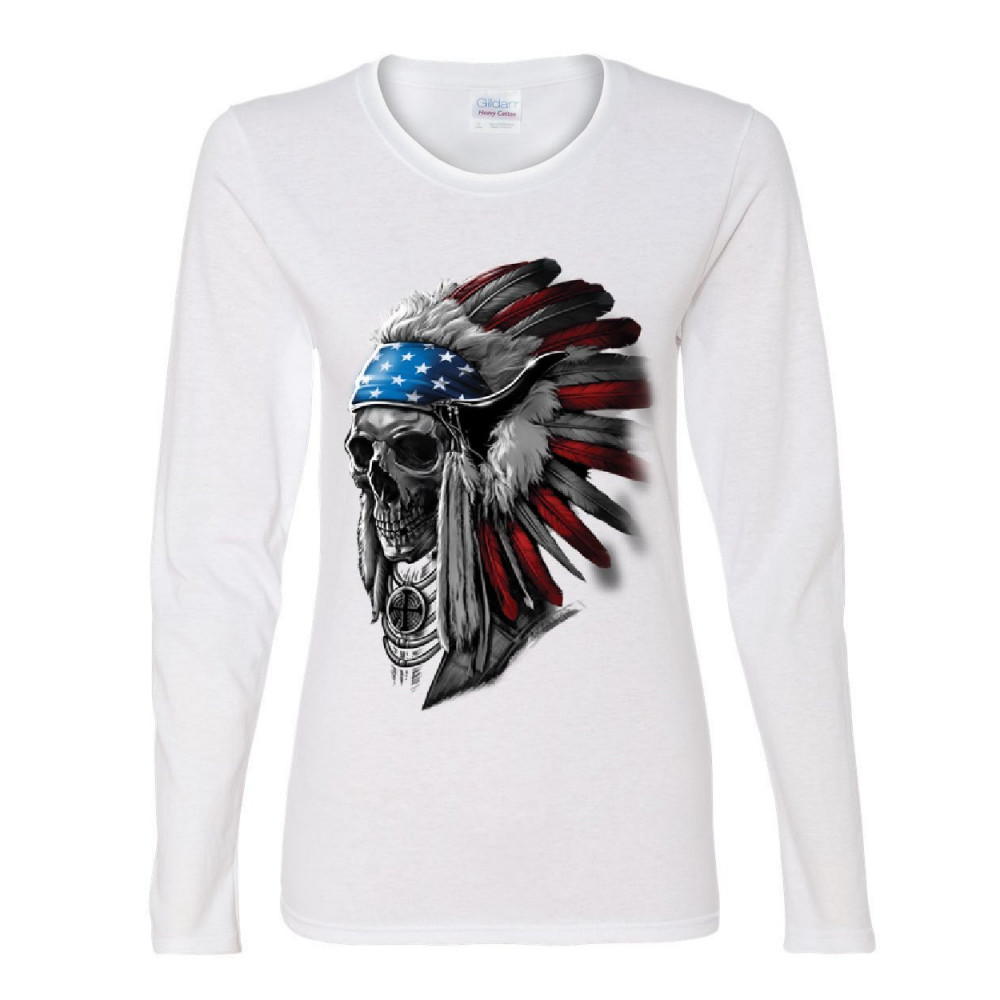 CHIEF SKULL HEADRESS women's long sleeve tee native american stars and stripes white