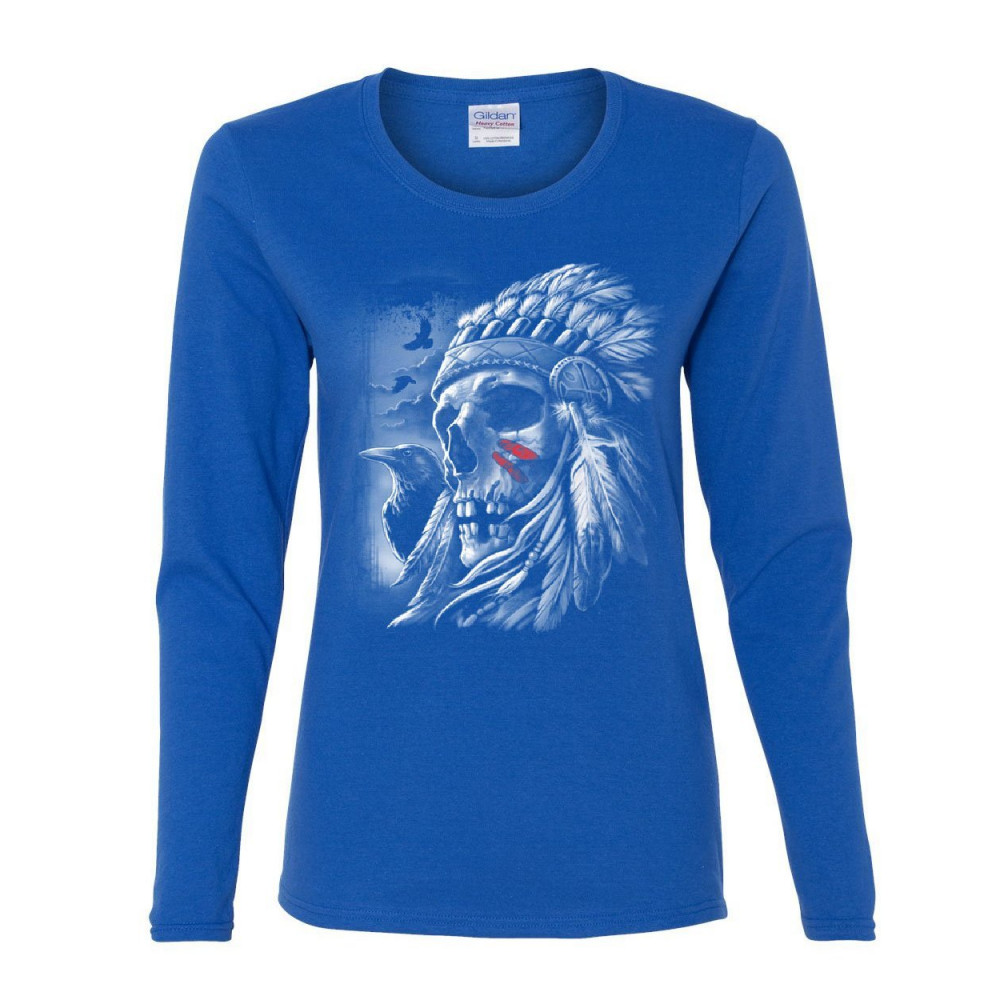 CHIEF SKULL WARBONNET HEADDRESS women's long sleeve tee native american heritage royal blue