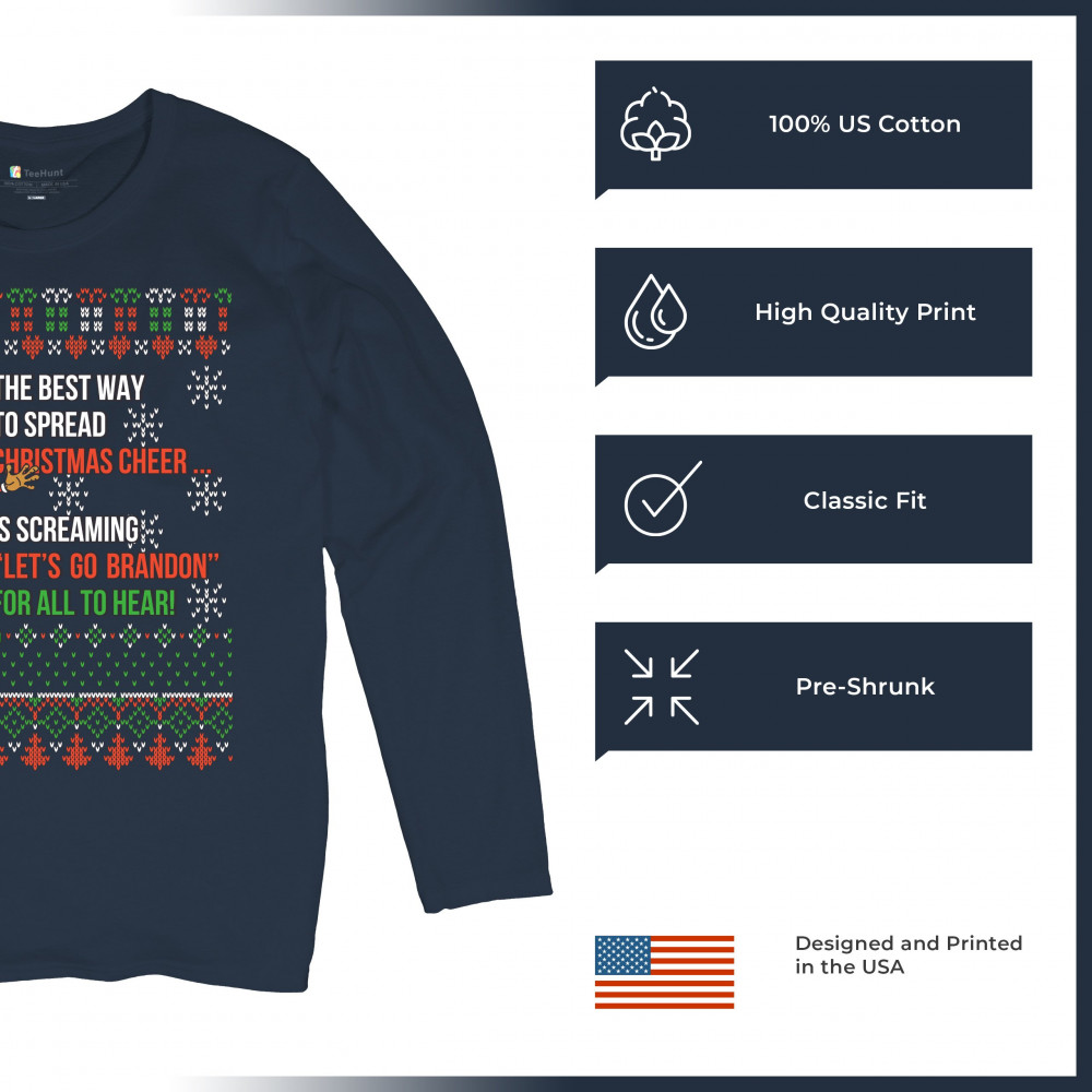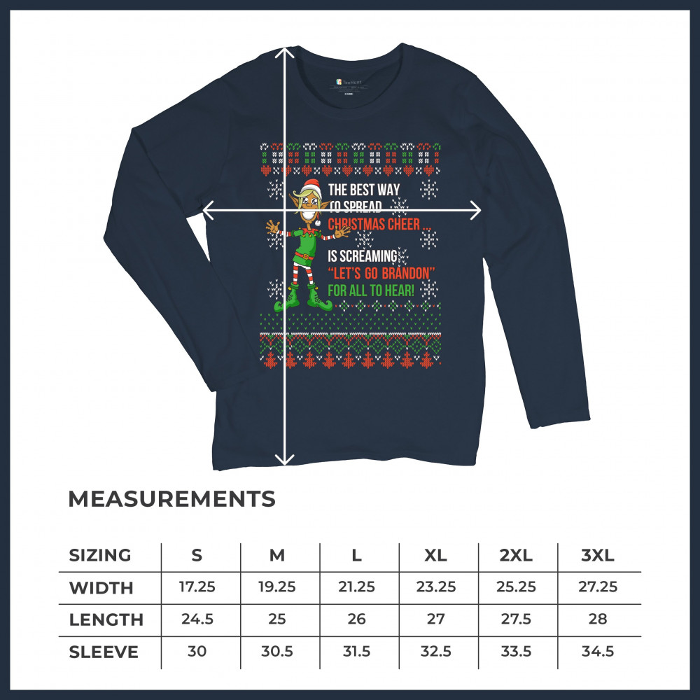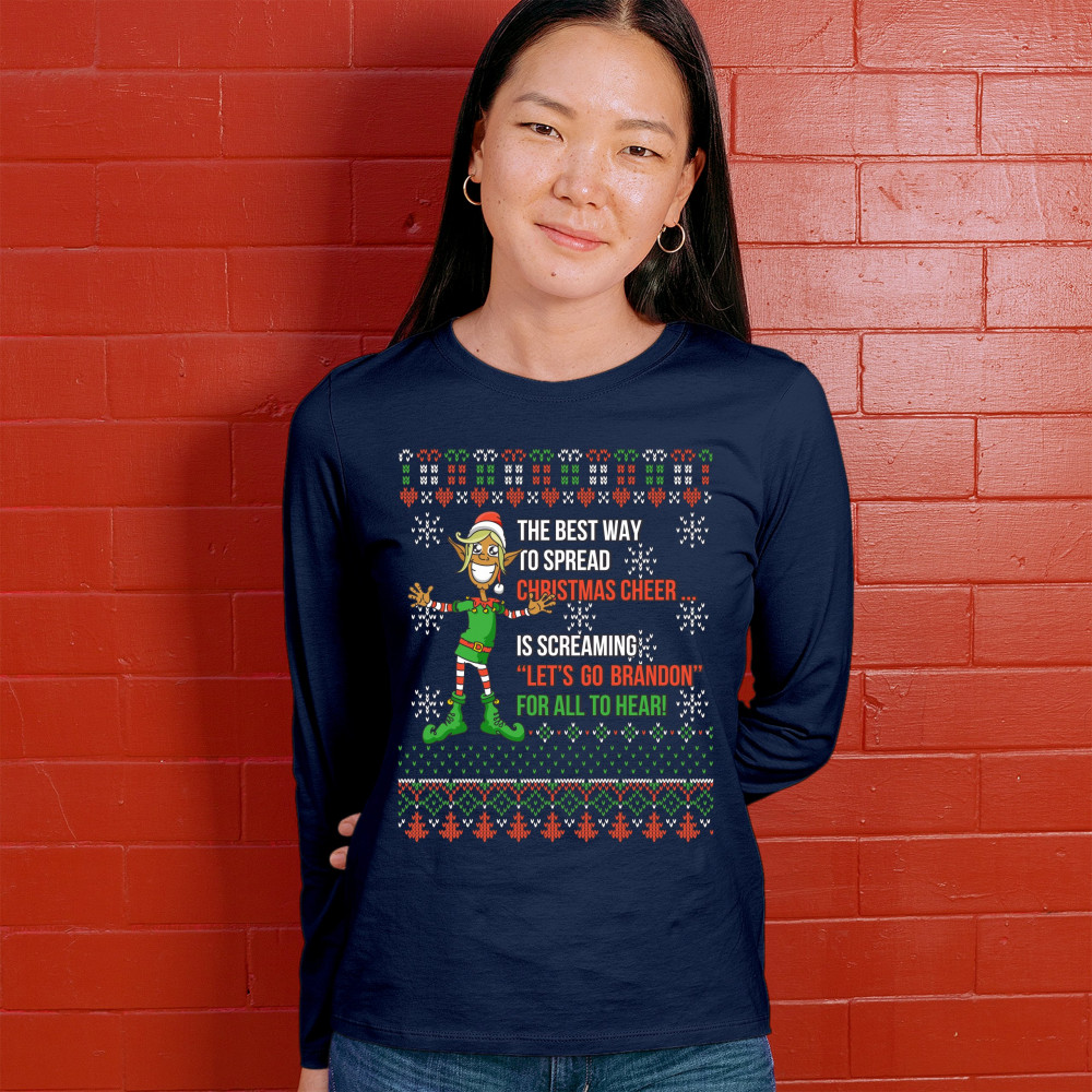 A funny print saying: "The Best Way to Spread Christmas Cheer Is Screaming Let's Go Brandon for All to Hear" and featuring a smiling elf. The print is decorated as a Christmas ugly Sweater. A great choice to wear for a Christmas or New Year's Eve party an