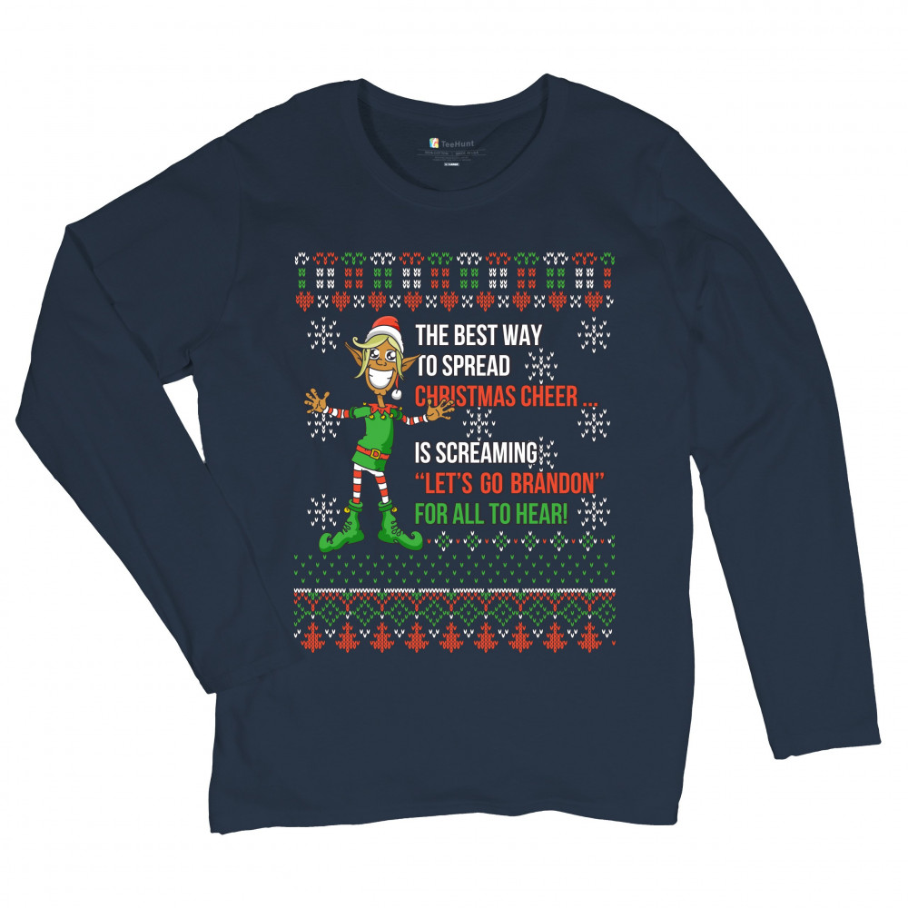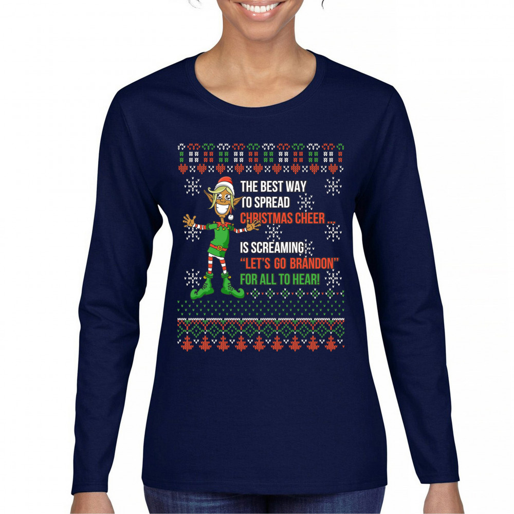 CHRISTMAS CHEER LET'S GO BRANDON women's long sleeve t-shirt ugly sweater xmas navy blue