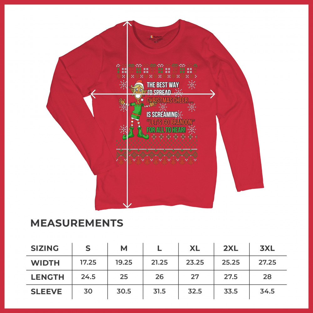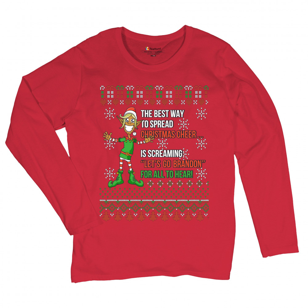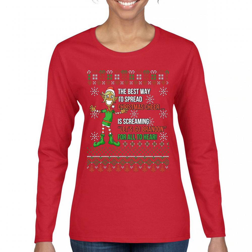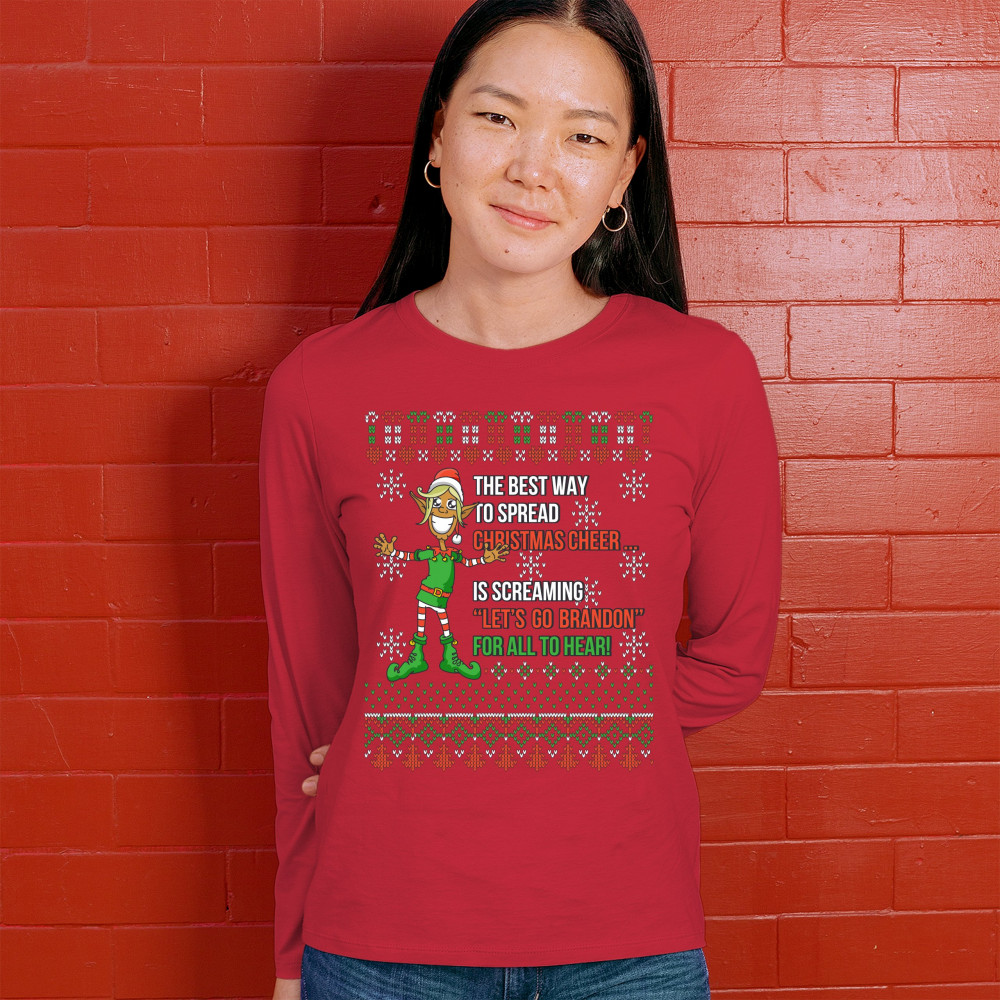 A funny print saying: "The Best Way to Spread Christmas Cheer Is Screaming Let's Go Brandon for All to Hear" and featuring a smiling elf. The print is decorated as a Christmas ugly Sweater. A great choice to wear for a Christmas or New Year's Eve party an