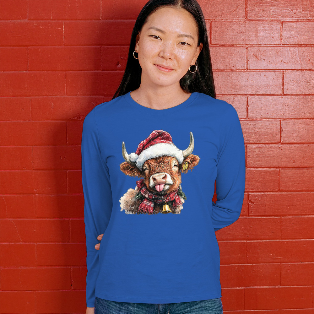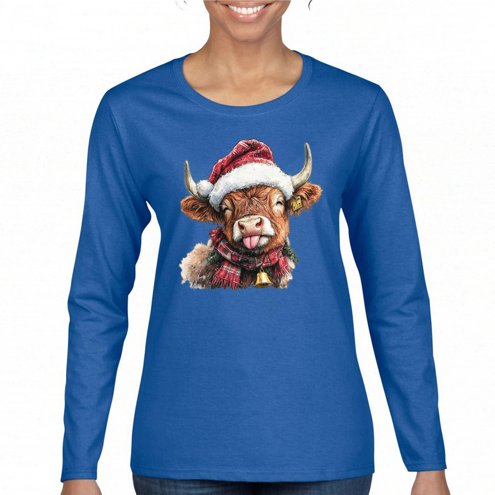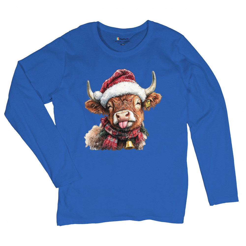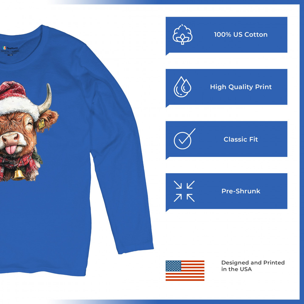 Christmas Highland Cow shirt – rustic holiday design with Santa hat cow, farmhouse holiday humor, country Christmas vibes, and festive livestock art.