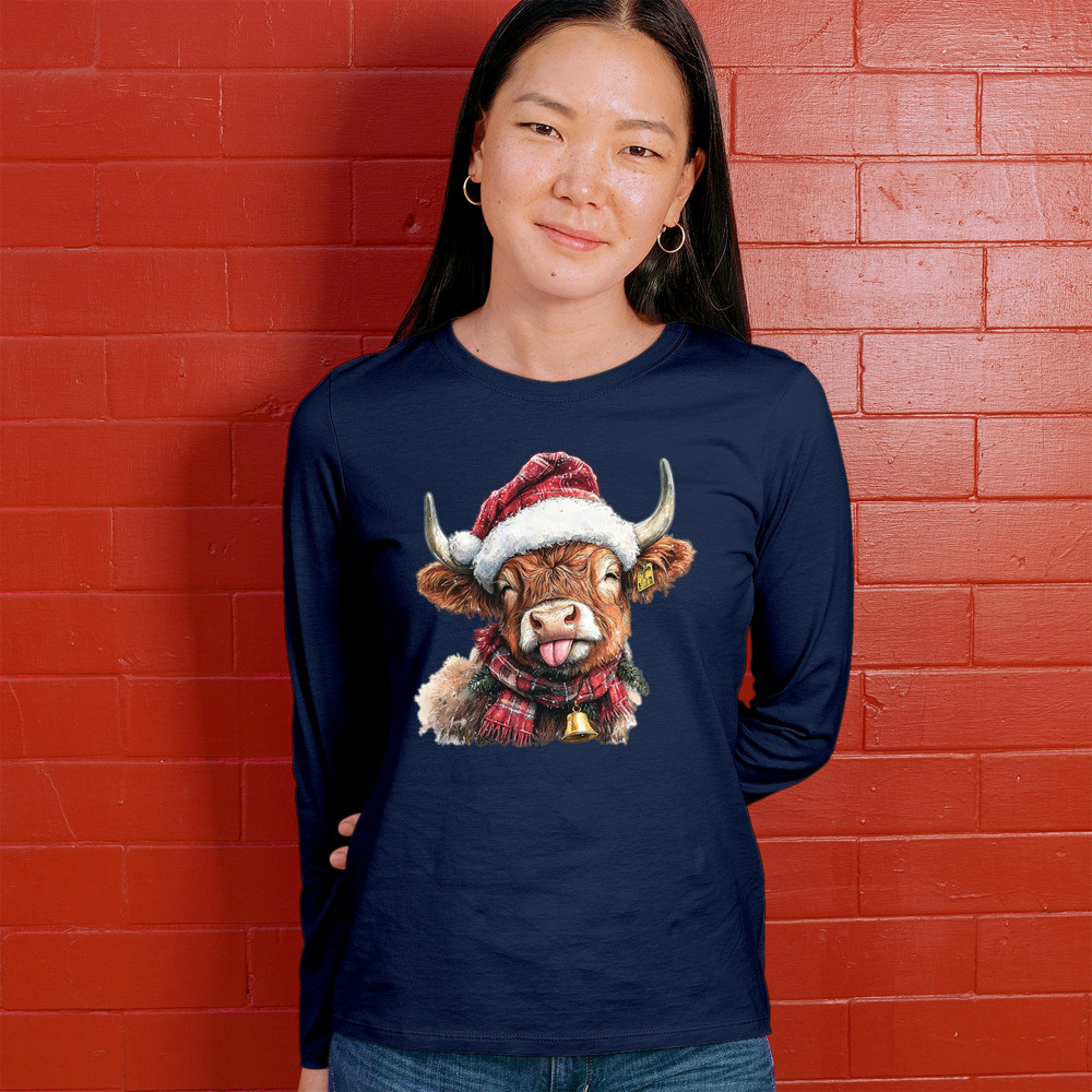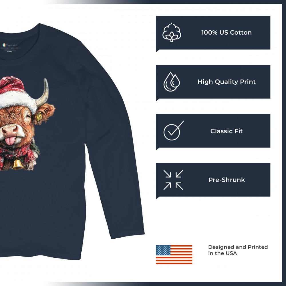 Christmas Highland Cow shirt – rustic holiday design with Santa hat cow, farmhouse holiday humor, country Christmas vibes, and festive livestock art.