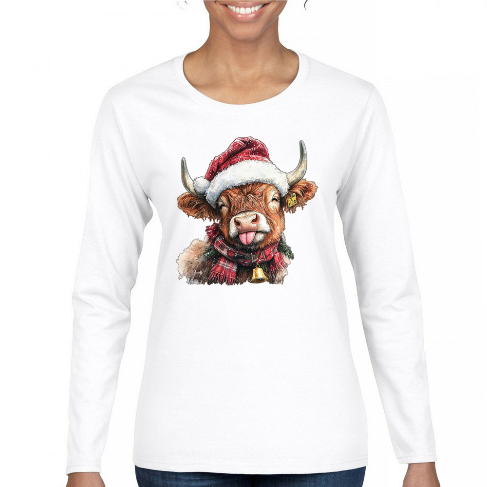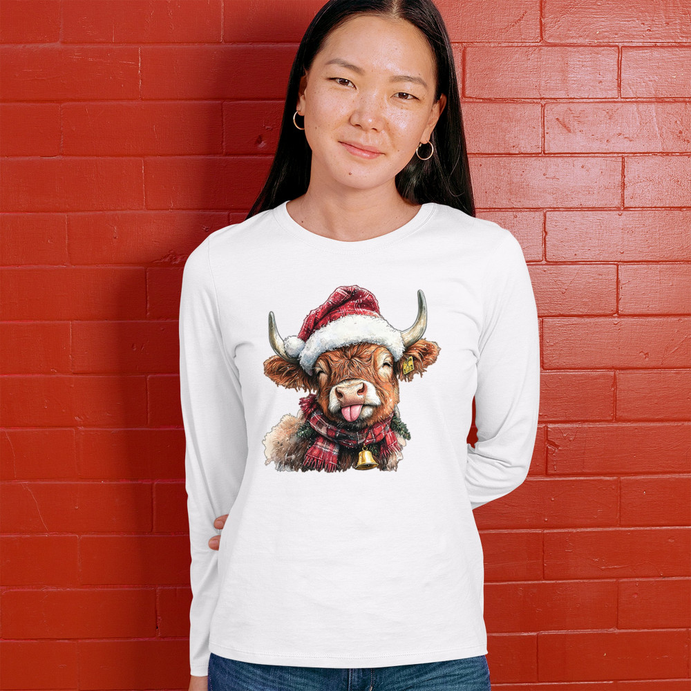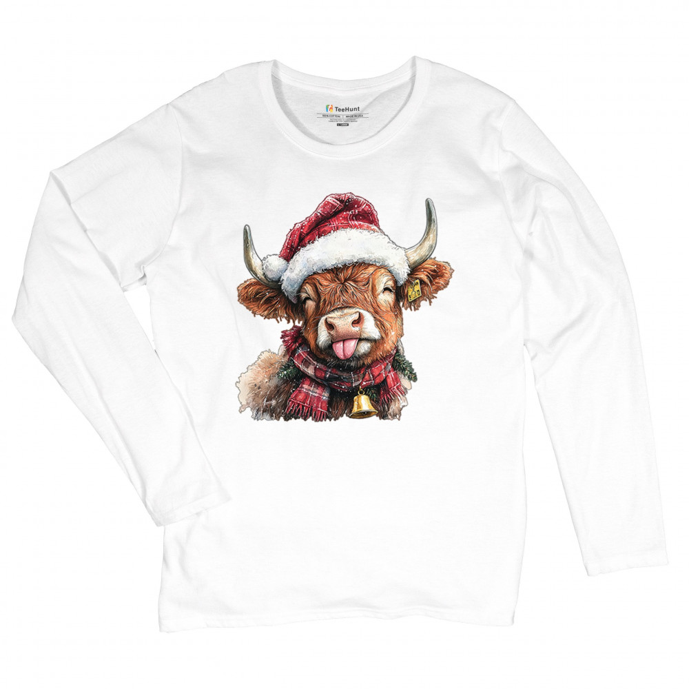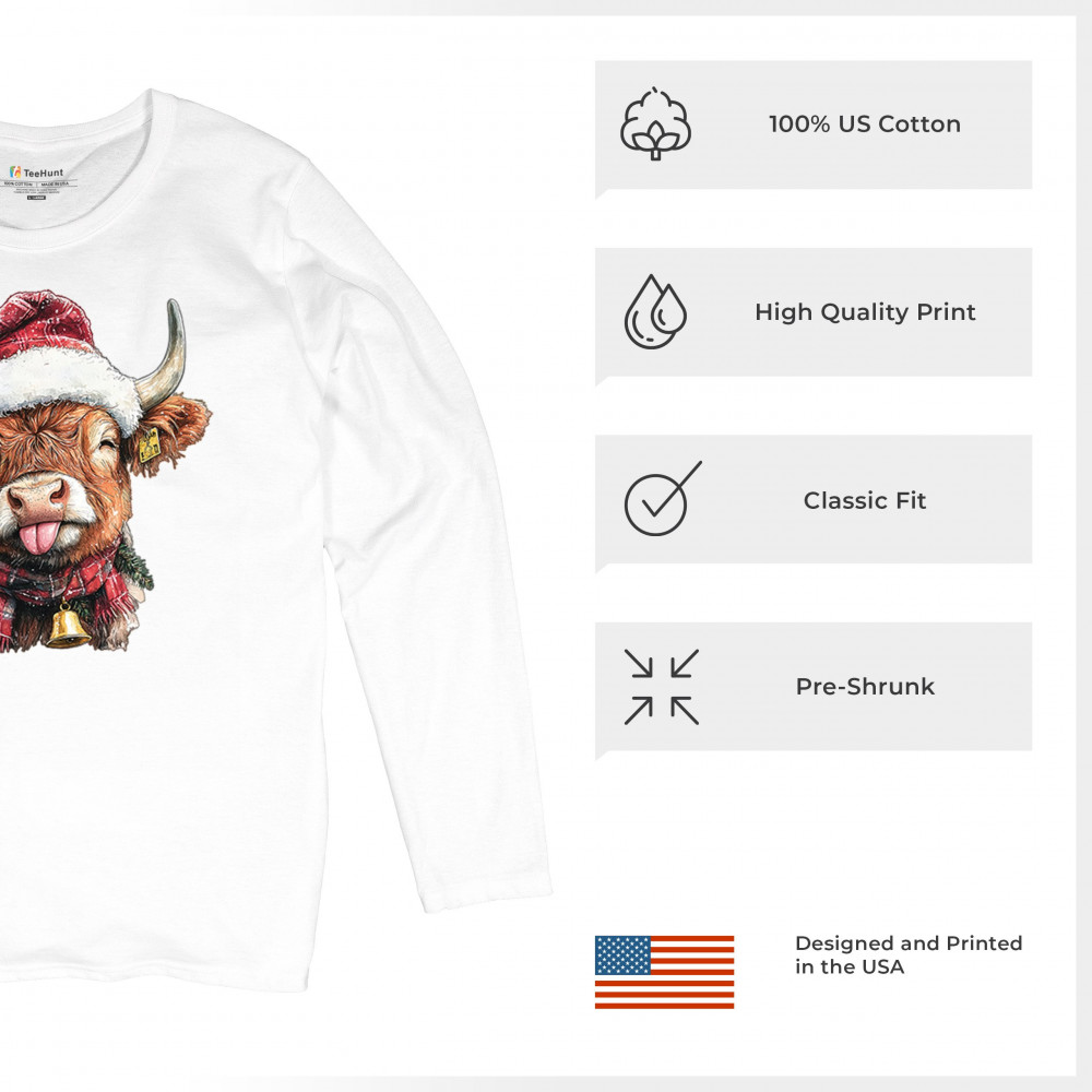 Christmas Highland Cow shirt – rustic holiday design with Santa hat cow, farmhouse holiday humor, country Christmas vibes, and festive livestock art.