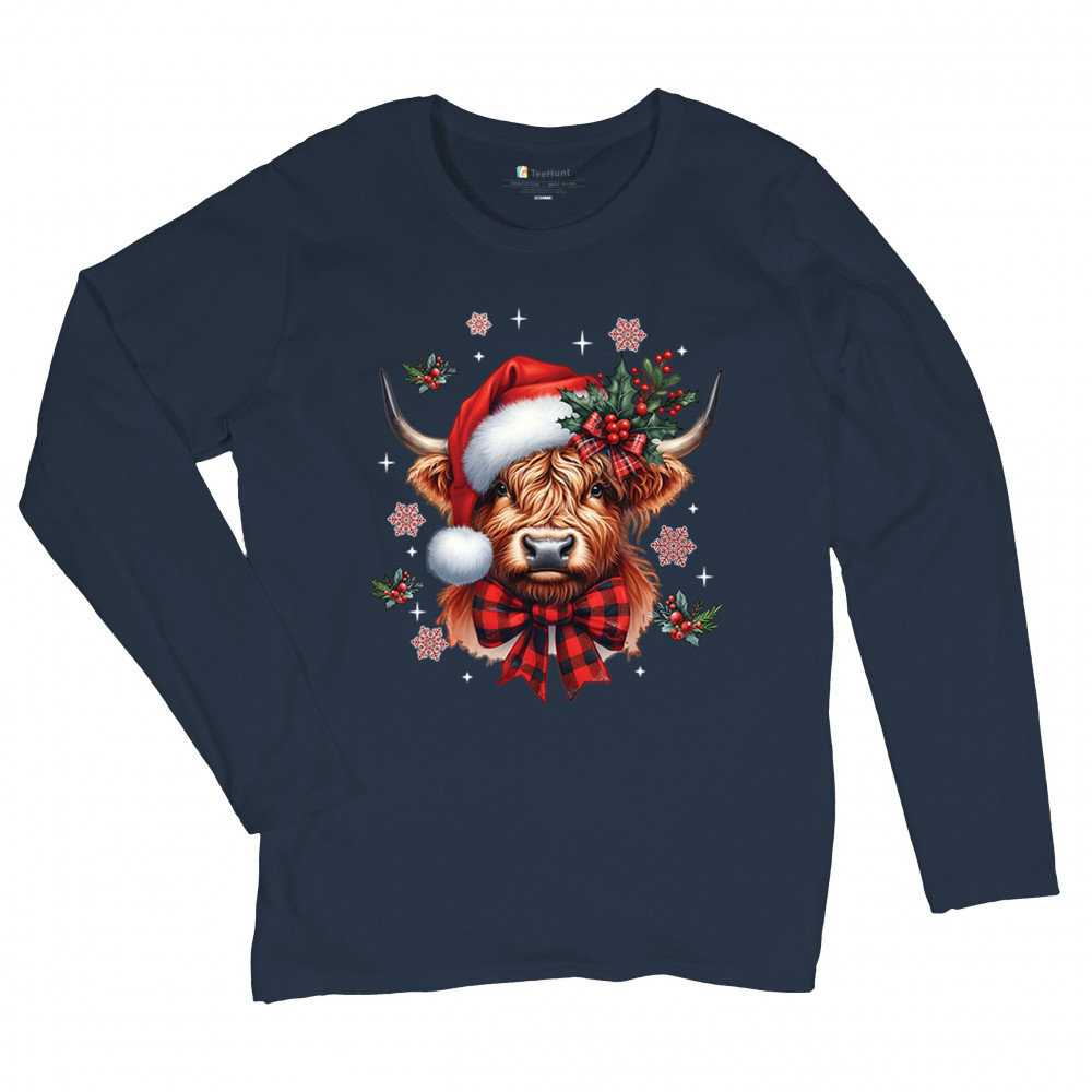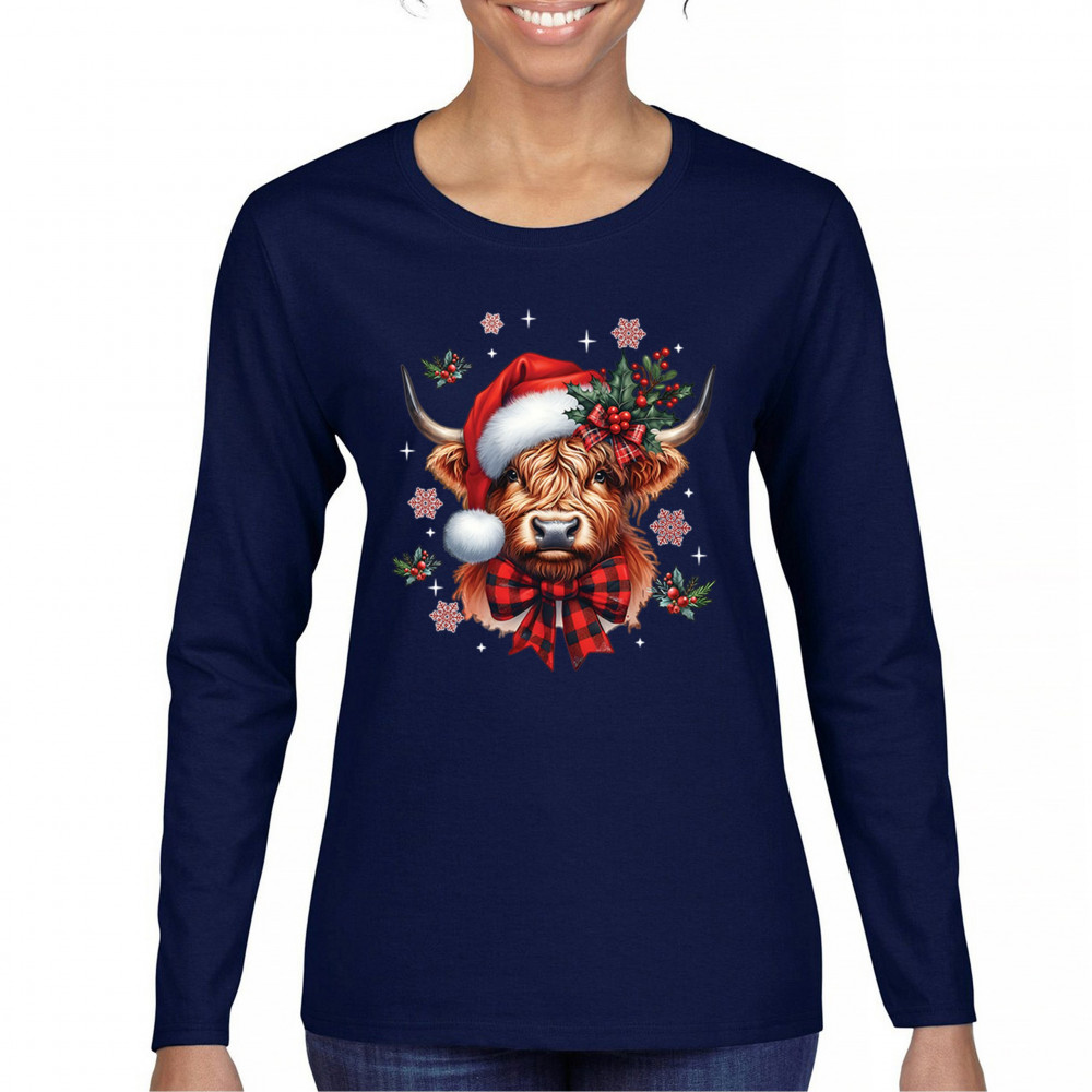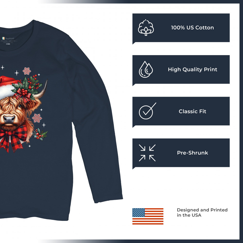 Festive Highland cow Christmas design with Santa hat, plaid bow, holly, and rustic farmhouse holiday charm. Perfect for cozy winter decor.