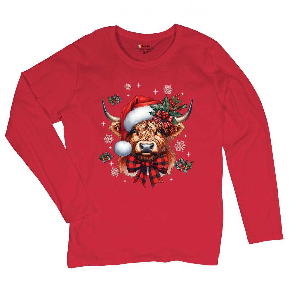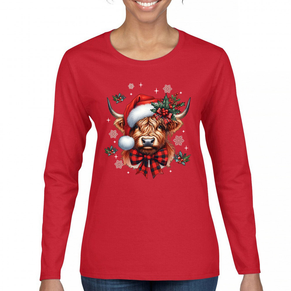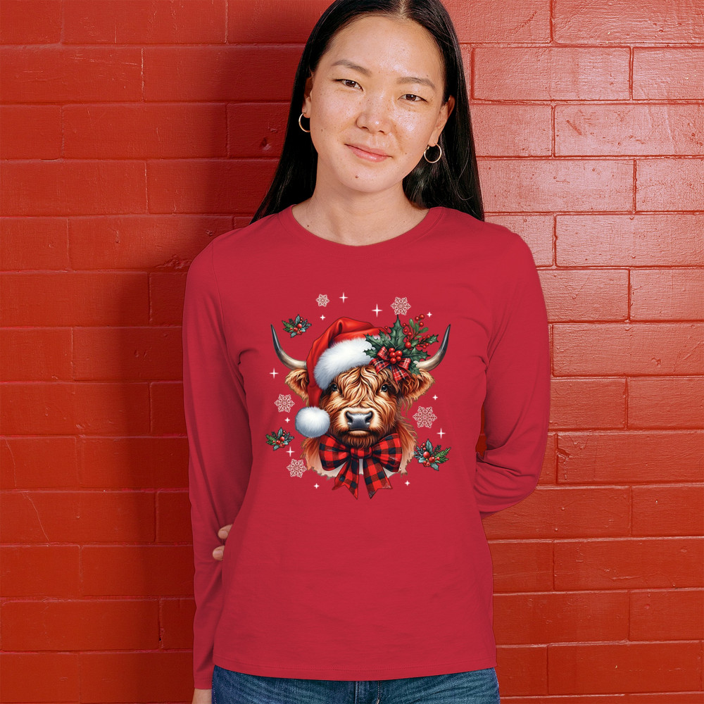 Festive Highland cow Christmas design with Santa hat, plaid bow, holly, and rustic farmhouse holiday charm. Perfect for cozy winter decor.