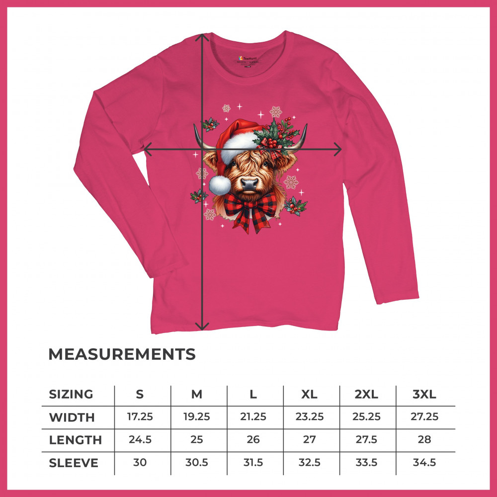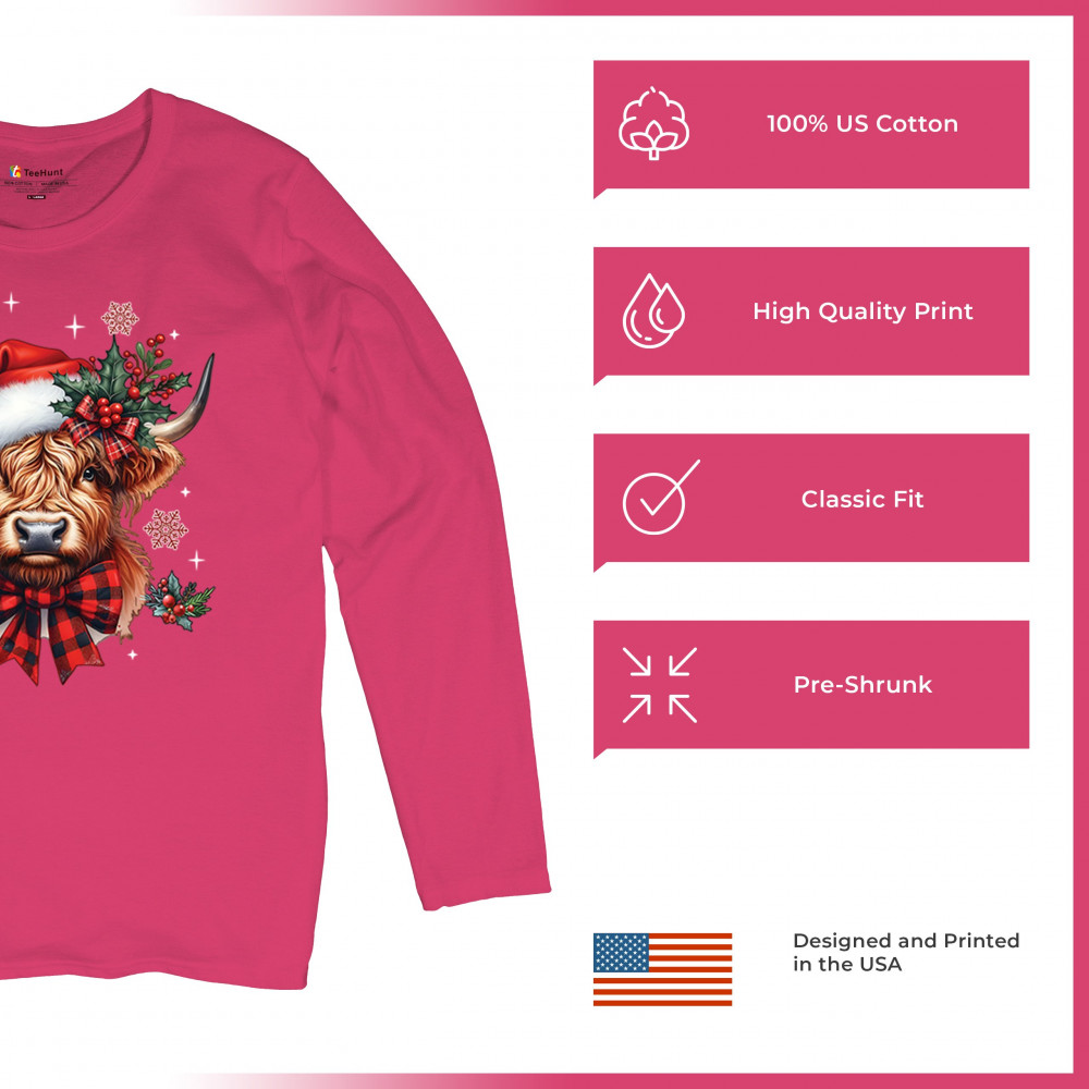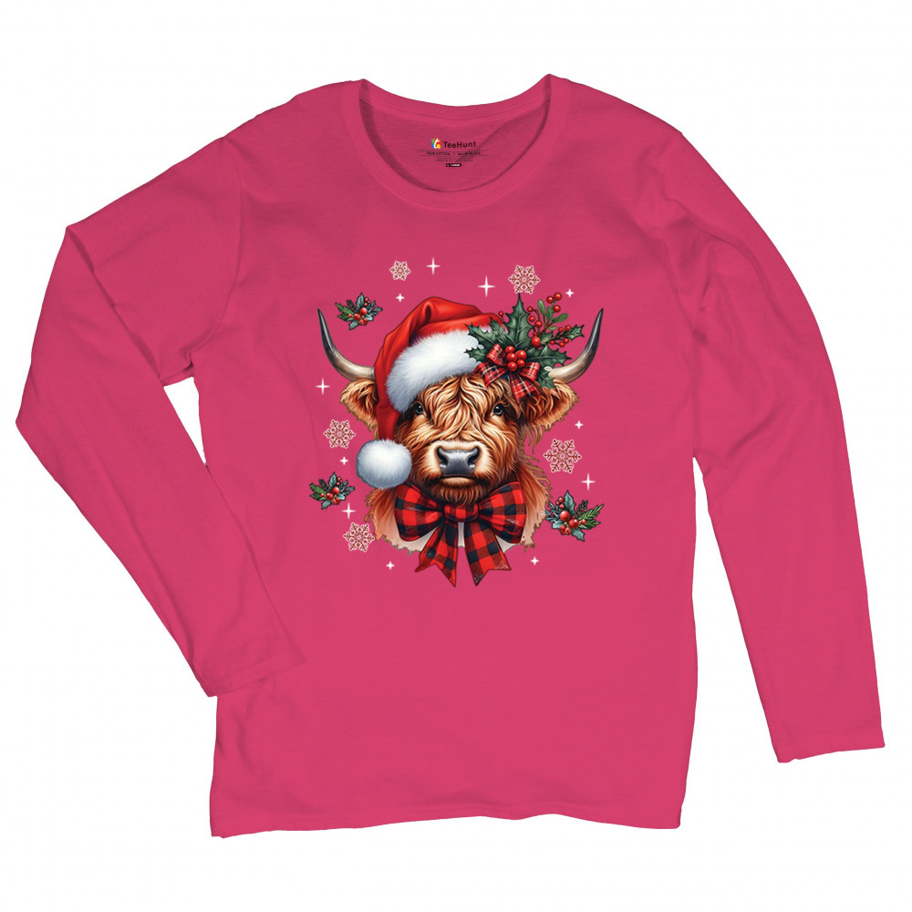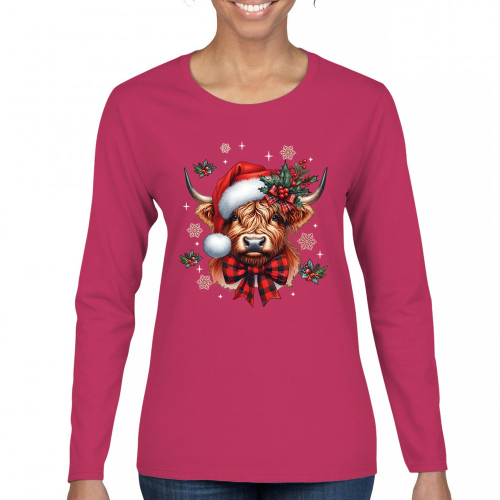 Festive Highland cow Christmas design with Santa hat, plaid bow, holly, and rustic farmhouse holiday charm. Perfect for cozy winter decor.