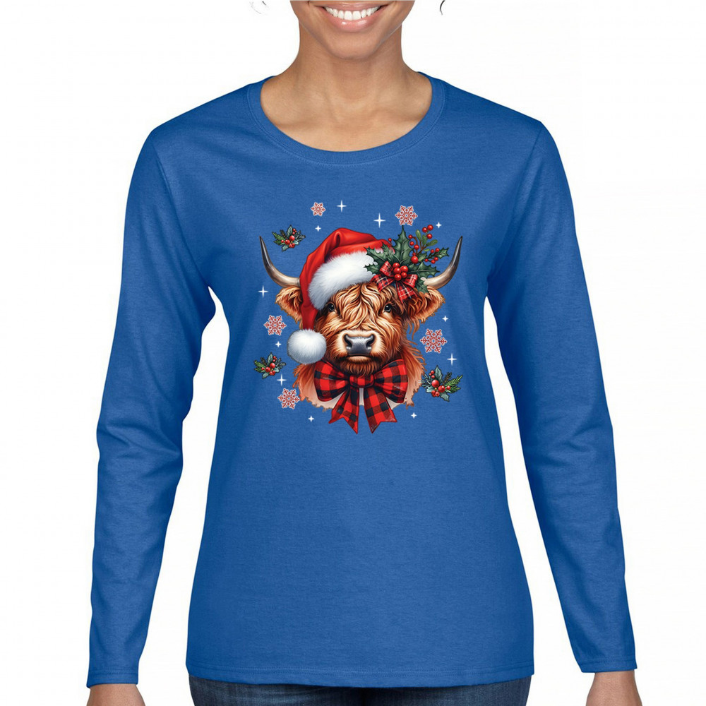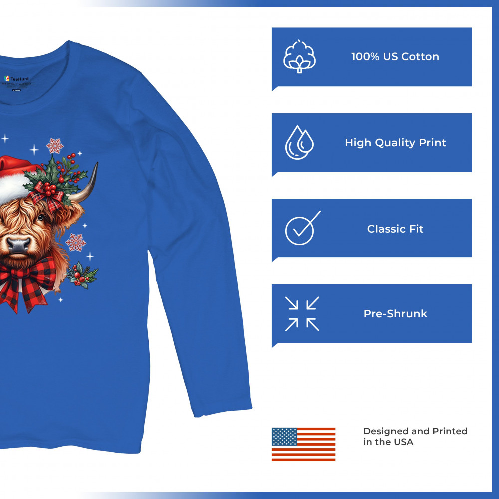 Festive Highland cow Christmas design with Santa hat, plaid bow, holly, and rustic farmhouse holiday charm. Perfect for cozy winter decor.