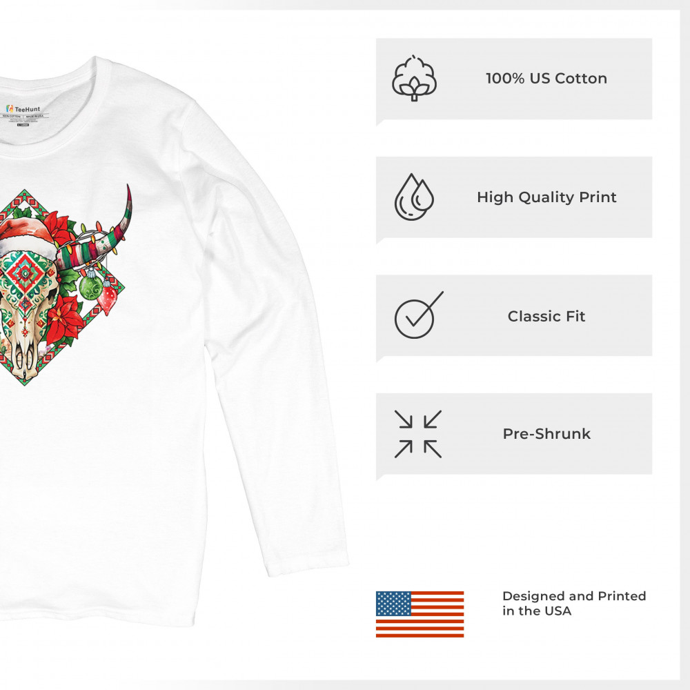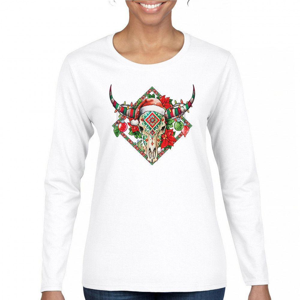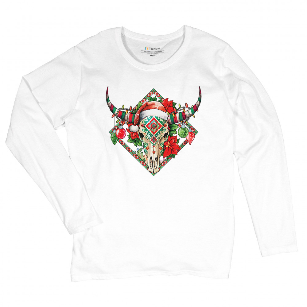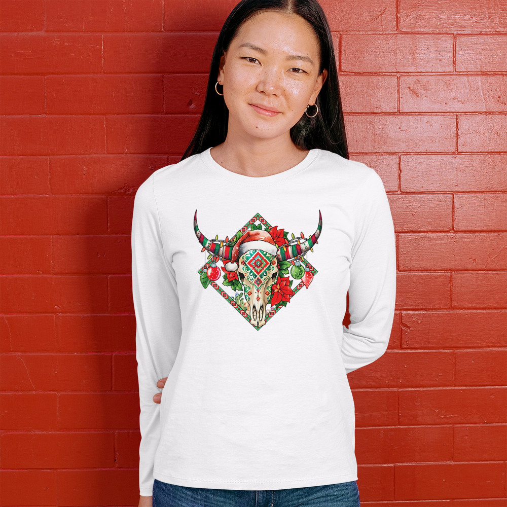 Blend Southwestern charm with holiday cheer! This vibrant skull design with poinsettias and ornaments is perfect for festive parties and unique gifts!