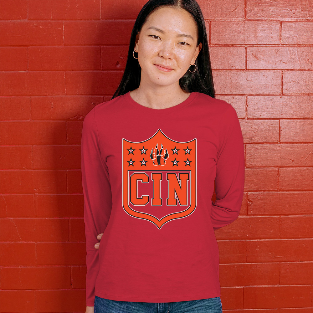 Bold CIN paw shield for Cincinnati football fans. Retro crest style, underdog spirit, and vintage game day gear for true Cincinnati grit.