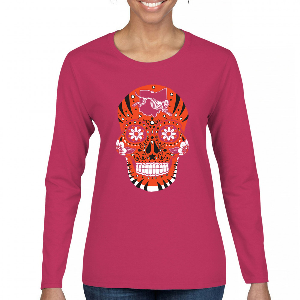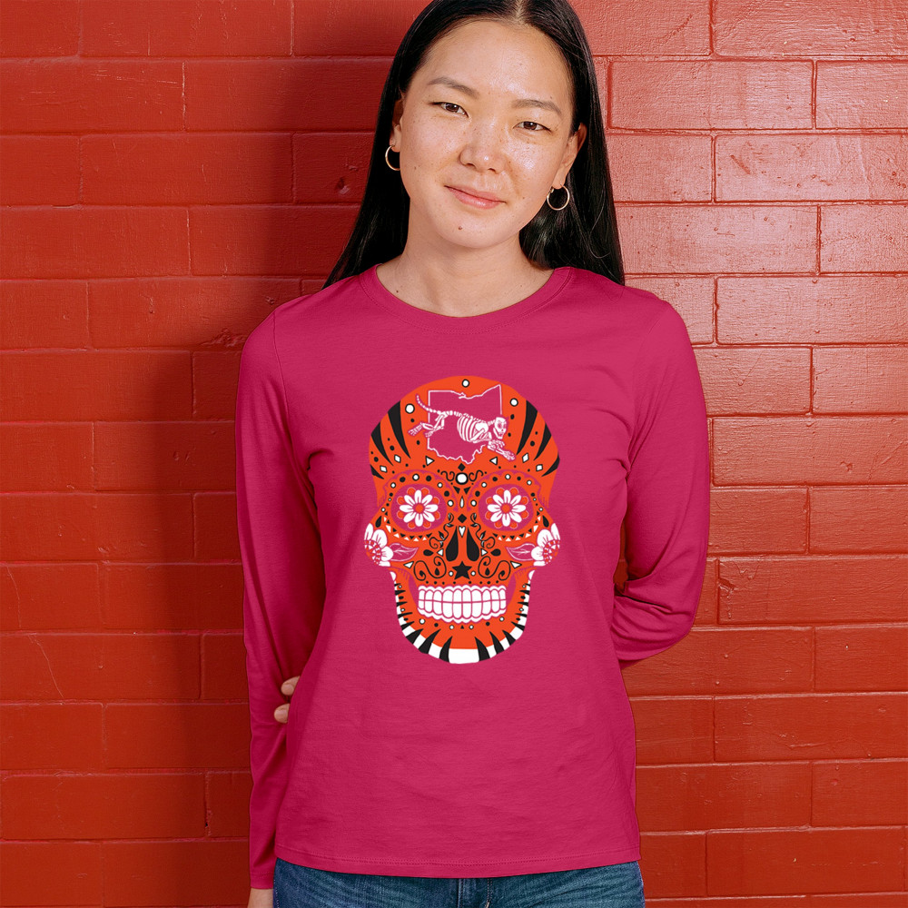 Cinci Sugar Skull with Queen City Paw, underdog grit, black & orange pride, Game Day energy, and playoff vibes.